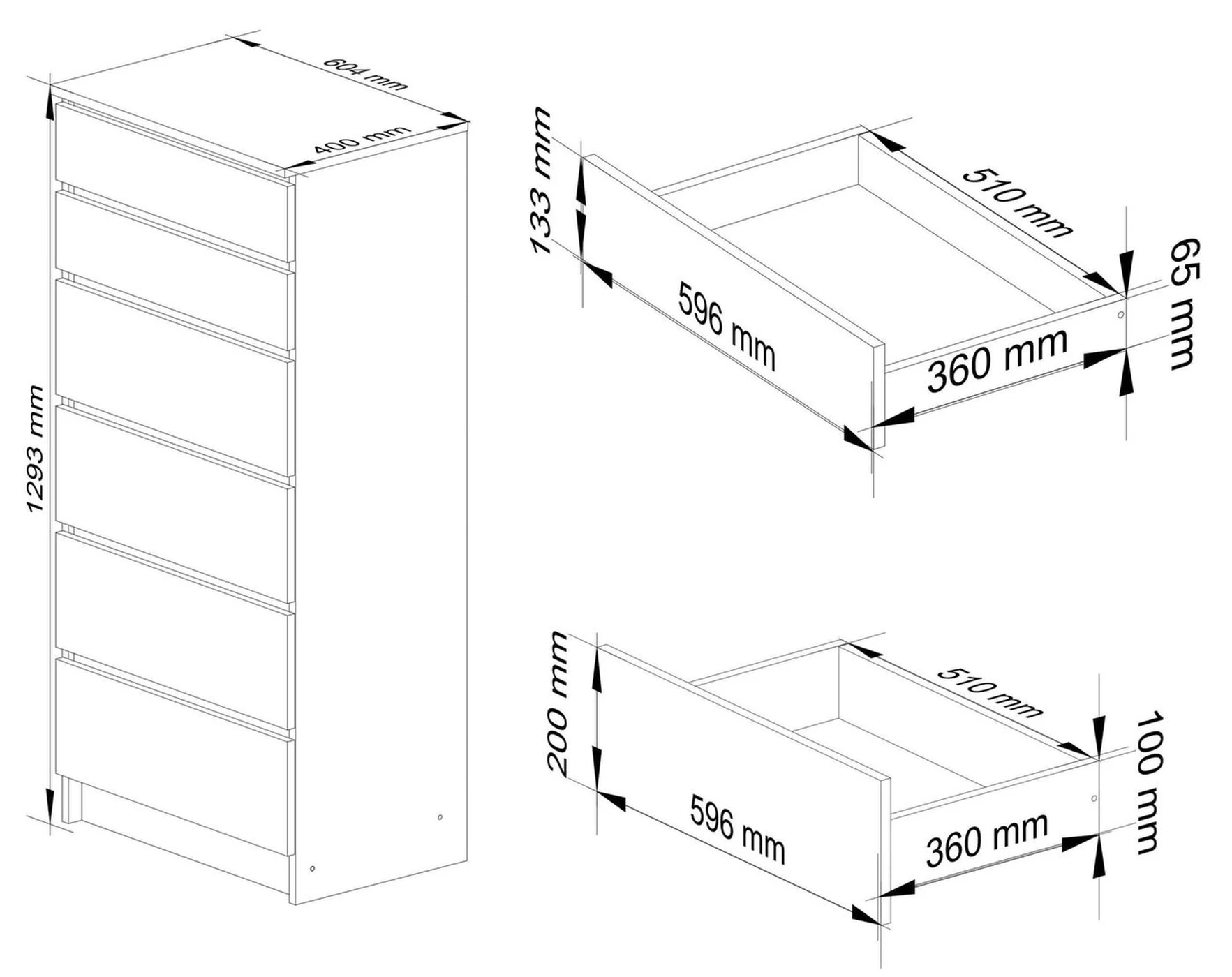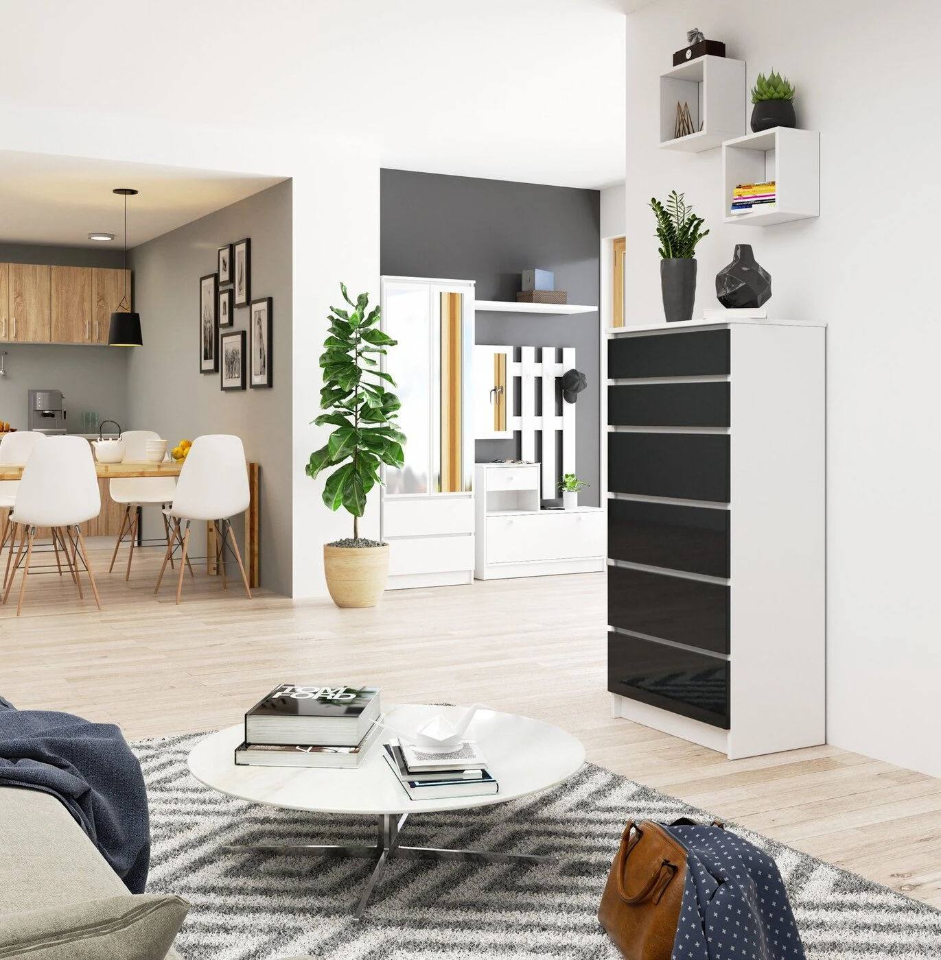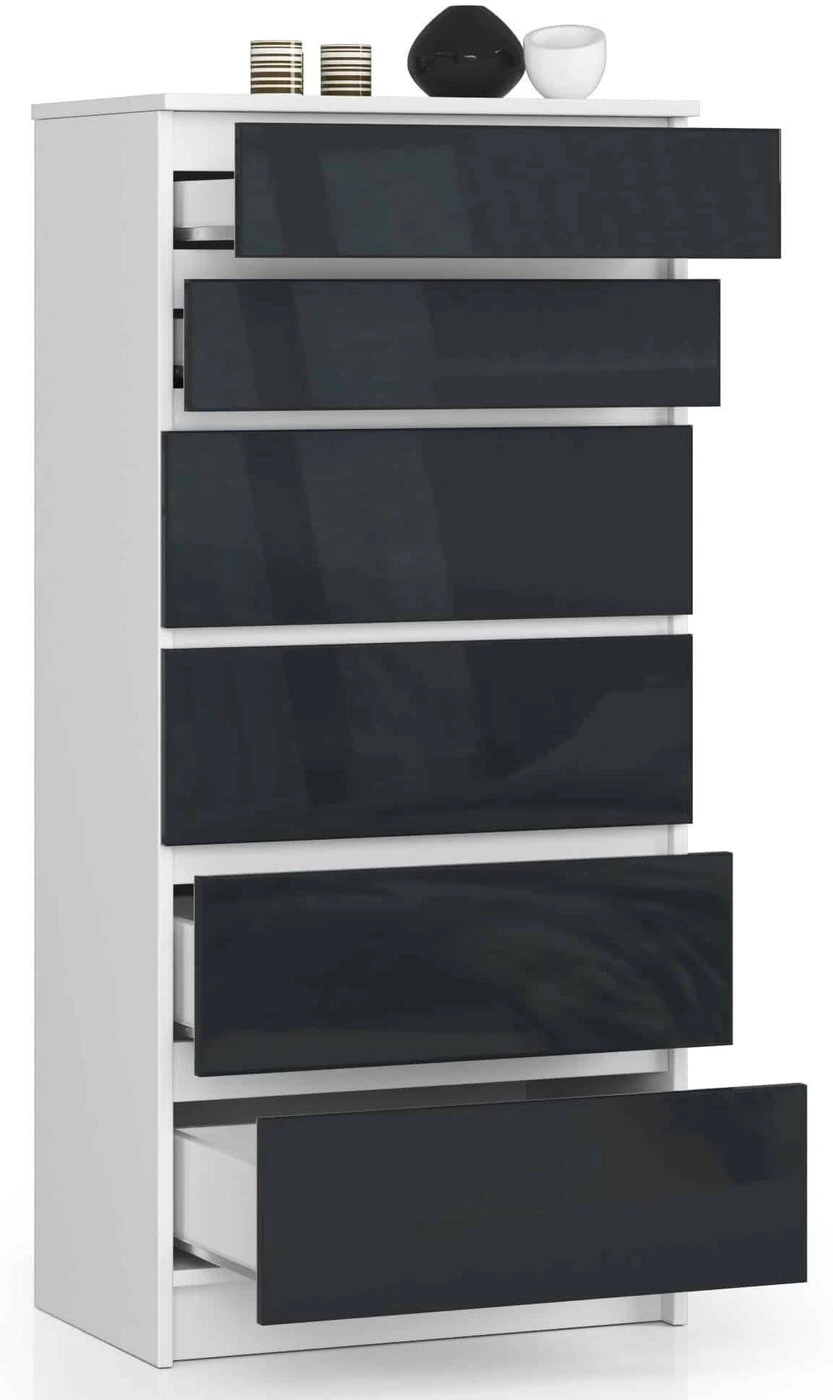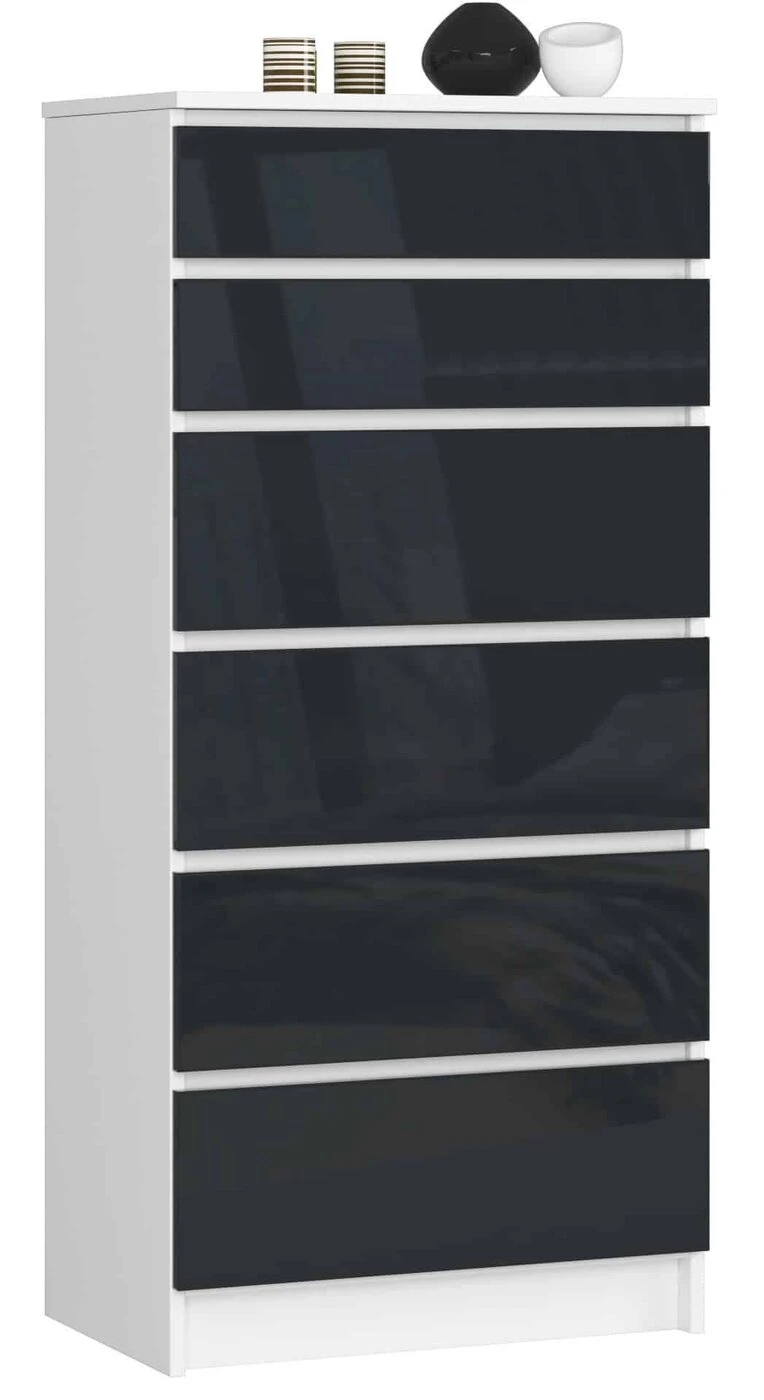 Aprašymas buvo automatiškai išverstas, gali pasitaikyti klaidų. Komodos K – tai funkcionalūs baldai, kurie puikiai tiks svetainėse, miegamuosiuose, prieškambariuose, taip pat biuro darbui įrengtoje erdvėje namuose ar bute. Dėl blizgios baltos apmušalų spalvos ir šešių grafito stalčių jis subtiliai įsilies į tam tikrą kambarį. Jis taip pat yra daugiafunkcis – jame patogiai galėsite laikyti drabužius, apatinius ar dokumentus. Negana to, ant jos galima dėti įvairių dekoracijų, pavyzdžiui, gėlių vazonuose ar vazone, ar šeimos suvenyrų, nuotraukų. Komodos matmenys 596 mm x 1293 mm x 360 mm ( plotis / aukštis / ilgis). Svarbu tai, kad du viršutiniai stalčiai yra žemesni (133 mm) nei kiti keturi (200 mm). Šio sprendimo dėka į viršutinius stalčius galime sutalpinti daiktus, kuriuos reikia dažniau išimti. Nes mažesnį stalčių lengviau ir lengviau perkelti. Stalčiai turi užrakinimo funkciją, todėl juos naudoti saugu. Komoda K sveria 48 kg. Taigi, iškilus poreikiui, galima nesunkiai perkelti į kitą vietą gyvenamojoje erdvėje. - Komoda iš trinčiai atsparios laminuotos plokštės - Fasadai iš 19mm MDF AKRILINIO GRAFITO Blizgesys - Stalčiai juda ant metalinių ritinėlių kreiptuvų - Stalviršis, šonai ir fasadai padengti ABS briauna - Spintelės funkcionalumą užtikrina dviejų dydžių fasadai - du viršutiniai mažesni, o apatiniai yra didesni - Komoda, skirta savarankiškai surinkti - Instrukcija pridedama - Garantija 24 mėn.
