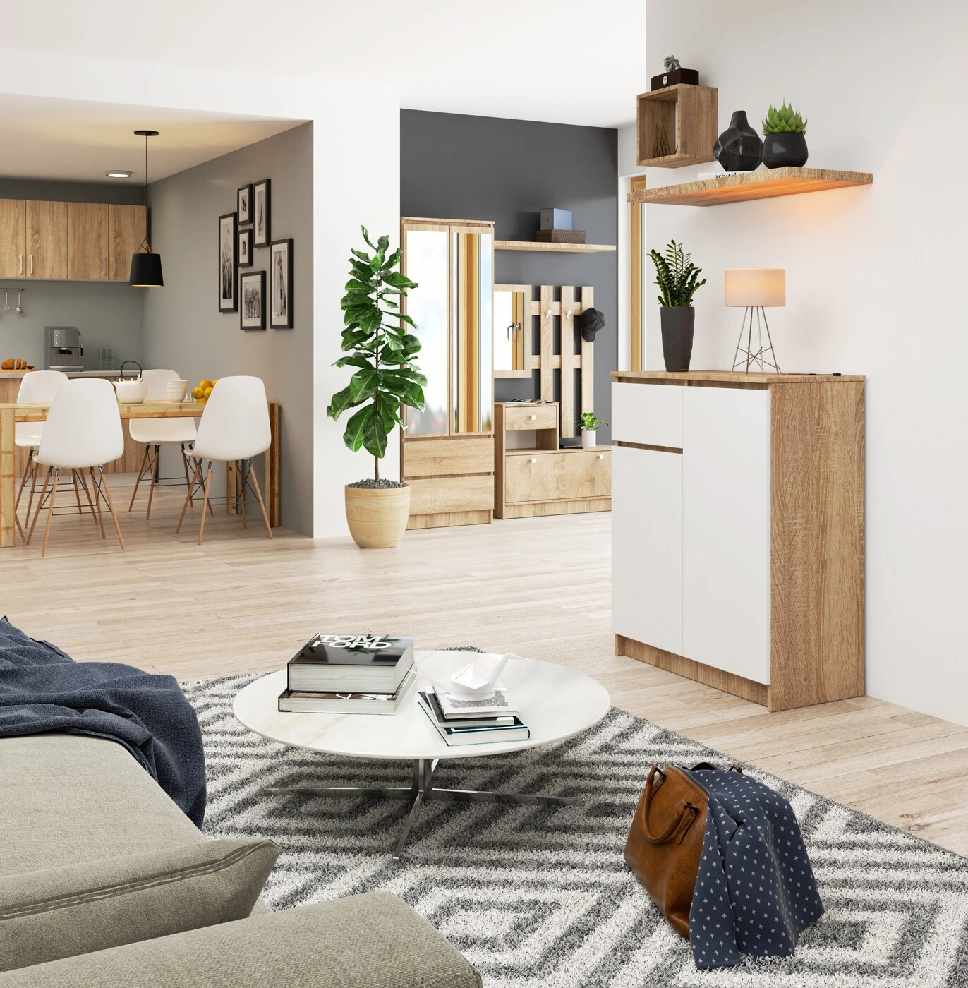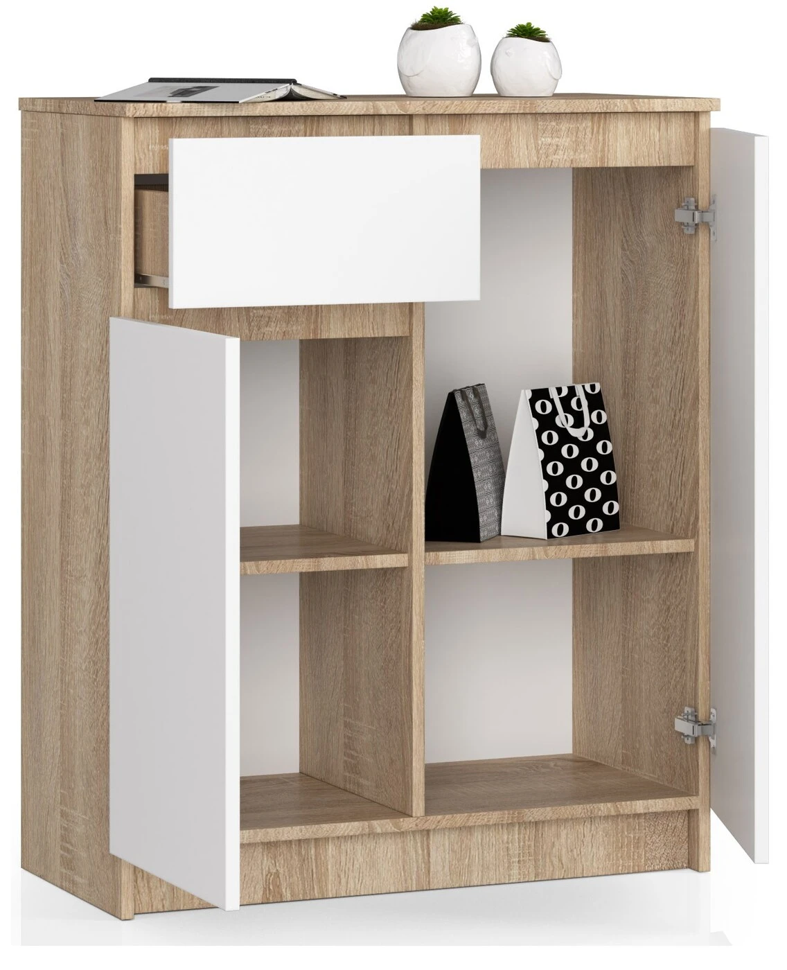 Aprašymas buvo automatiškai išverstas, gali pasitaikyti klaidų. Maža komoda yra įrangos elementas, kuris bus naudojamas bet kurioje patalpoje. Ryškios spalvos, solidi konstrukcija ir kruopštus darbas leido sukurti spintą, kuri tiks, pavyzdžiui, prieškambaryje, svetainėje ar jaunimo kambaryje, taip pat miegamajame. Jis taip pat gali būti naudojamas biuro patalpoje, kur bus galima laikyti daugybę dokumentų ir kitų biuro reikmenų. Komoda susideda iš dviejų uždarų spintelių (kiekvienoje su dviem lentynomis) ir stalčių. Balduose dera madingos spalvos – balta ir sonoma ąžuolas. Komoda – tai baldas iš kokybiškos laminuotos plokštės su 16 milimetrų storio; kaitlentė Kronospan yra labai atspari trinčiai; Spintelių ir stalčių fasadai pagaminti iš patvarios laminuotos plokštės; stalčius juda ant metalinių ritinėlių kreiptuvų; Kraštai padengti ABS apvadu. Ji užtikrina aukštą apsaugą pažeidimo atveju; Komoda skirta montuoti savarankiškai, o instrukcijos yra pakuotėje; Gaminio garantija yra dvidešimt keturi mėnesiai . Komoda K 80 cm. gali būti laisvai derinamas su kitais baldais, pavyzdžiui, mažesnėmis ir didesnėmis spintomis, rašomaisiais stalais ar lentynomis, taip pat įtraukta į pasiūlymą. Tai geros kokybės, praktiški baldai už prieinamą kainą. Jų dėka bus galima sukurti šviesią, malonią akiai erdvę su paprastais, bet elegantiškais baldais, kurie puikiai dera prie bet kokio modernaus interjero.
