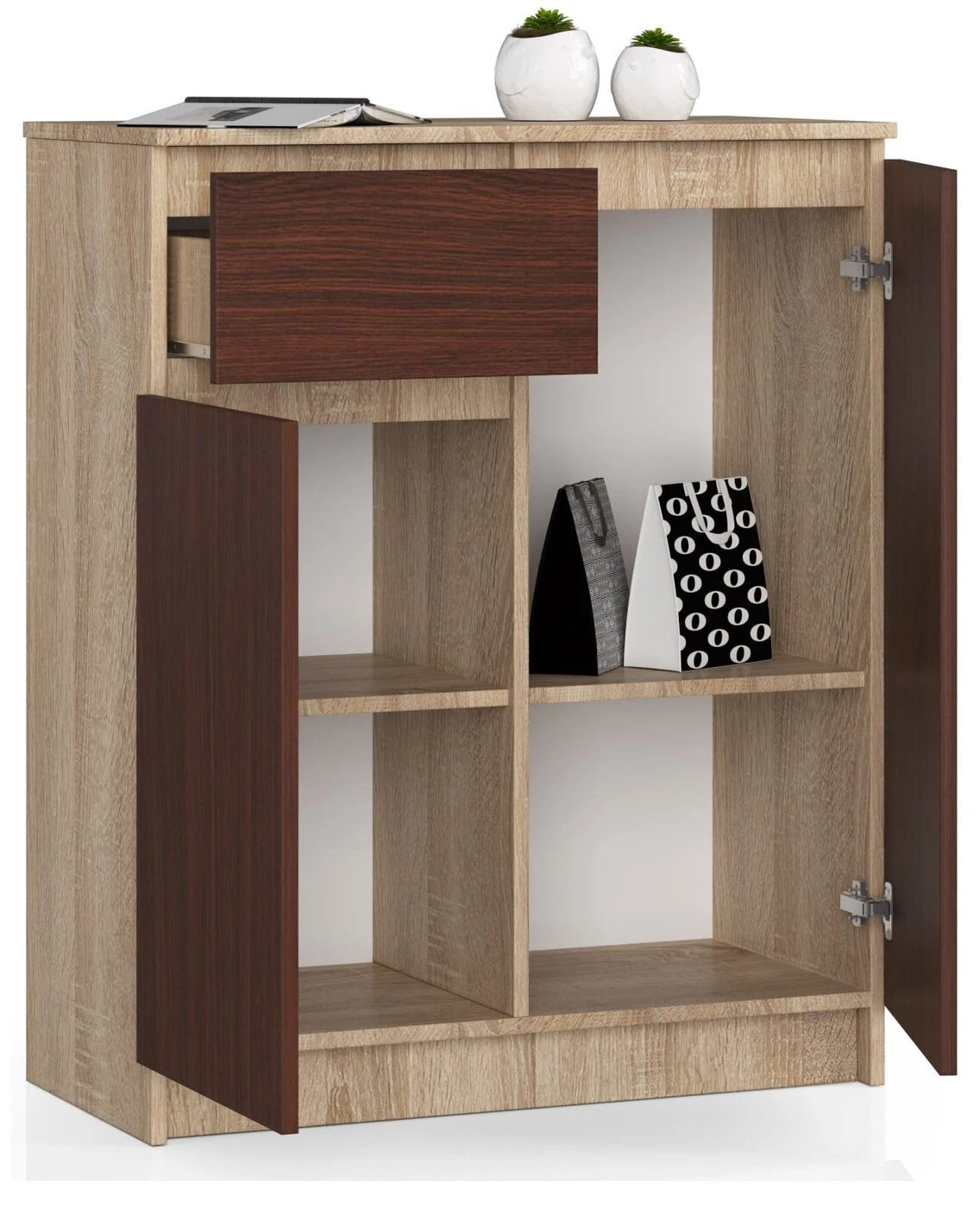 Aprašymas buvo automatiškai išverstas, gali pasitaikyti klaidų. Komoda K 80 su spintelėmis ir stalčiumi pagaminta iš laminuotos, trinčiai atsparios Kronospan baldų plokštės. Komodos korpusas yra sonomos ąžuolo spalvos, o spintelių durelės ir stalčiaus fasadas – kontrastingos tamsios venge medienos spalvos. Dešinėje baldų dalyje, po viršumi, yra vienas stalčius, o apačioje - spintelė su varstomais durimis ir 2 lentynomis. Kairėje komodos pusėje yra antroji spintelė, taip pat su atverčiamomis durelėmis ir 2 lentynomis – čia viršutinėje lentynoje yra daugiau vietos susidėti nei spintelėje po stalčiumi. Spintelės durelės atsidaro į baldo išorę. Komodos K 80 sonoma / wenge pranašumai yra šie: kompaktiški matmenys (80 cm pločio, 99 cm aukščio ir 40 cm gylio); suteikia sandėliavimo vietos įvairovę (uždaros lentynos ir stalčius); apsaugo baldo kraštas su plastikiniu ABS; stalčiaus aprūpinimas metaliniais ritininiais kreiptuvais; dviejų spalvų apdaila, padidinanti išdėstymo galimybes; išlaikant dizainą malonių medienos atspalvių; vykdymas CLP baldų sistemoje – tai leidžia sukomponuoti bet kokį baldų komplektą, pagamintą pagal CLP sistemą; 24 mėnesių gamintojo garantija. li> Sonoma spalvos / venge spalvos komoda K 80 yra nesenstantis ir universalus baldas. Tai leidžia naudoti daugybę galimų programų. Jis tiks ir kaip šifonas miegamajame, ir baldas žaislams laikyti vaikų kambaryje, ir naudinga komoda smulkiems daiktams svetainėje. Jis gali veikti kaip patogi spintelė prieškambaryje, taip pat gali būti valgomajame būtinų priedų.