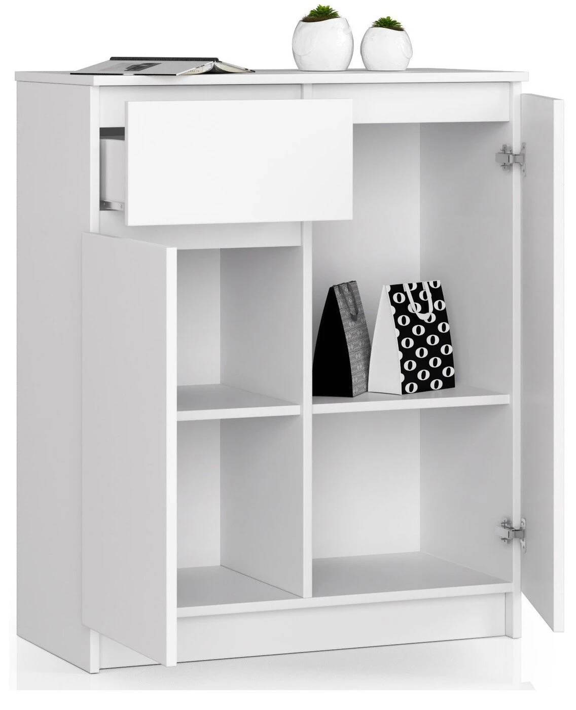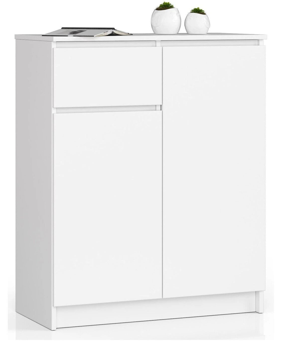 Aprašymas buvo automatiškai išverstas, gali pasitaikyti klaidų. - Komoda iš aukštos kokybės 16 mm dilimui atsparios laminuotos plokštės, gamintojas Kronospan - Stalčių fasadai iš laminuotos plokštės - Stalčius eina ant metalinių ritinėlių - Kraštai padengti ABS briauna, kad būtų gerai apsaugota nuo pažeidimų - Kiekvienos durelės viduje yra viena lentyna - Savarankiškai surenkama komoda - Pateikiama instrukcija - Garantija 24 mėn. Šiuolaikinė balta komoda su stalčiumi ir erdviomis lentynomis – tai pasiūlymas žmonėms, kurie mėgsta paprastą , bet kartu efektingas skandinaviškas stilius. Tai kokybiškas baldas, kurį dėl savo vizualinių savybių noriai renkasi mūsų klientai. Balta komoda pasižymi madinga ir universalia spalvų gama. Atkreiptinas dėmesys ir į kruopštų apdirbimą bei tvirtą konstrukciją, kurios garantuoja pristatomų baldų ilgaamžiškumą. 80 cm komoda gali būti naudojama bet kurioje patalpoje – viešbutyje, biure ar gyvenamajame kambaryje. Puikiai atrodys, pavyzdžiui, miegamajame, svetainėje, valgomajame ar jaunimo kambaryje. Siūlome patrauklią kainą už prekę, kuri tikrai patiks ir padės sukurti nepakartojamą atmosferą bet kuriame madingai dekoruotame interjere. Baldai pagaminti iš laminuotos plokštės (storis 16 milimetrų), kuri rodo labai gerą atsparumą dilimui. Kraštai padengti ABS apvadu.