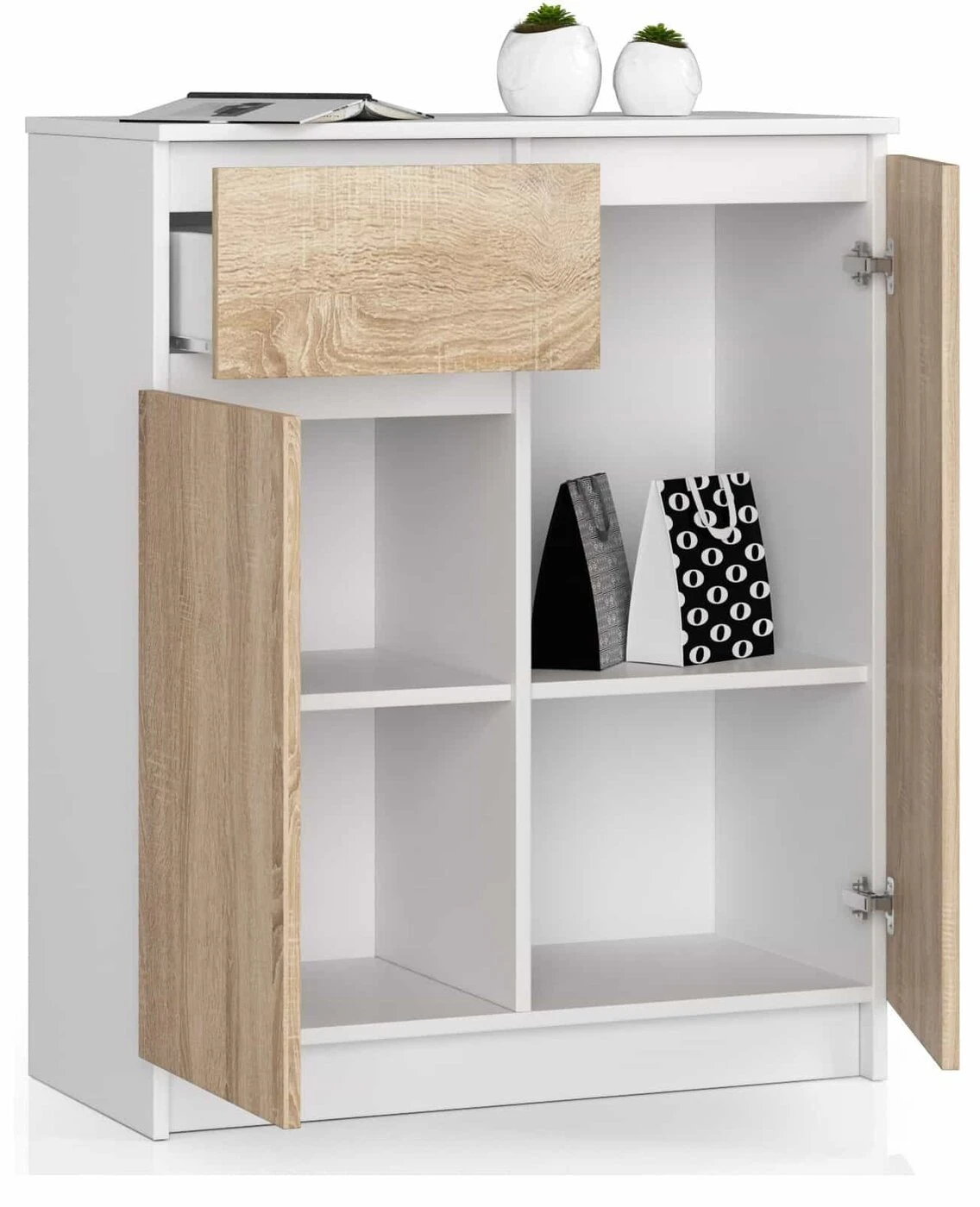 Aprašymas buvo automatiškai išverstas, gali pasitaikyti klaidų. Komoda – tai baldas, kurio neturėtų trūkti svetainėje. Į jį galima sudėti daug daiktų, o tai reiškia didesnę tvarką kambaryje. Savo ruožtu ant jo stalviršio gali būti dedamos gėlės ir dekoracijos. Žmonės, ieškantys solidaus ir estetiško baldo už gerą kainą, gali atkreipti dėmesį į K 60 cm komodą baltu korpusu ir sonomos spalvos fasadais. Šis baldas turi daug privalumų, todėl tai puikus pasirinkimas svetainei ir ne tik (tiks ir miegamajame arba svetainėje). Komoda pasižymi: ilgaamžiškumu - baldas pagamintas iš aukštos kokybės 16mm laminuotos plokštės, atsparios dilimui ir įbrėžimams , talpa - komodoje yra daug vietos išdėstyti, t.y. stalčius ir dvi durys (įskaitant lentynas), naudojimo patogumas - stalčius juda ant metalinio volelio kreiptuvai, atsparumas - baldų kraštai padengti ABS apvadu, užtikrinančiu aukštą apsaugą nuo pažeidimų, aukšta estetika - baldai kruopščiai pagaminti, paprastos formos, tačiau išsiskiria baltos ir sonomos spalvos deriniu, funkcionalumas - komoda padeda palaikyti tvarką ir tuo pačiu gražiai atrodo bei dera prie įvairių interjero derinių, patraukli kaina garantija 24 mėn. Retai kada komodos turi tiek privalumų, kiek jos siūlo svarbus mūsų baldas. Jis išsiskiria ilgaamžiškumu ir tarnaus ilgai. Komoda pasižymi modernia išvaizda, o tuo pačiu leidžia jos interjere paslėpti daugybę daiktų. Baldai skirti montuoti savarankiškai, o tai palengvina komplekte esančios instrukcijos.