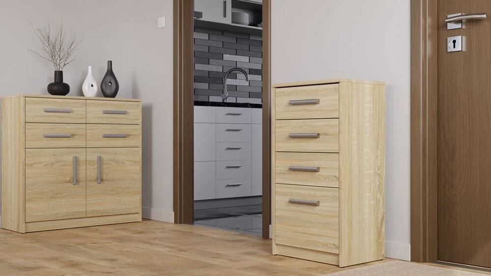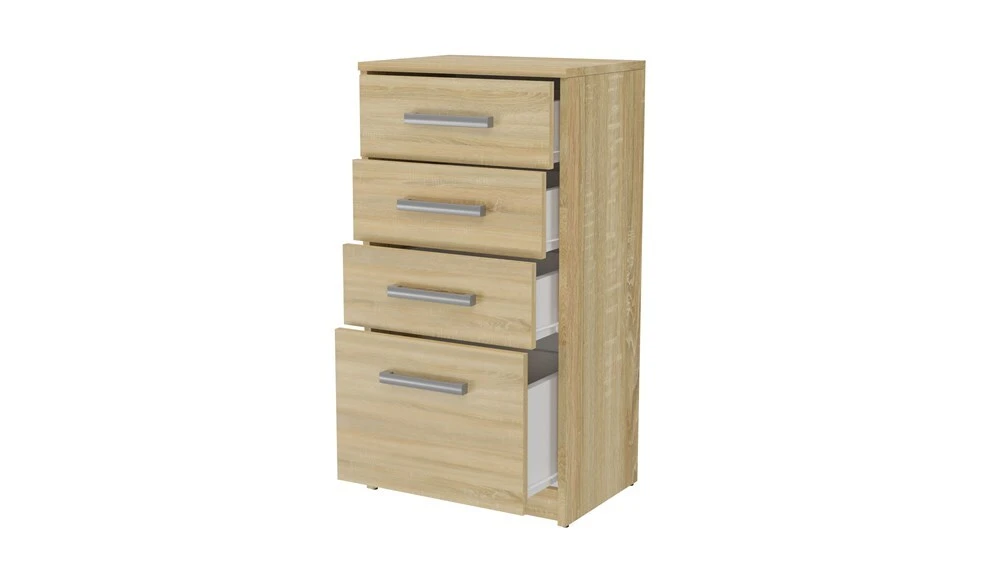pastatoma 4-ų stalčių komoda;komoda pagaminta iš 16 mm storio laminuotos medžio drožlių plokštės su ABS kraštų apdaila;ritininiai bėgeliai apsaugos stalius nuo iškritimo;komodos išmatavimai: plotis - 45 cm, gylis - 33 cm, aukštis - 85 cm;vidinis išplanavimas pavaizduotas 3 nuotraukoje;komodos spalva: korpusas - sonoma ąžuolas (matinė), fadasas - sonoma ąžuolas (matinė);atsparus įbrėžimams ir pažeidimams paviršius;tvirta ir stabili konstrukcija;