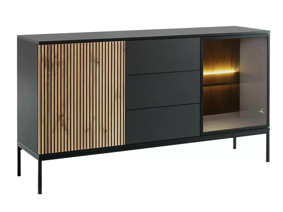 Modernaus dizaino baldas lengvai pritaikomas šiuolaikinio stiliaus interjere. Išmatavimai: plotis: 154 cm; aukštis: 83 cm; gylis: 39 cm.Medžiaga: MDP/MDF plokštė, plienas, stiklas, ABS plastiku dengtos briaunos. Pritaikyta robotui siurbliui. Push to open atidarymo mechanizmas. Tylaus uždarymo sistema. LED apšvietimas.Spalva: grafitas - šviesus ąžuolas.