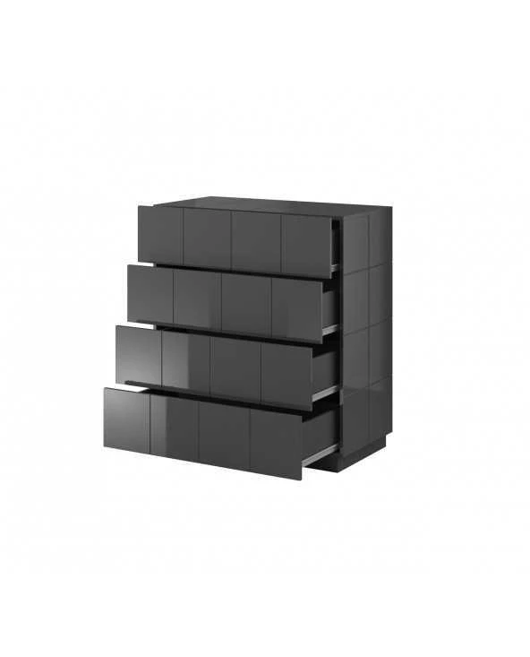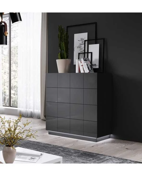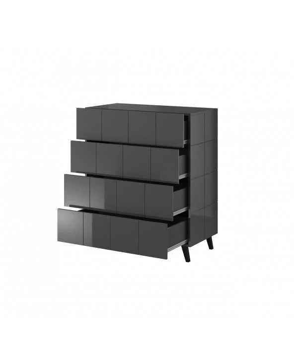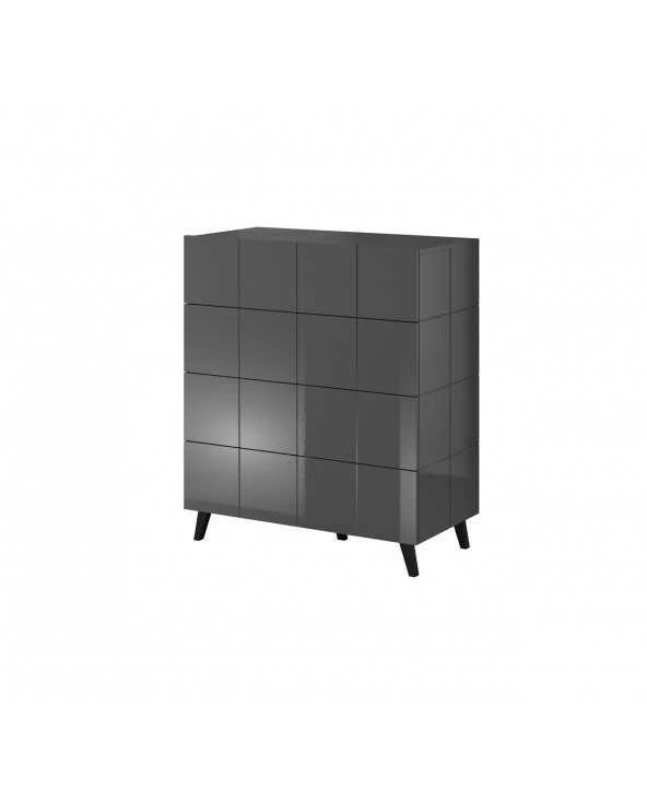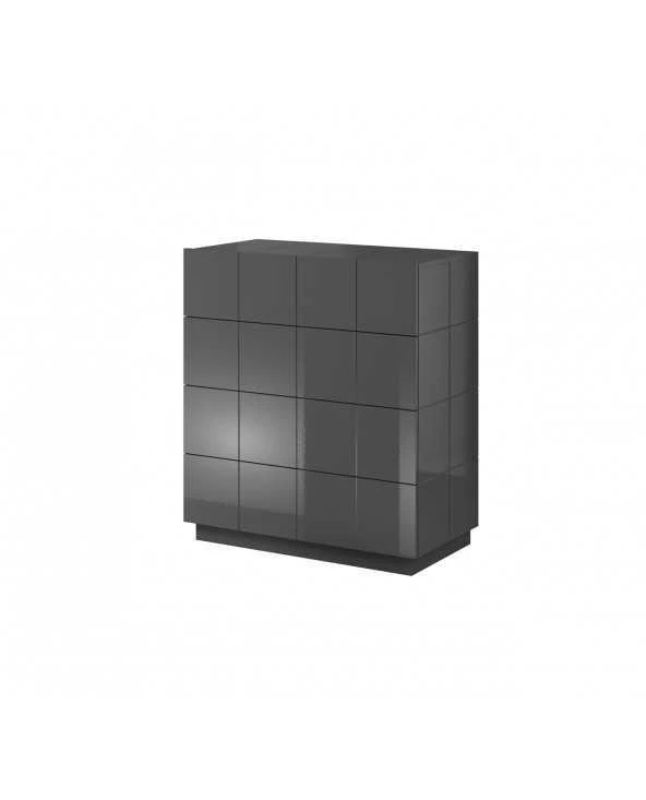 | Medžiaga | Šonai ir viršus: blizgi frezuota MDF plokštė Priekinės dalys / atvartai: blizgi frezuota MDF plokštė Kiti elementai: laminuota baldų plokštė |