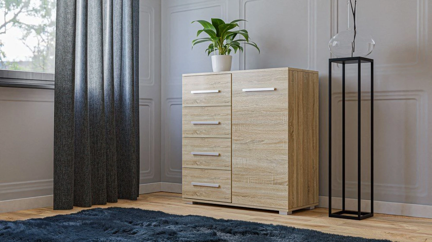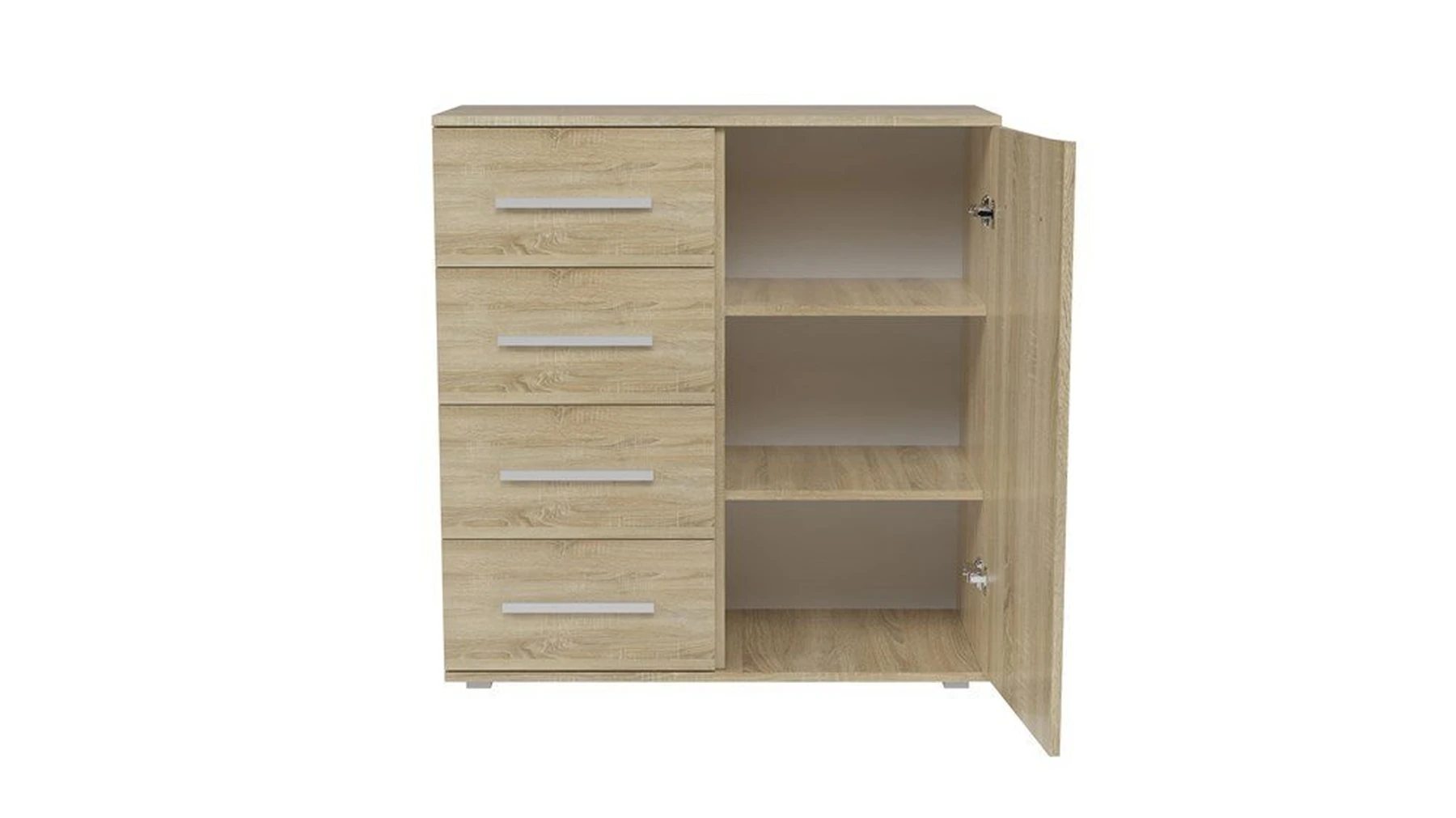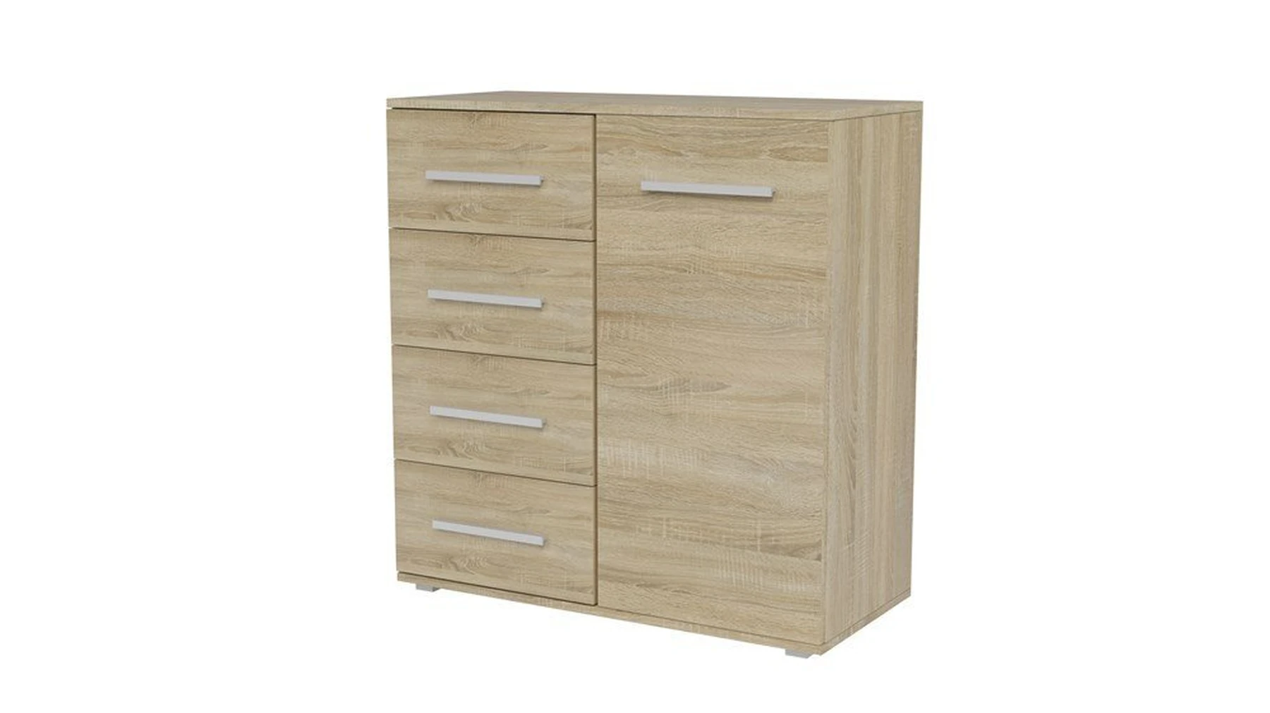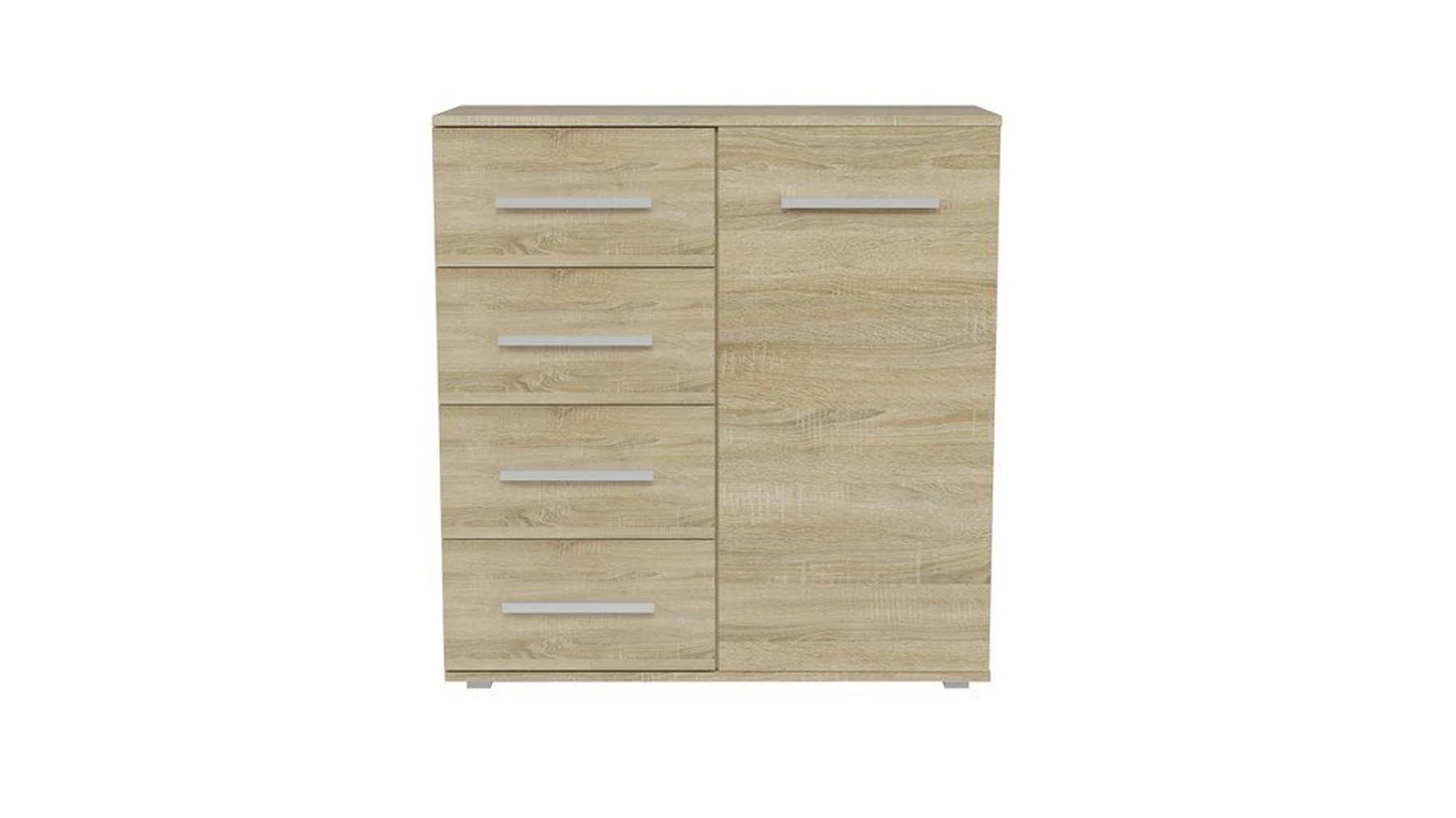 pastatoma 1-ų durelių ir 4-ų stalčių komoda;komoda pagaminta iš 16 mm storio laminuotos medžio drožlių plokštės su ABS kraštų apdaila;ritininiai bėgeliai apsaugos stalčius nuo iškritimo;komodos išmatavimai: plotis - 90 cm, gylis - 40 cm, aukštis - 95 cm;vidinis išplanavimas pavaizduotas 3 nuotraukoje;komodos spalva: korpusas - balta (matinė), fadasas - balta (matinė);tvirta ir stabili konstrukcija;