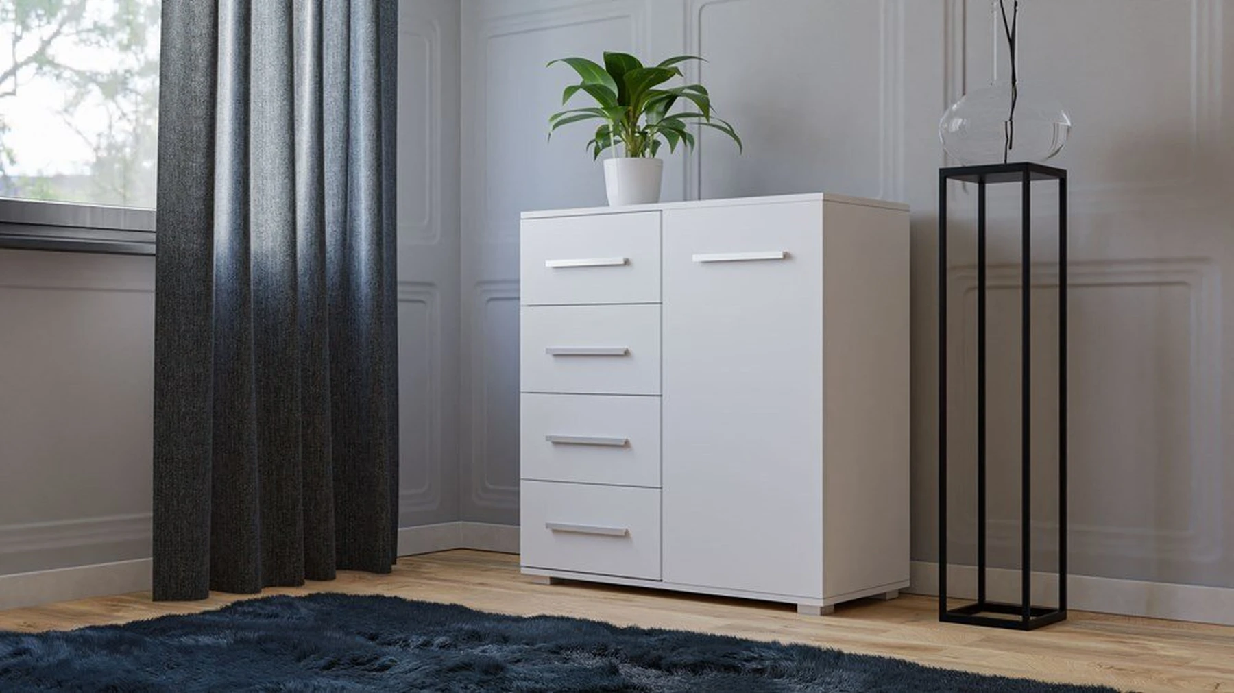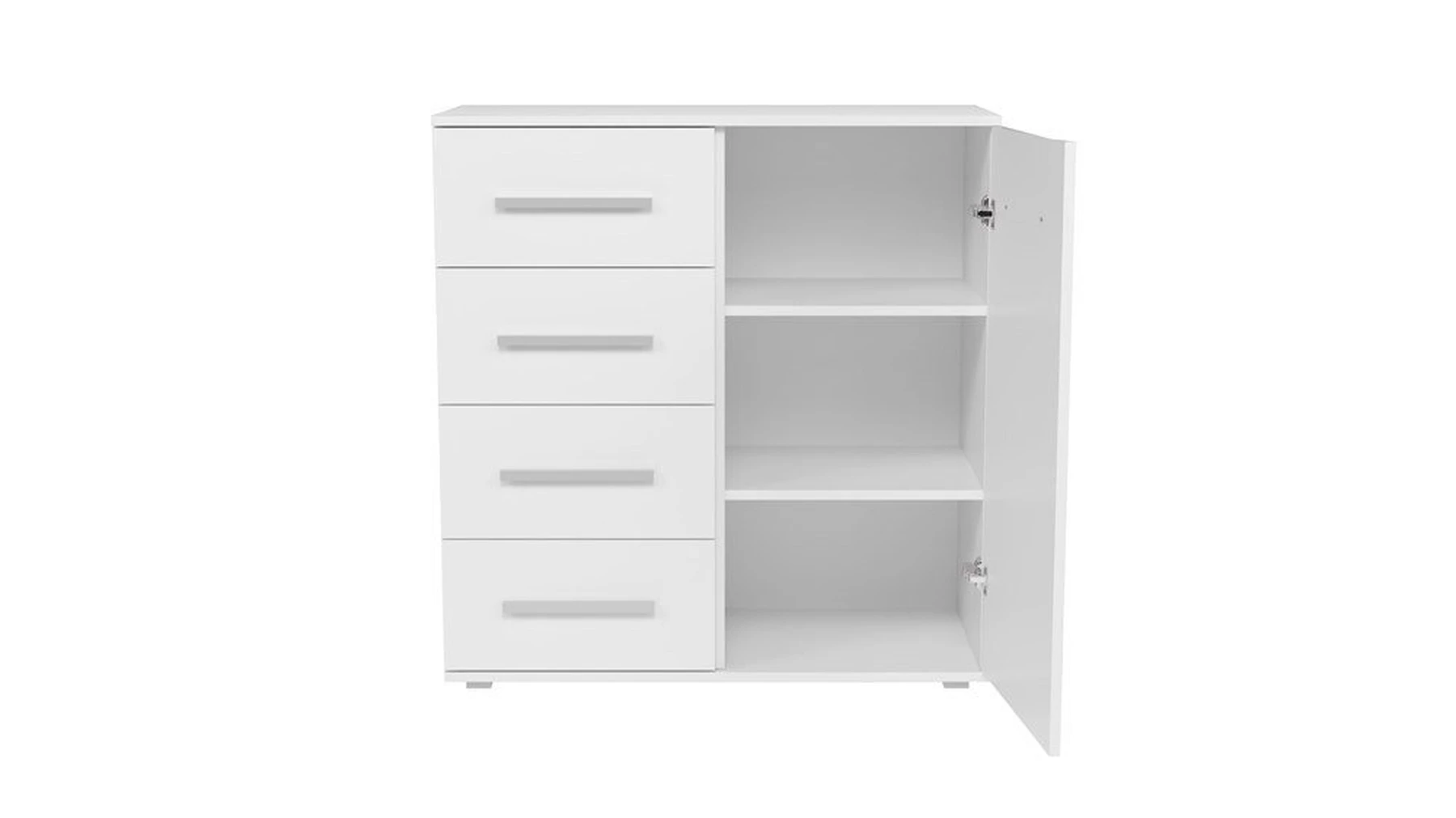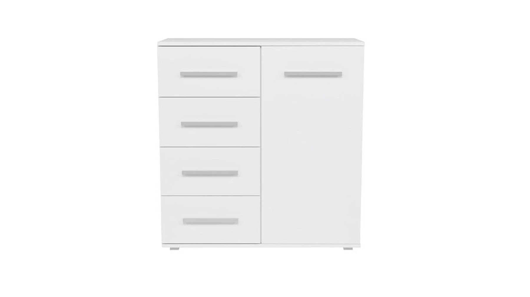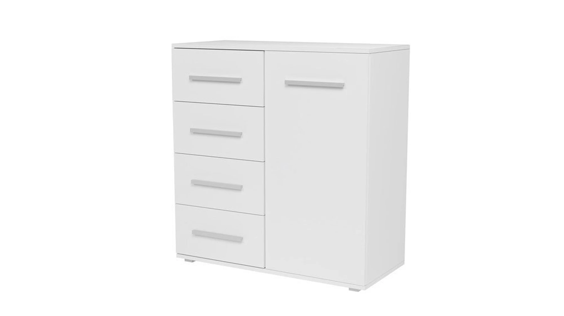 pastatoma 1-ų durelių ir 4-ų stalčių komoda;komoda pagaminta iš 16 mm storio laminuotos medžio drožlių plokštės su ABS kraštų apdaila;ritininiai bėgeliai apsaugos stalčius nuo iškritimo;komodos išmatavimai: plotis - 90 cm, gylis - 40 cm, aukštis - 95 cm;vidinis išplanavimas pavaizduotas 3 nuotraukoje;komodos spalva: korpusas - balta (matinė), fadasas - balta (matinė);tvirta ir stabili konstrukcija;