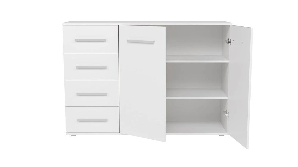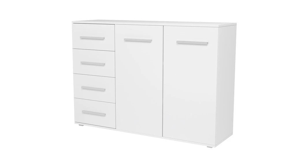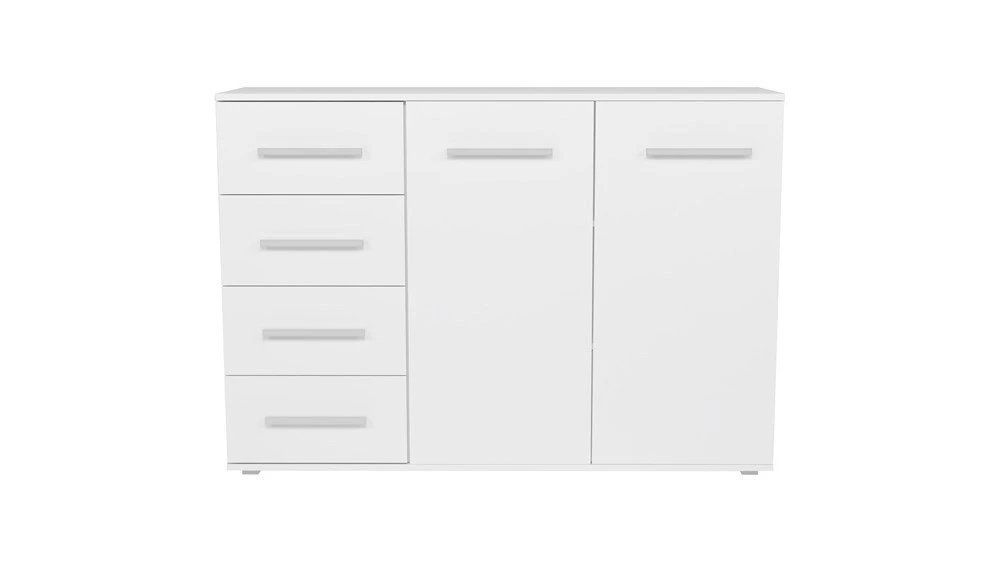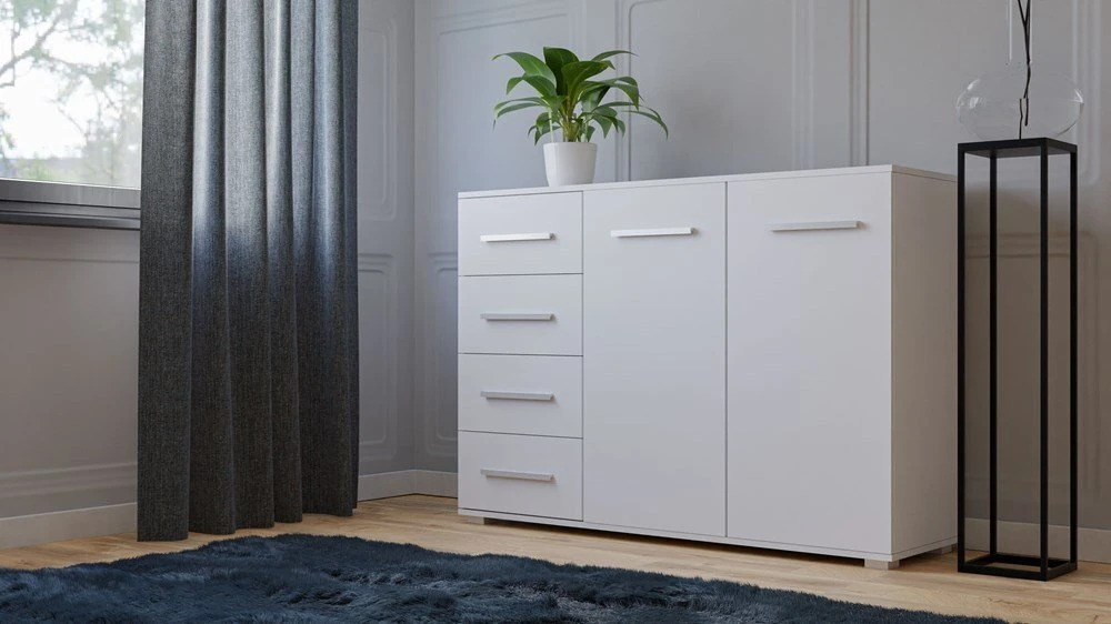 pastatoma 2-ų durelių ir 4-ų stalčių komoda;komoda pagaminta iš 16 mm storio laminuotos medžio drožlių plokštės su ABS kraštų apdaila;ritininiai bėgeliai apsaugos stalčius nuo iškritimo;komodos išmatavimai: plotis - 135 cm, gylis - 40 cm, aukštis - 95 cm;vidinis išplanavimas pavaizduotas 3 nuotraukoje;komodos spalva: korpusas - balta (matinė), fadasas - balta (matinė);tvirta ir stabili konstrukcija;