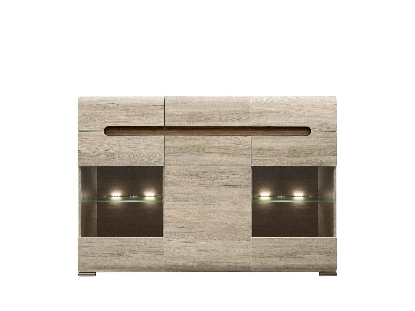 Modernaus dizaino komoda-vitrina AZTECKA su talpiomis lentynomis, stiklu ir LED apšvietimu.