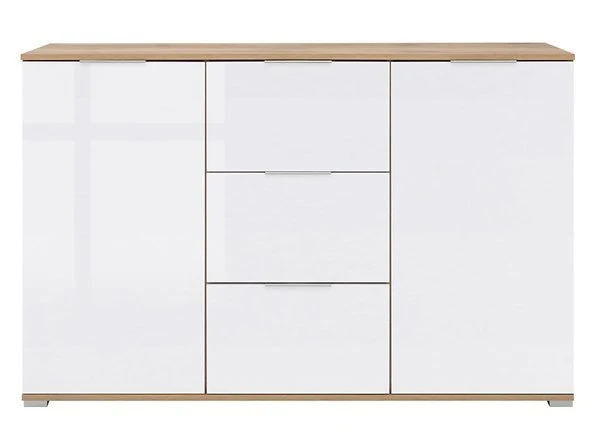 Modernaus dizaino komoda ZLATA su talpiais stalčiais ir lentynomis.