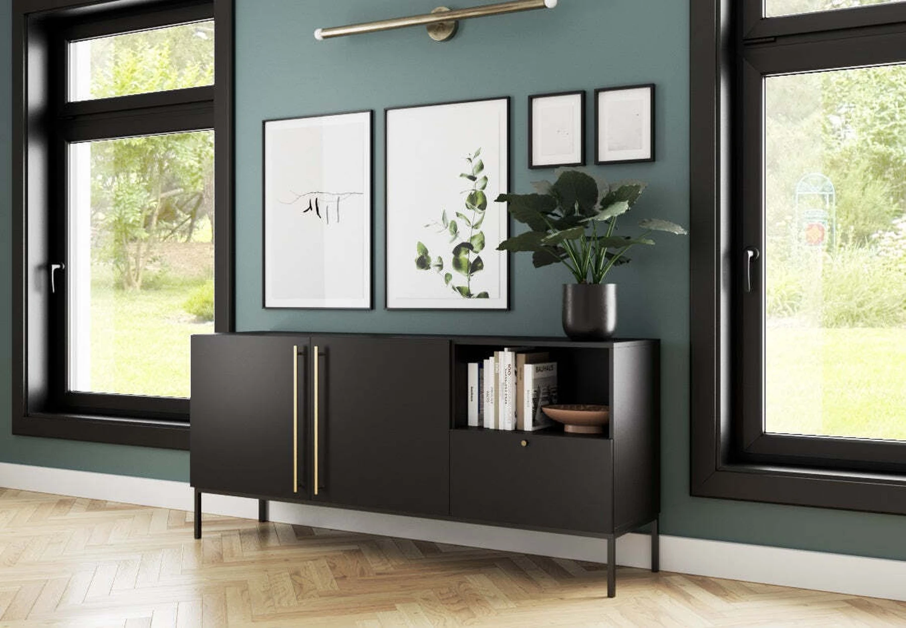 Didelė EL6269 komoda su vienu erdviu stalčiumi turi švarų siluetą ir neutralią, vientisą apdailą, kuri dera su beveik bet kokia spalvų palete. Dėl tylaus uždarymo funkcijos stalčius atsidaro sklandžiai ir yra beveik tylus. Be to, komodoje yra dvi didelės lentynos, paslėptos už rakinamų durų. Trečioji lentyna neuždengta, tai suteikia galimybę eksponuoti, pavyzdžiui, nuotraukas ar žvakes. Beveik dviejų metrų pločio komoda EL6269 leidžia paslėpti didelį kiekį atsarginės patalynės, marškinių, kelnių ir kitų būtiniausių spintos reikmenų. Baldų matinės spalvos buvo sukurtos tokiomis konfigūracijomis: matinė juoda derinama su ąžuolu ir tik matinė juoda. Tai suteikia galimybę rinktis iš populiarios juodos spalvos ir su gamta siejamo medžio. Juodos spalvos papildymas yra auksinės rankenos. Tuo tarpu antroji versija atidaroma su "stumti, kad atidarytumėte" vyriai, kuriuos tereikia lengvai paspausti, norint naudotis EL6269 komodos lentynomis ar stalčiais. Juodos metalinės 20 cm kojelės suteikia baldui stabilumo pojūtį ir tuo pačiu yra įdomus papildymas. Galimi dviejų spalvų variantai Aukštis: 80 cm Gylis: 40 cm Plotis: 180 cm Svoris: 51 kg Plastikinė konfigūracija: juoda matinė+ amatinis ąžuolas / juodas matinis+juodas matinis Rėmo spalva: juoda Audinys: MDF plokštė Kojelių dizainas: metalas Kojelių aukštis: 20 cm Stalčių skaičius: 1 Durelių skaičius: 2 Uždarų lentynų skaičius: 2 Atvirų lentynų skaičius: 1