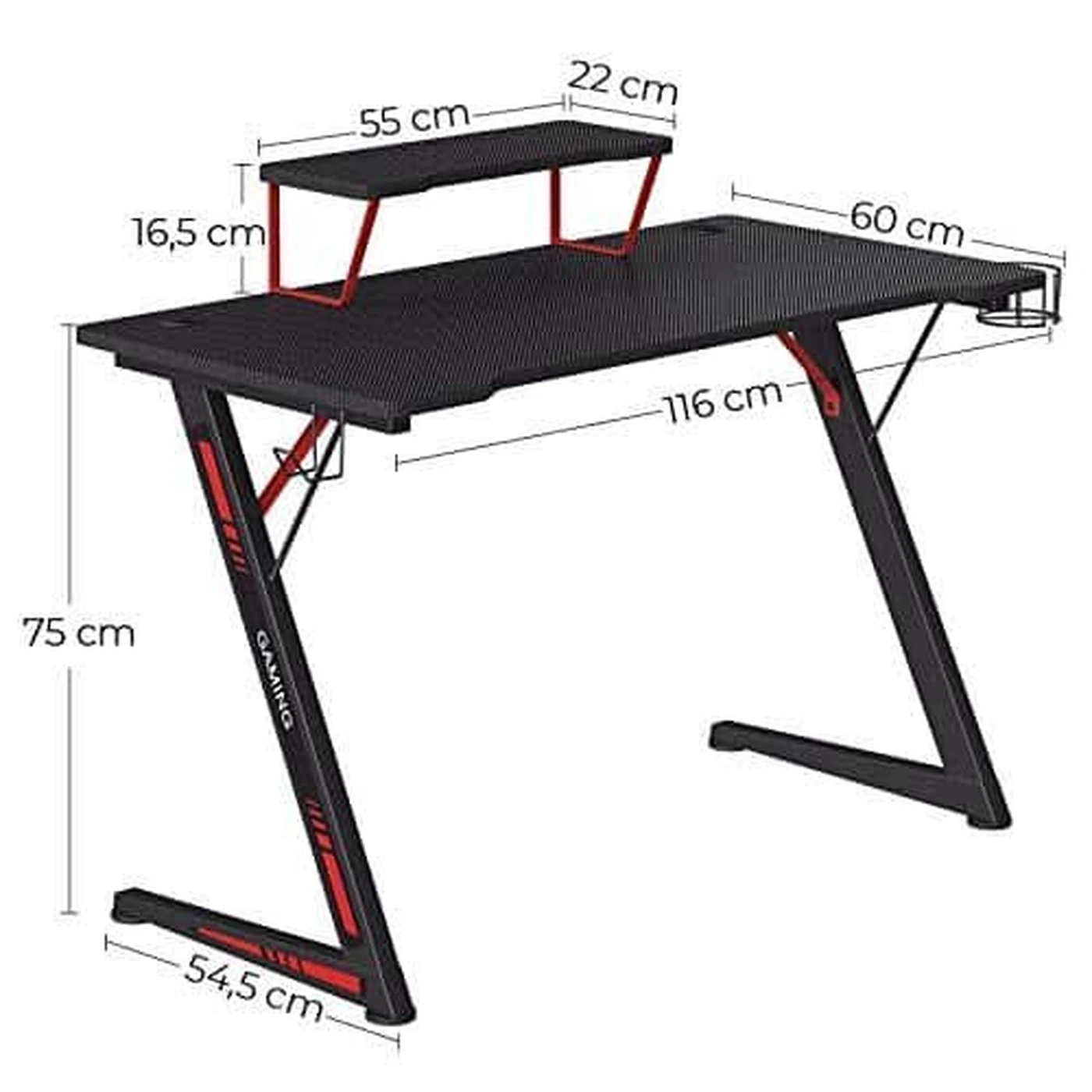 Aprašymas buvo automatiškai išverstas, gali pasitaikyti klaidų.Tinka jums: domitės kompiuteriniais žaidimais ar daug laiko praleidžiate prie kompiuterio? Raudonos ir juodos spalvos žaidimų stalas SONGMICS sukuria idealią atmosferą varžybiniams žaidimams. Yra pakankamai vietos monitoriams, pelei, klaviatūrai ir dėžutėms. Šonuose yra papildomi laikikliai ausinėms ir gėrimo pertraukėlėms. Tikrai praktiška!Aukšta kokybė: Šis žaidimų stalas sudarytas iš plieninio rėmo ir tvirtos medžio drožlių plokštės, ant paviršiaus galima apkrauti iki 50 kg. Z formos rėmas ir armatūros strypai užtikrina didelį stabilumą.Informacija apie gaminį: Spalva: juoda-raudona Medžiaga: Plienas, MDF (vidutinio tankio medienos plaušų plokštė) Dydis: 116 x 60 x 75 cm (P x P x A) Stalviršio storis: 1,8 cm Svoris: 18,9 kg Maks. Statinė apkrova: 50 kg Pristatymo komplektas: 1 x žaidimų stalas 1 x lipdukas 1 x priedų paketas 1 x instrukcija (DE, EN, FR, IT, ES) SONGMICS Pastabos: Saugumo sumetimais vaikams draudžiama lipti ant gaminį arba žaiskite su juo Maksimalus statinis Stalviršio keliamoji galia 50 kg. Prašome neviršyti šio didžiausio svorio.