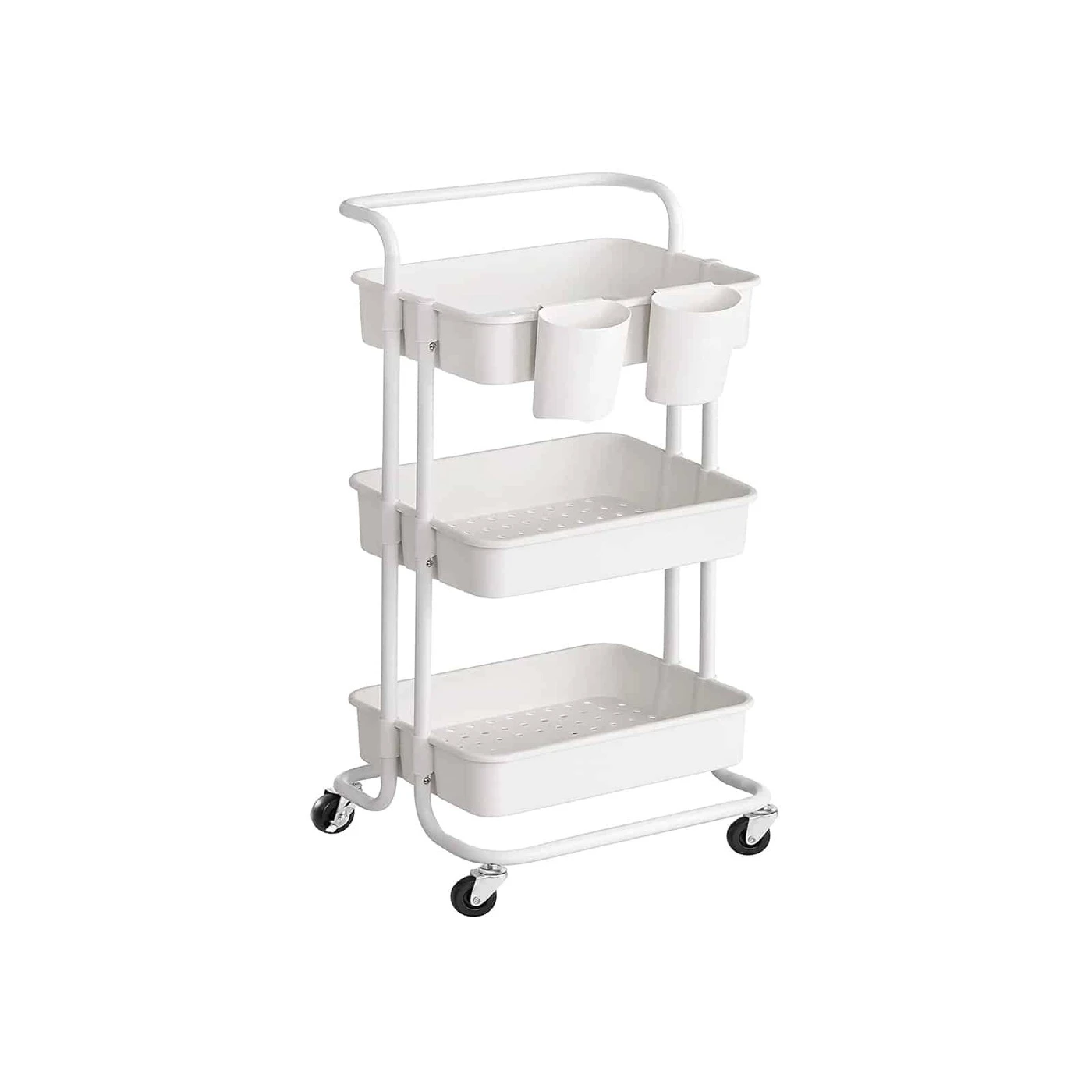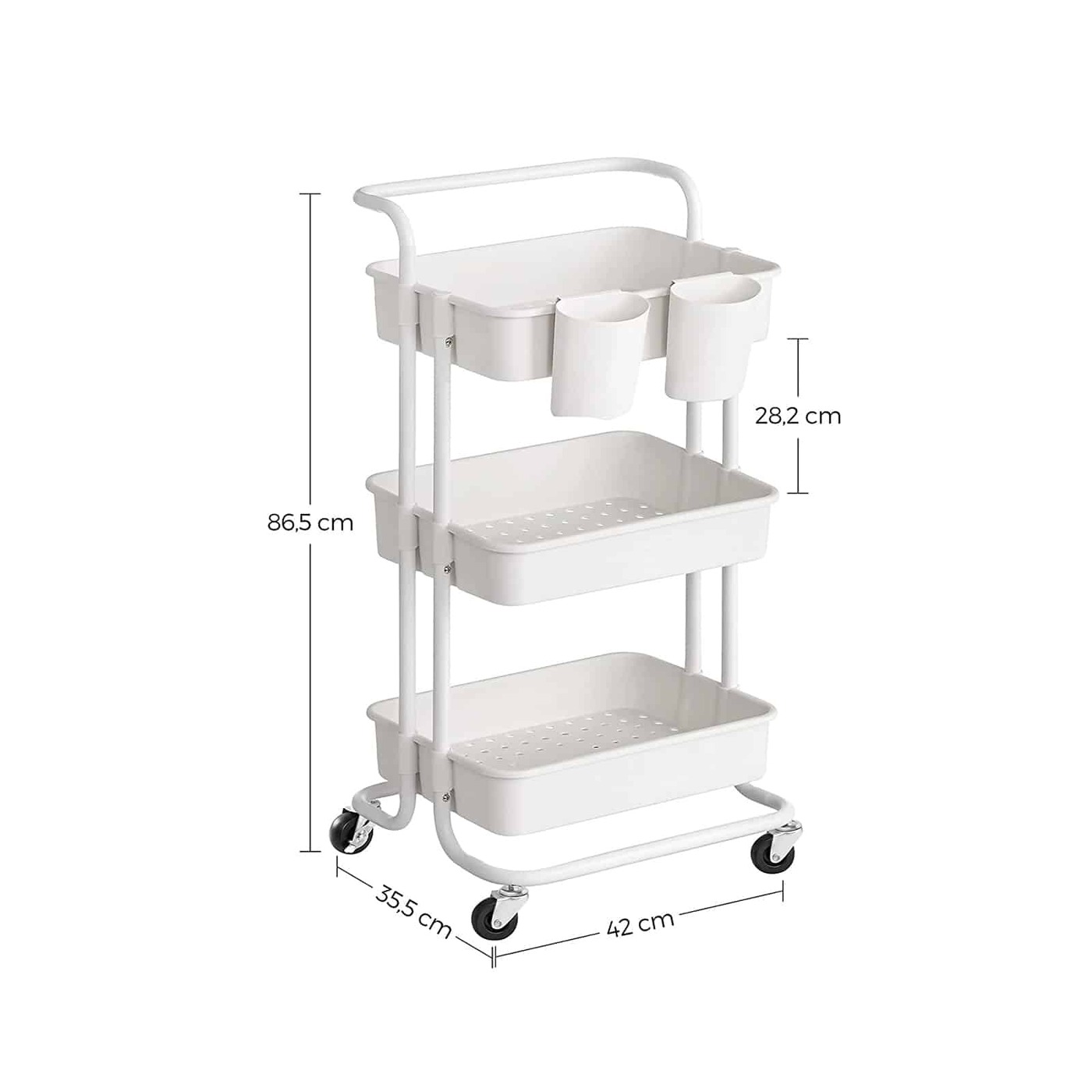 Aprašymas buvo automatiškai išverstas, gali pasitaikyti klaidų.Tvirtas plieninis rėmas, 3 plastikinės laikymo lentynos ir 4 aukštos kokybės ratukai (iš kurių 2 yra užrakinami) – Sukite šią SONGMICS lentyną ten, kur reikia daugiau vietos. Į skalbyklą: įstumkite šią lentyną į skalbyklą, kad galėtumėte laikyti skalbimo priemones. , audinių minkštiklis, valymo priemonės ir kt. Rytoj skalbimo diena! Bet nesijaudinkite, visi indai jau vežimėlyje ir laukia naudojimo!Virtuvėje: prieskoniai viršutinėje lentynoje, vaisiai viduryje ir daržovės apačioje – viskas turi savo vietą! Pagaliau galite išlaisvinti savo darbo paviršius iš chaoso ir vėl juos protingai naudoti Biure: šioje lentynoje galite laikyti savo biuro reikmenis ir sukurti tvarką ant stalo. Kad galėtumėte dirbti produktyviai, tvarkinga darbo vieta yra viskas ir pabaiga! Kai jūsų biurui reikia žalumos, galite įdėti keletą mažų sukulentų į viršutinę šios lentynos lentyną. Pagalvokite ne apie dėžutę! Šio vežimėlio laukia begalė naudojimo galimybių! Gimtadienio dovanas sukti kaip staigmeną? parduodu knygas? Arba pristatyti mažus augalėlius... Ką dar? Į šį serviravimo vežimėlį telpa įvairūs daiktai.Informacija apie gaminį: Spalva: Balta Medžiaga: Plienas, PP plastikas Dydis: 41,6 x 33,5 x 86,3 cm (I x P x A) Svoris: 3 kg Maks. Statinė keliamoji galia vienam lygiui: 10 kg Pristatymo komplektas: 1 x vežimėlis 2 x mažas pakabinamas skyrius 1 x priedų paketas 1 x instrukcijos (DE, EN, FR, ES, IT)