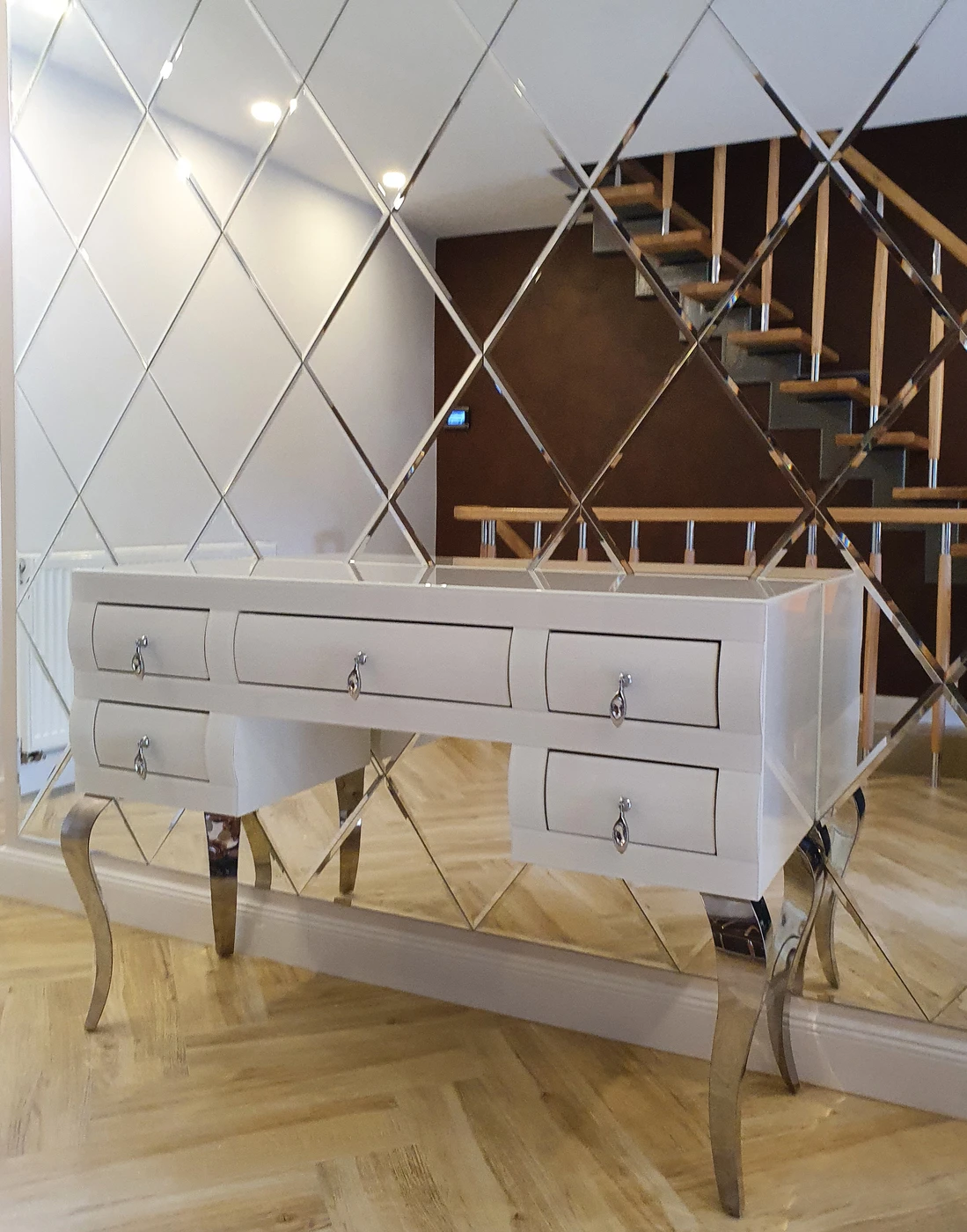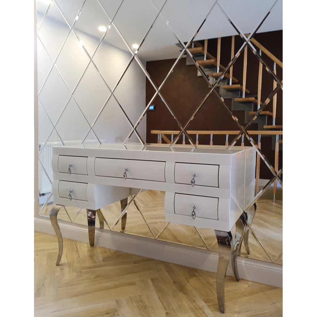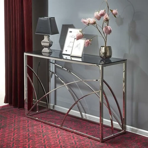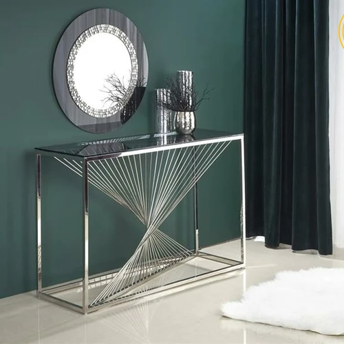 Elegantiška balto stiklo konsolė su nerūdijančio plieno kojelėmis