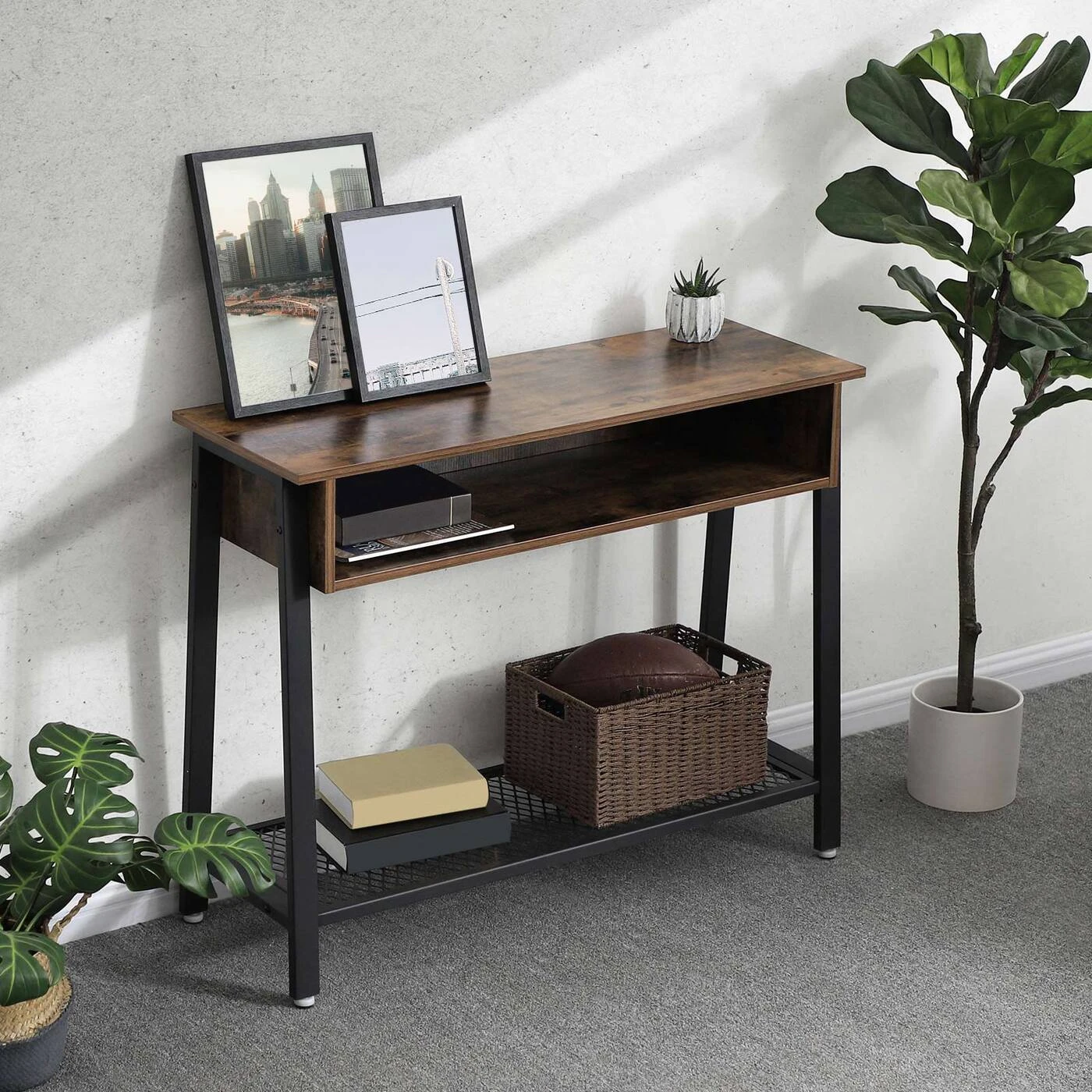 Aprašymas buvo automatiškai išverstas, gali pasitaikyti klaidų.VASAGLE – tai vaizdingas funkcionalumo, ilgaamžiškumo ir stilingo vintažinio dizaino derinys. Jei norite savo kambariams suteikti individualumo ir antikvarinės apdailos, su šia baldų serija galite pasiekti įspūdingų efektų. Siauras stalas, didelis efektas Elegantiškas vintažinis šio prieškambario stalo dizainas ir subtilūs 100 x 80 x 35 cm (P x A x G) matmenys užtikrina, kad baldas iškirps dailią figūrą bet kurioje įėjimo zonoje. Naudokite medinį stalviršį, atvirą skyrių ir metalinę tinklinę lentyną akiniams, lempai ir gėlėms pasidėti arba batams tvarkyti. O gal vis dar trūksta žavingo konsolinio stalo papuošalams miegamajame ir prezentacijos zonos mėgstamoms dekoracijoms svetainėje? Kad ir kokius planus turėtumėte, su senoviniais VASAGLE baldais jūsų gyvenimo idėjas nesunkiai įgyvendinsite!Informacija apie gaminį: - Spalva: vintažinė ruda-juoda - Medžiaga: medžio drožlių plokštė, plienas - Matmenys: 100 x 80 x 35 cm (P x A x G) - Svoris: 16,1 kg - Maksimali stalviršio apkrova: 30 kg - Maksimali grotelių lentynos apkrova: 10 kg Pristatymo komplektas: - 1 x konsolinis staliukas - 1 x krepšys priedams - 1 x rankinis (DE, EN, FR, ES, IT) VASAGLE Pastabos: - Gaminys skirtas išskirtinai patalpų naudojimas. Padėkite jį į sausą aplinką. - Maksimali stalviršio apkrova 30 kg, grotelių lentynos 10 kg. Nedėkite ant jo sunkesnių daiktų.