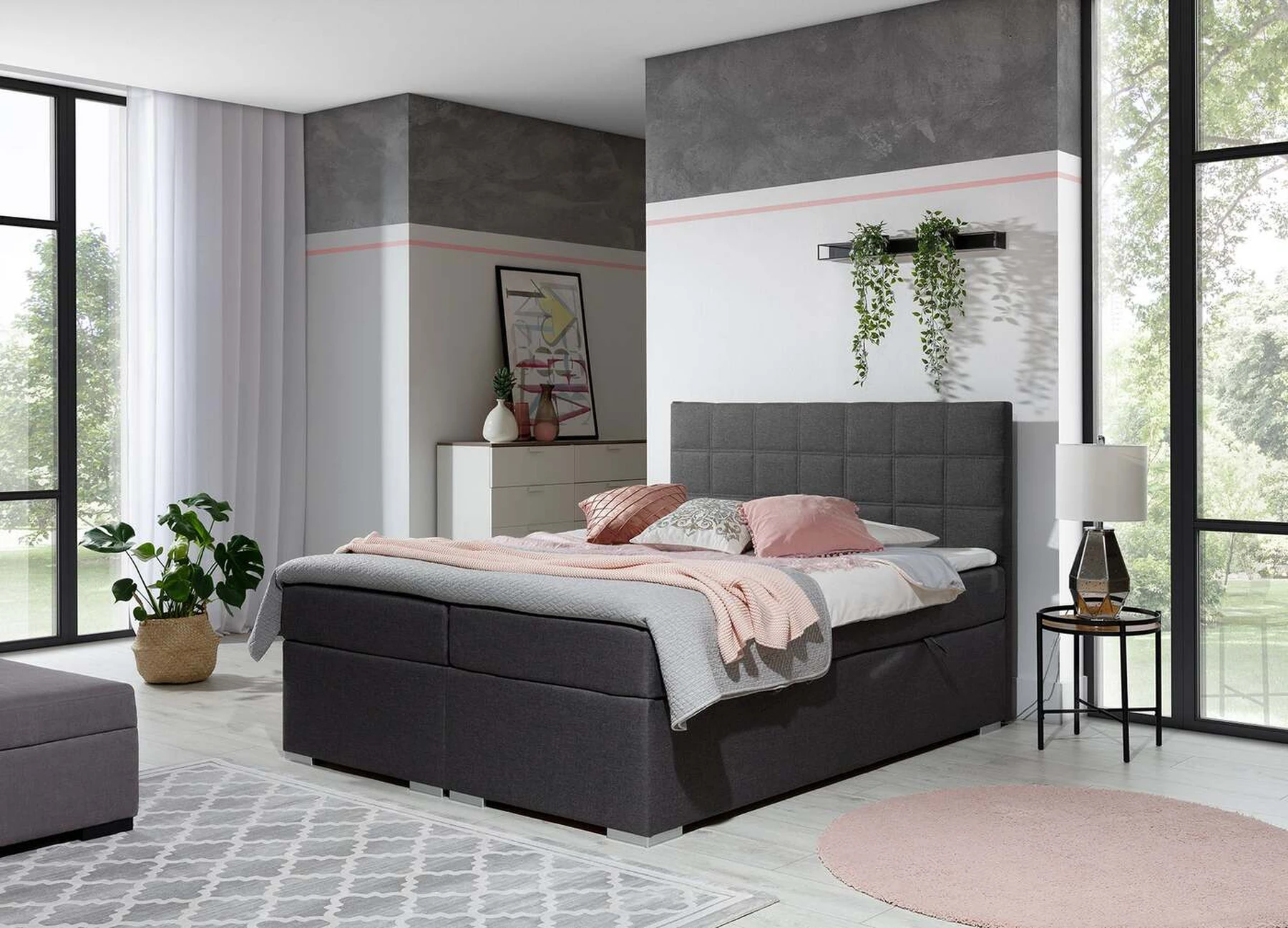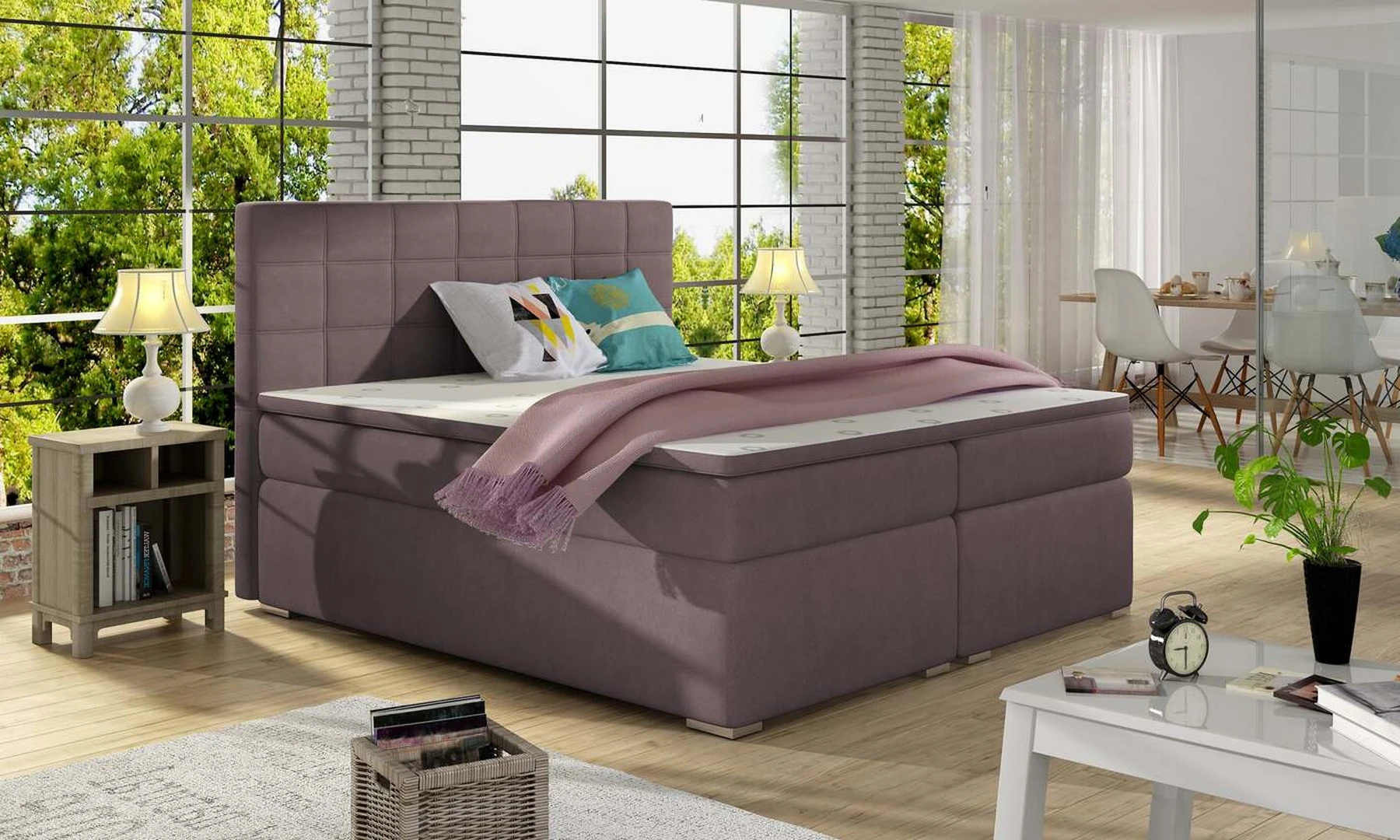 EL2345 yra stabili ir tinkamos formos lova, skirta aukštesnio nei vidutiniško komforto gurmanams, tiek miegant naktį, tiek ilsintis dieną. Sveiką ir patogų miegą mūsų lovoje garantuoja išskirtinai patogus 20 cm aukščio Bonell čiužinys, taip pat papildomas T25 porolono sluoksnis ant viršutinės ir apatinės čiužinio dalių bei 4 cm T21 porolono viršus. Toks derinys suteikia pakankamą kūno atramą ir stabilumą poilsio metu. EL2345 yra funkcionali lova ir bus tinkamas pasirinkimas bet kokio dydžio miegamiesiems, nes yra trijų dydžių: 140/160/180 x 200 cm. Mūsų kontinentinėje lovoje yra 2 erdvios patalynės dėžės, kurios atidaromos spyruokliniu mechanizmu, pakeliančiu viršutinę lovos dalį. Papildomi šio modelio išskirtiniai bruožai – elegantiškos kojos, aukštas dekoruotas galvūgalis ir daugybė apmušalų spalvų variantų. EL2345 yra klasikinė tvirta spyruoklinė lova, kuri yra atsakymas į visus galimus poreikius. Toks baldas pakeis ne tik interjerą, bet ir gyvenimo komfortą.