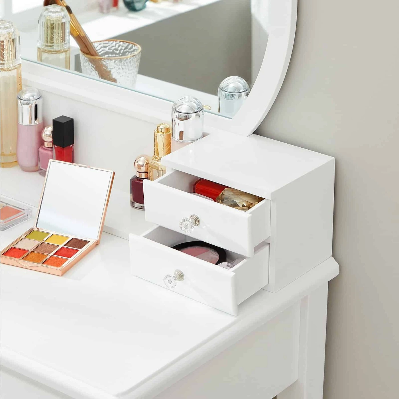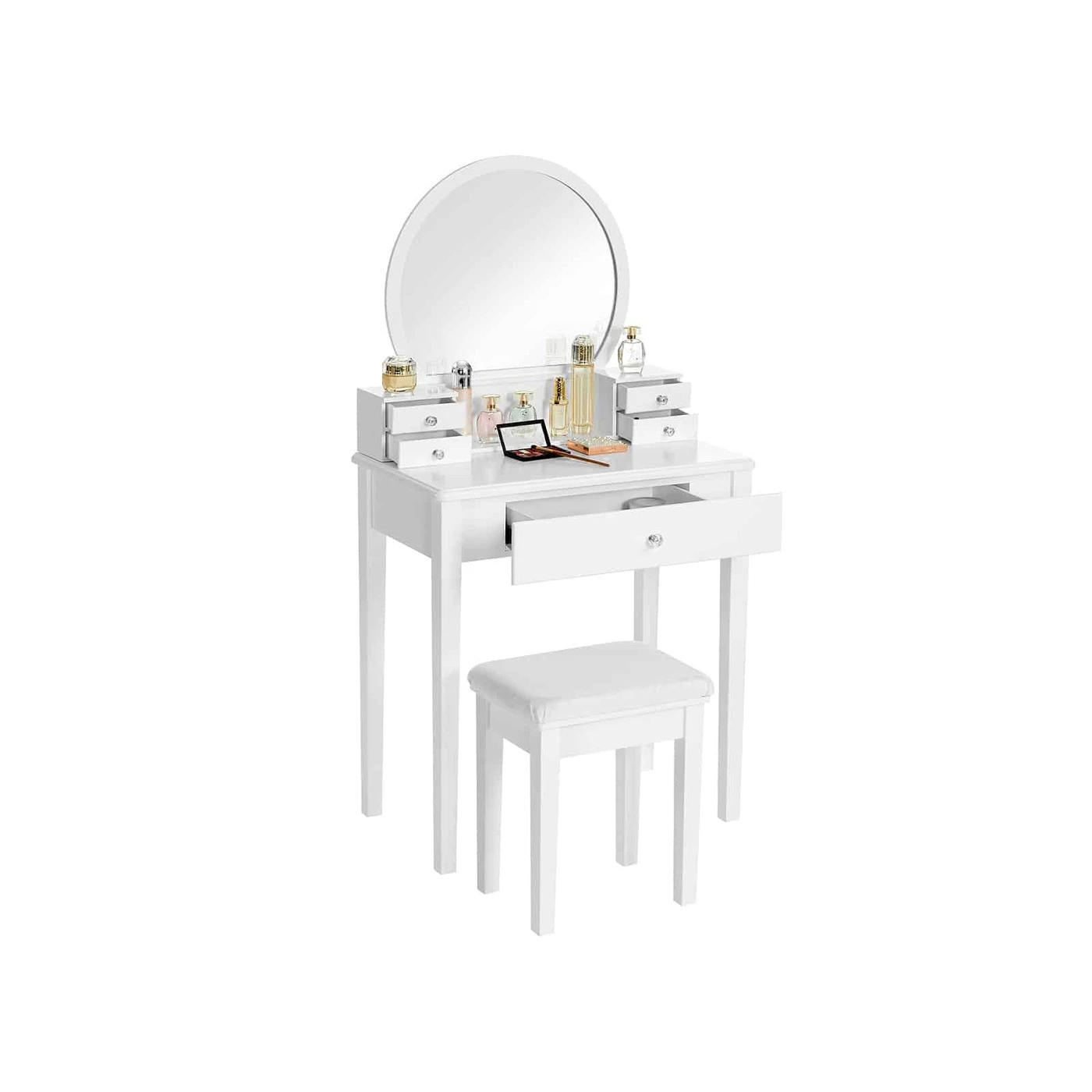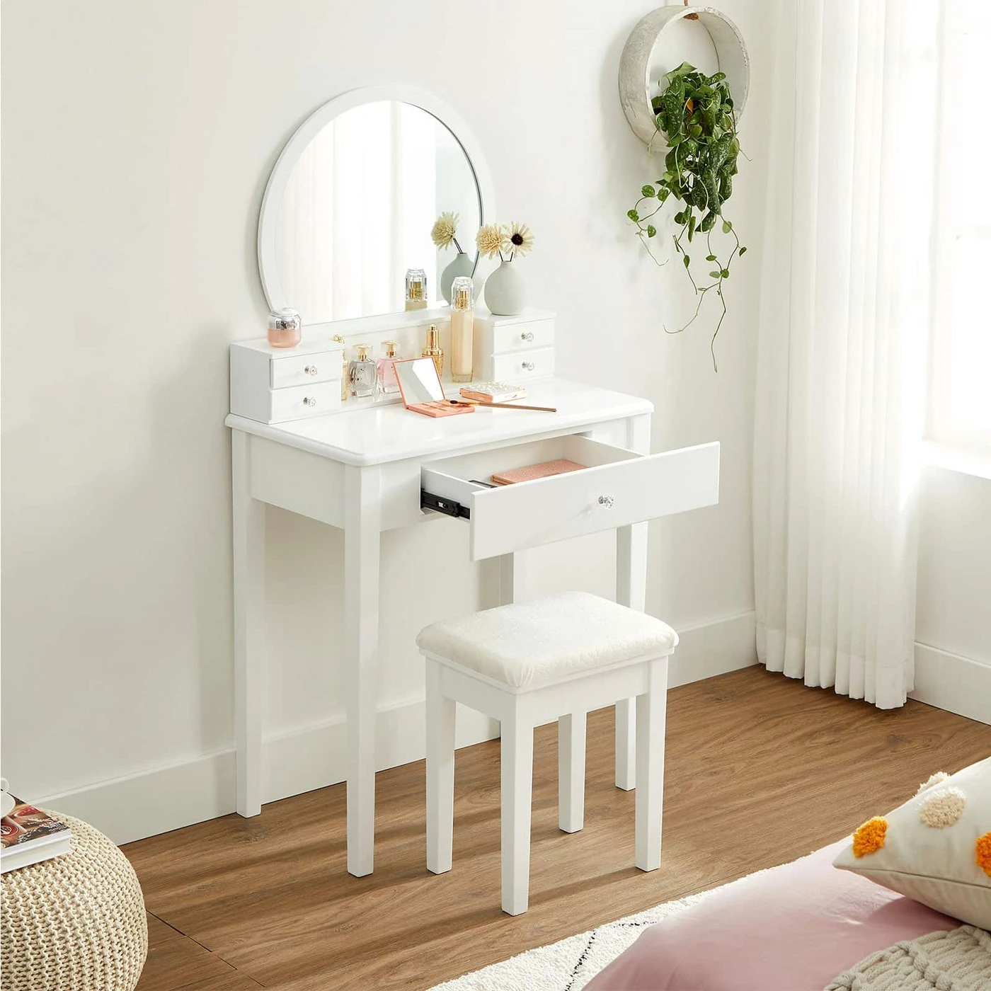 Aprašymas buvo automatiškai išverstas, gali pasitaikyti klaidų.Palengvinkite savo ryto rutiną Jums nebereikia klajoti po visus namus, kad surastumėte lūpų dažus, kad užbaigtumėte makiažą! Atsisėskite ant patogios, minkštos taburetės ir lengvai pasidėkite ant tualetinio staliuko gerai sutvarkytas makiažo ir odos priežiūros priemones. Nuo šiol kiekvienas rytas nuostabus. Magiška dovana Puiki dovanos idėja gimtadienio, Kalėdų ar kito reikšmingo jubiliejaus proga! Šis svajingas tualetinis staliukas su dideliu veidrodžiu, daug vietos daiktams ir patogia kėdute privers nusišypsoti kiekvieną!Išsami informacija apie gaminį:- Spalva: Balta- Medžiaga: MDF (vidutinio tankio medienos plaušų plokštė), pušis, guma, stiklas- Tualeto staliuko dydis: 70 x 40 x 134 cm (P x P x A)- Taburetės dydis: 40 x 30 x 46 cm ( P x P x A) - Svoris: 18,0 kg - Maksimali taburetės statinė apkrova: 130 kg Pristatymo komplektacija: - 1 x tualetinis staliukas su veidrodžiu - 1 x taburetė - 1 x priedų paketas - 1 x vadovas (DE, EN, FR, IT , ES) VASAGLE Pastabos: - Saugumo sumetimais vaikams draudžiama lipti ant gaminio ar žaisti su juo. - Saugokite gaminį nuo chemikalų. - Nuvalykite gaminį drėgnu skudurėliu. šluostė kasdieniam valymui.