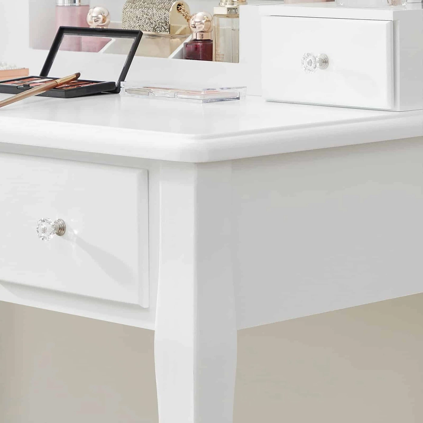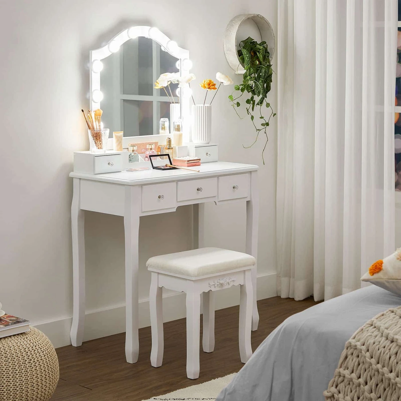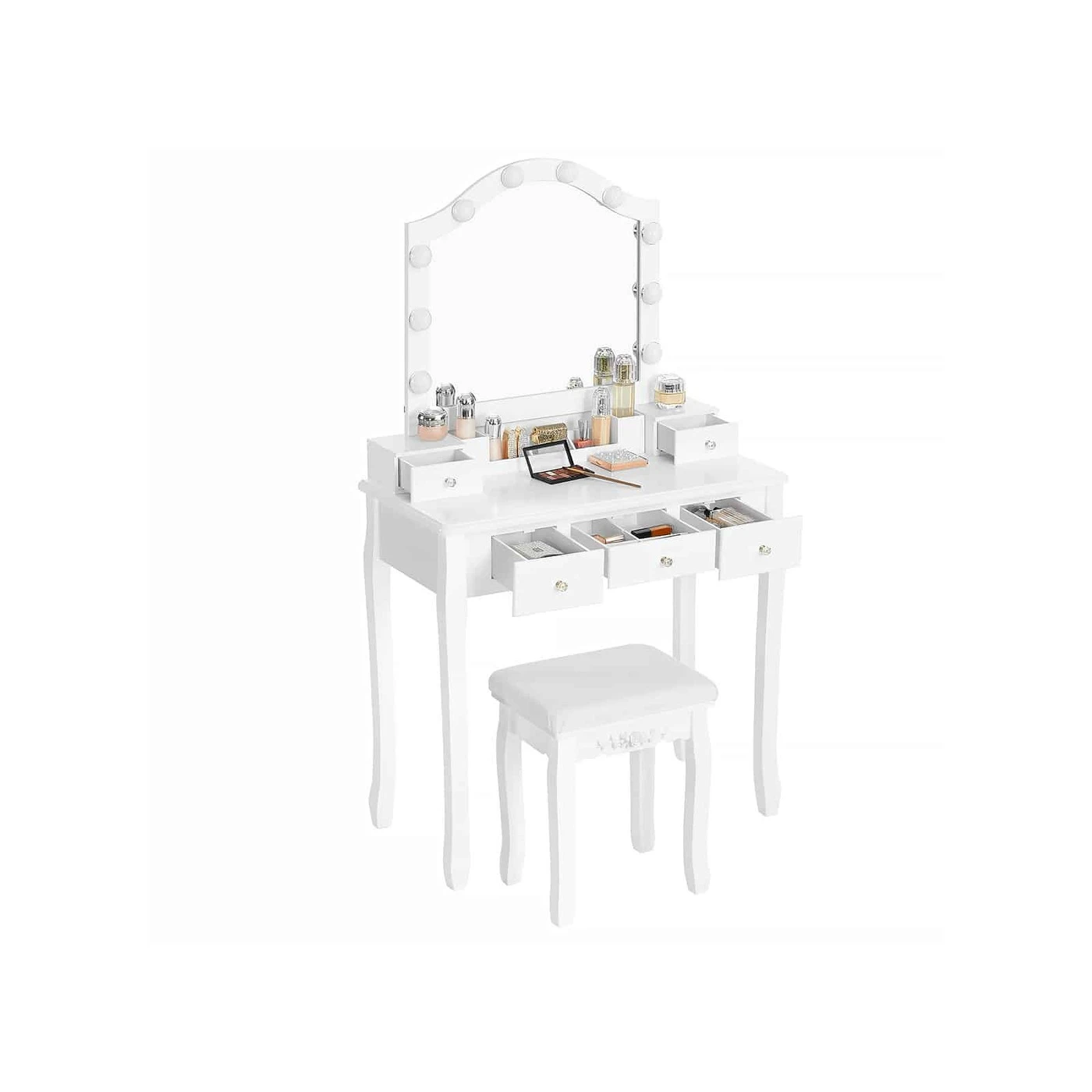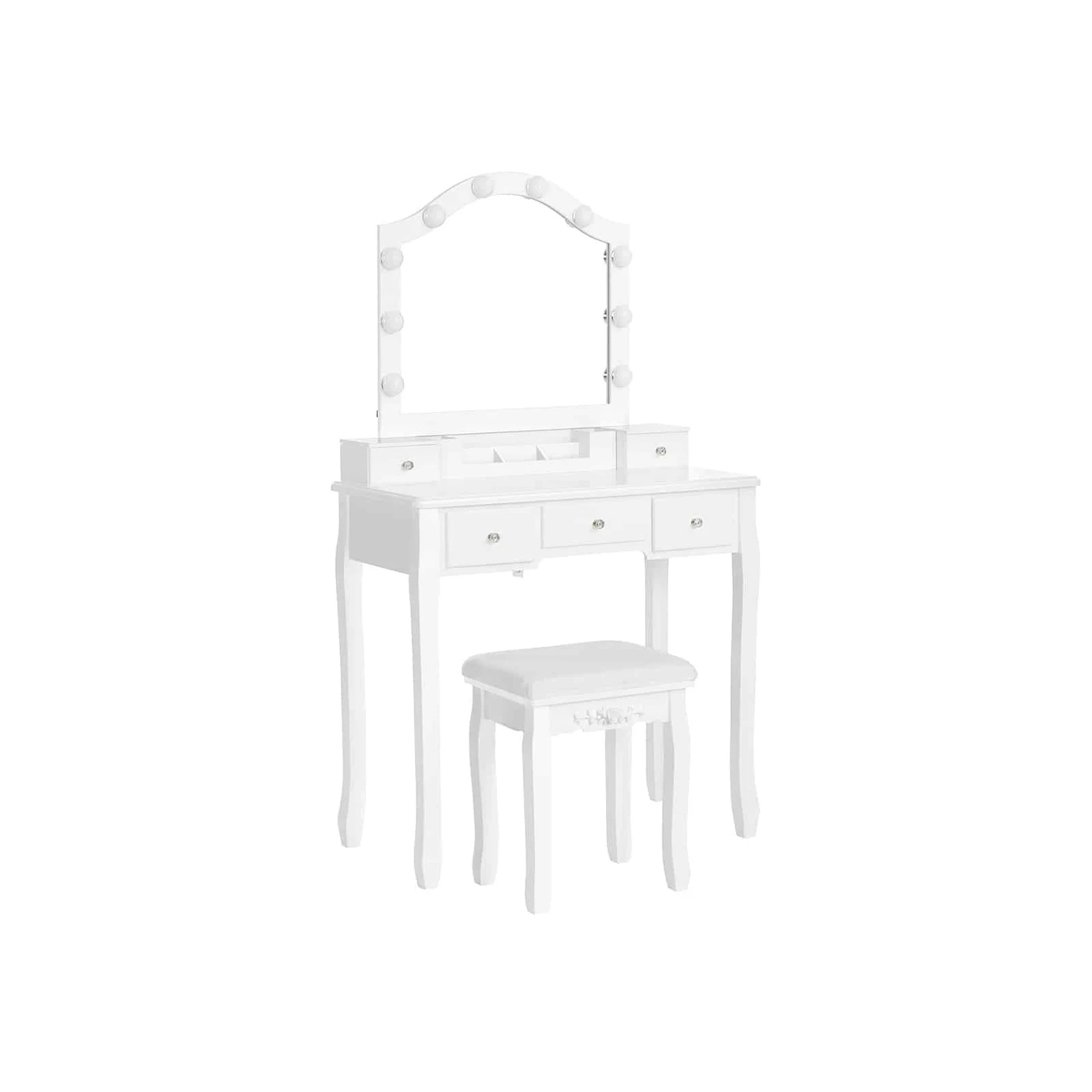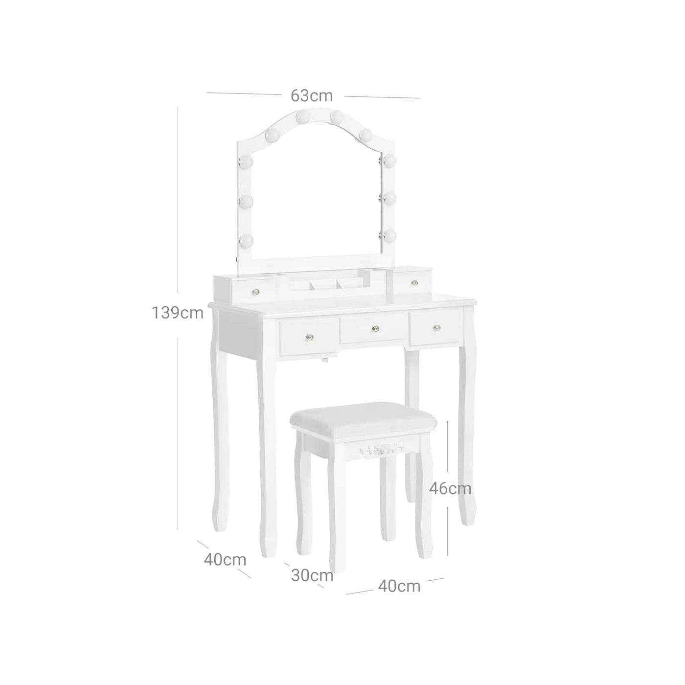 Aprašymas buvo automatiškai išverstas, gali pasitaikyti klaidų.Visada būkite nepriekaištingi Atsisveikinkite su makiažo klaidomis, kurios nepastebimos darant makiažą tamsoje, bet lengvai pastebimos išeinant. 10 pritemdomų lempučių, supančių veidrodį, apšviečia jūsų veidą – sukurkite tobulą makiažą! Magiška dovana Puiki dovanos idėja gimtadienio, Kalėdų ar kito reikšmingo jubiliejaus proga! Šis svajingas tualetinis staliukas su dideliu veidrodžiu, daug vietos daiktams ir patogia kėdute privers nusišypsoti kiekvieną!Išsami informacija apie gaminį:- Spalva: Balta- Medžiaga: MDF (vidutinio tankio medienos plaušų plokštė), pušis, guma, stiklas- Tualeto staliuko dydis: 80 x 40 x 139 cm (P x P x A)- Taburetės dydis: 40 x 30 x 46 cm ( P x P x A) - Svoris: 23,5 kg - Maksimali taburetės statinė apkrova: 130 kg Pristatymo komplektas: - 1 x tualetinis staliukas su veidrodžiu - 1 x taburetė - 1 x priedų paketas - 1 x vadovas (DE, EN, FR, IT , ES) VASAGLE Pastabos: - Saugumo sumetimais vaikams draudžiama lipti ant gaminio ar žaisti su juo. - Saugokite gaminį nuo chemikalų. - Nuvalykite gaminį drėgnu skudurėliu. šluostė kasdieniam valymui.