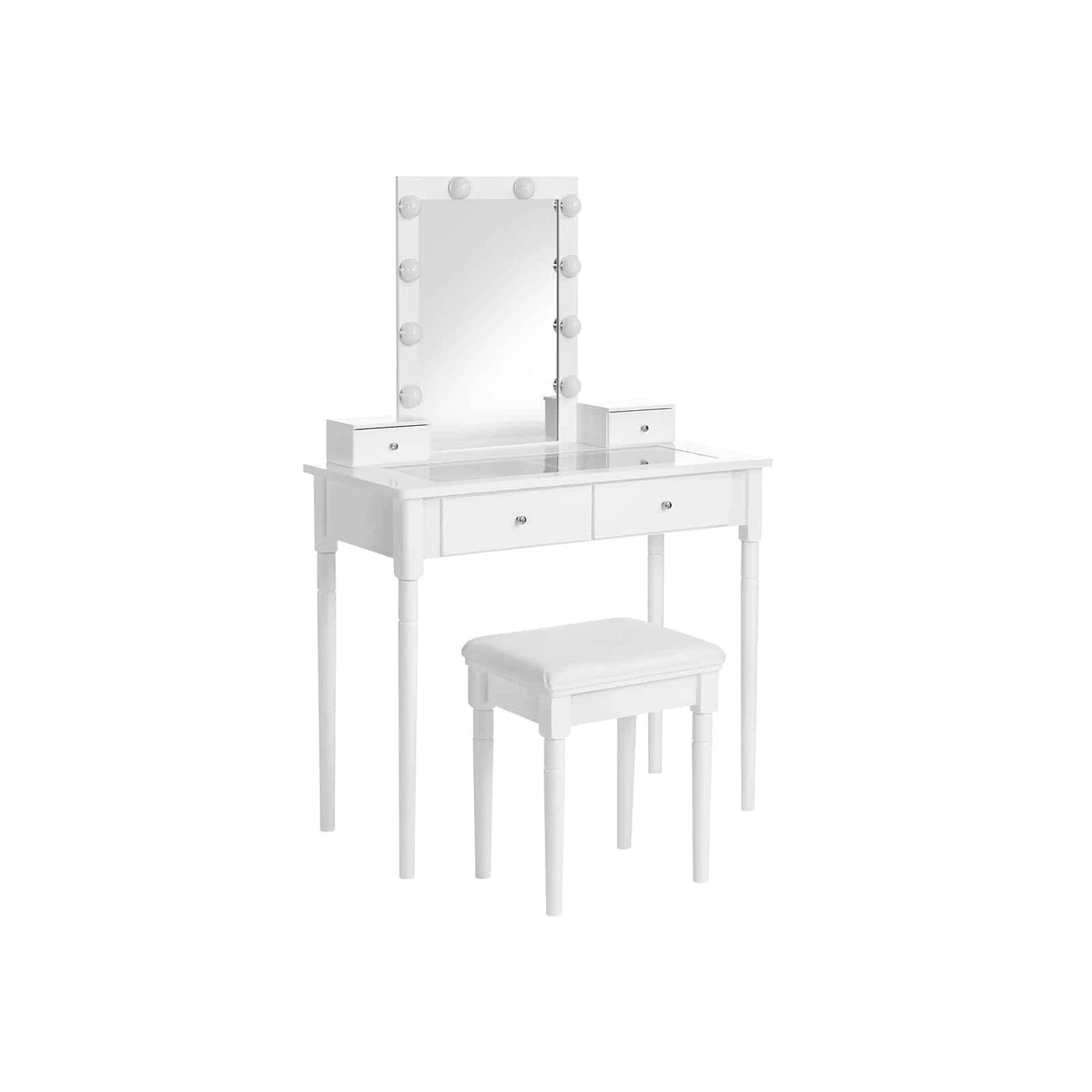 Aprašymas buvo automatiškai išverstas, gali pasitaikyti klaidų.Meilė iš pirmo žvilgsnio Jei vis dar neradote dovanos savo mylimam žmogui, šis tualetinis staliukas su minkšta taburete yra puikus pasirinkimas! Įsivaizduokite, kad jūsų gražuolė apžiūrinėja savo aprangą veidrodyje ir švelniai šypsosi. Ar tavo veide dabar šypsena? Elegantiškas baltas, lygus paviršius, detalus dizainas – Jūsų mylimasis tikrai įsimylės šį tualetinio staliuko komplektą! Slaptas kosmetikos sodas Didelis veidrodis su 10 lempučių užtikrina, kad makiažą atliksite tiksliai. Jūs būsite vakaro žvaigždė arba gražiausia vakarėlio šokėja. 2 stalčiai skaidriais paviršiais leidžia lengvai rasti ir pasirinkti kosmetiką. Tad nesunkiai išsirinkti makiažą, atitinkantį dabartinę nuotaiką. Sukurkite savo kosmetikos sodą pagal savo idėjas ir palikite savo namus aukščiausios kokybės!Išsami informacija apie gaminį: - Spalva: balta - Medžiaga: MDF (vidutinio tankio medienos plaušų plokštė), pušis, guma, stiklas - Tualeto staliuko dydis: 90 x 40 x 133,5 cm (P x P x A) - Taburetės dydis: 40 x 30 x 46 cm (P x P x A) - Svoris: 20,4 kg - Maksimali statinė taburetės apkrova: 130 kg Pristatymo komplektacija: - 1 x tualetinis staliukas su veidrodžiu - 1 x taburetė - 1 x priedų pakuotė - 1 vnt. x vadovas (DE, EN, FR, IT, ES) VASAGLE Pastabos: - Saugumo sumetimais vaikams draudžiama lipti ant gaminio ar žaisti su juo. - Saugokite gaminį nuo cheminių medžiagų. - Kasdieniniam valymui nuvalykite gaminį drėgna šluoste.