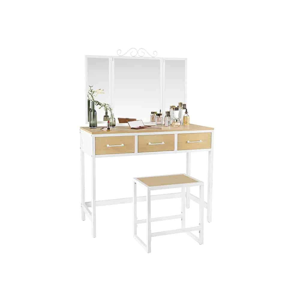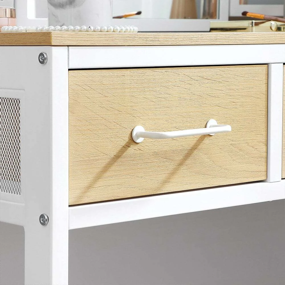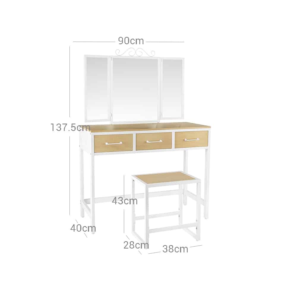 Aprašymas buvo automatiškai išverstas, gali pasitaikyti klaidų.Išsami informacija apie gaminį: - Spalva: natūrali balta - Medžiaga: medžio drožlių plokštė, plienas, stiklas - Tualeto staliuko dydis: 90 x 40 x 137,5 cm (P x P x A) - Aukštos kėdės dydis: 38 x 28 x 43 cm ( Ilgis x P x A) – Svoris: 24,5 kgPristatymo apimtis: - 1 x tualetinis staliukas - 1 x taburetė - 1 x priedų paketas - 1 x vadovas (DE, EN, FR, ES, IT) VASAGLE Pastabos: - Saugumo sumetimais vaikams draudžiama lipti ant gaminio arba žaisti su juo.