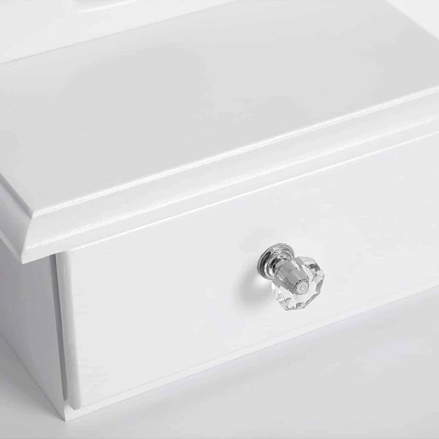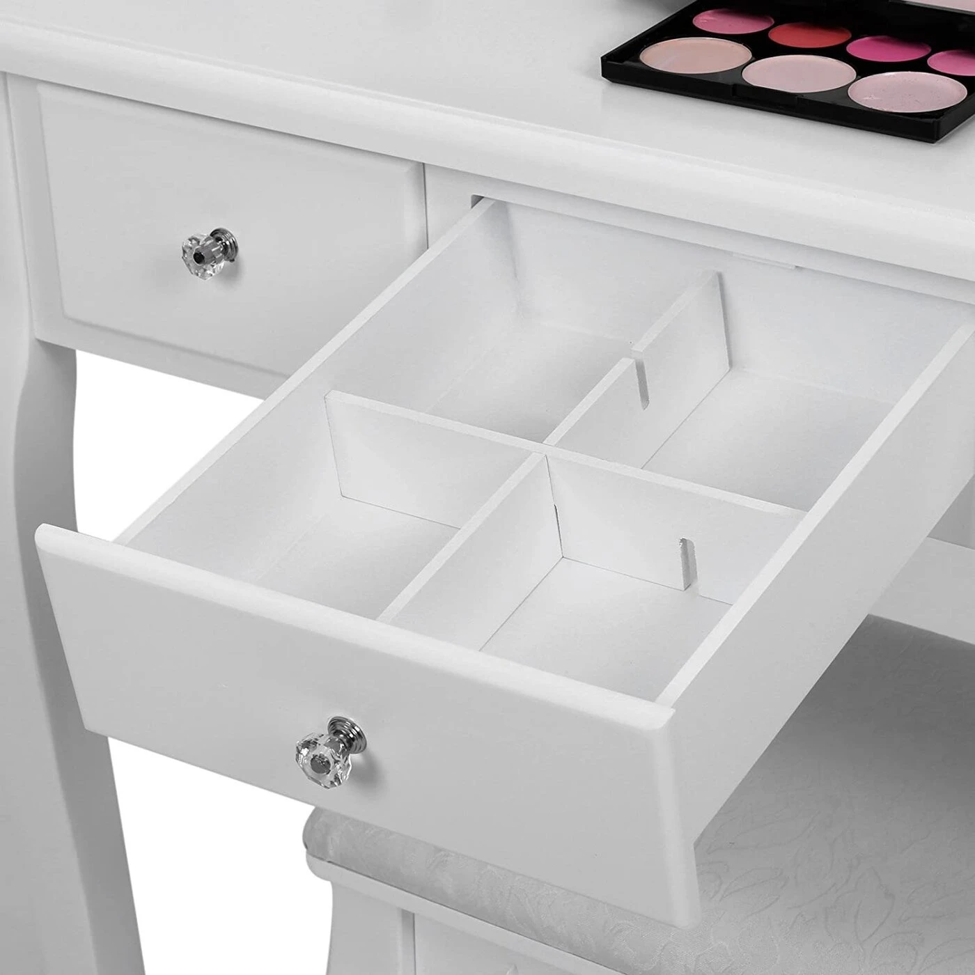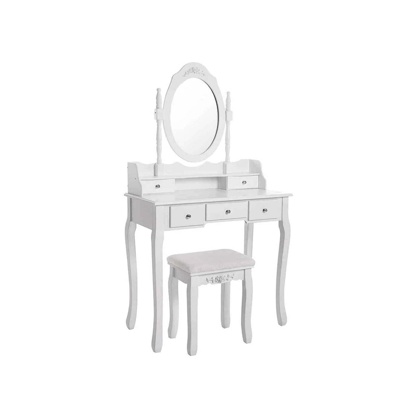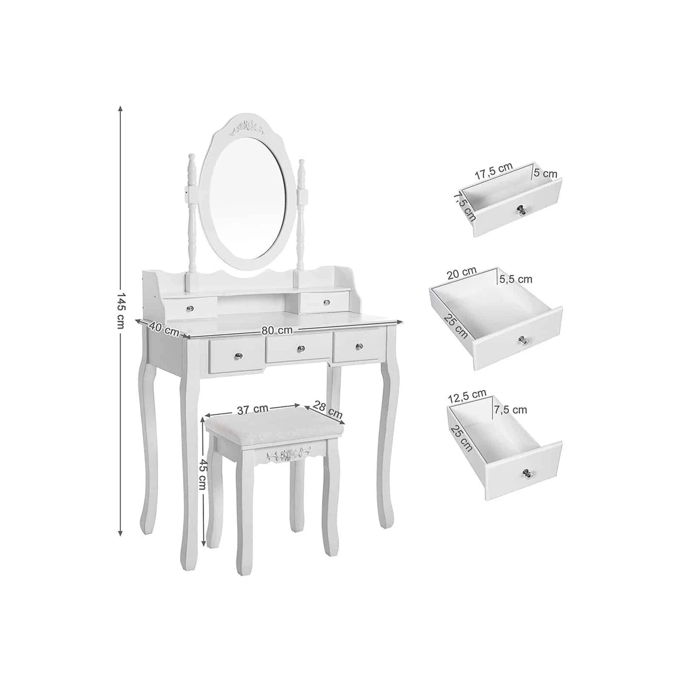 Aprašymas buvo automatiškai išverstas, gali pasitaikyti klaidų.Pristatome Jums kokybišką tualetinį staliuką su 5 stalčiais, atitinkantį Jūsų įvairių kosmetikos reikmenų laikymo poreikius. Songmics visada orientuojasi į klientą ir daro viską, ką gali, kad pasiūlytų aukštos kokybės produktus su geru kainos ir kokybės santykiu Išsami informacija apie produktą: - Matmenys: 80 x 145 x 40 cm (P x A x G) - Stalviršio matmenys: 80 x 40 cm - veidrodžio išmatavimai: 54,5 x 38 cm (P x A) - taburetės matmenys: 37 x 45 x 28 cm (P x A x G) - mažo stalčiaus išmatavimai: 17,5 x 5,5 x 7,5 cm ( P x A x G)- Vidutiniai stalčiaus matmenys: 12,5 x 7,5 x 25 cm (P x A x G)- Didelio stalčiaus matmenys: 20 x 5,5 x 25 cm (P x A x P)- Medžiaga: MDF plokštė (E1 klasė) ) + medžio masyvo- Spalva: baltaPastaba: - Kad taburetė neapvirstų, nesėdėkite ant taburetės krašto. Ir nekratykite taburetės ir tiesiog ant jos nenukriskite. Sėdint visa sėdynė turi būti užimta, o visos 4 kojos visada turi būti ant grindų. - Surinkimui naudokite ne akumuliatorinį atsuktuvą, o komplekte esantį šešiabriaunį raktą. - Paprastai venkite bet kokio paviršiaus kontakto su aštriais ar smailiais objektų, kad būtų išvengta įbrėžimų.- Prieš pradėdami tvarkyti stalą, vadovaukitės priežiūros instrukcijomis. - Kad nebūtų pažeisti išgręžti sriegiai kojose ir varžtai nebūtų kreivi, montuodami kojas varžtus įsukite tik tada, kai visos gręžimo skylės yra sulygiuotos. - Nebandykite naudoti jėgos surinkdami stalo. Tai sugadins daiktą. Iškilus sunkumams, susisiekite su mūsų klientų aptarnavimo tarnyba. Pristatymo apimtis: - 1 x tualetinis staliukas - 1 x taburetė - 1 x furnitūros krepšys (mažame stalviršio stalčiuje) - 1 x instrukcijos (DE, EN, FR, IT, ES)