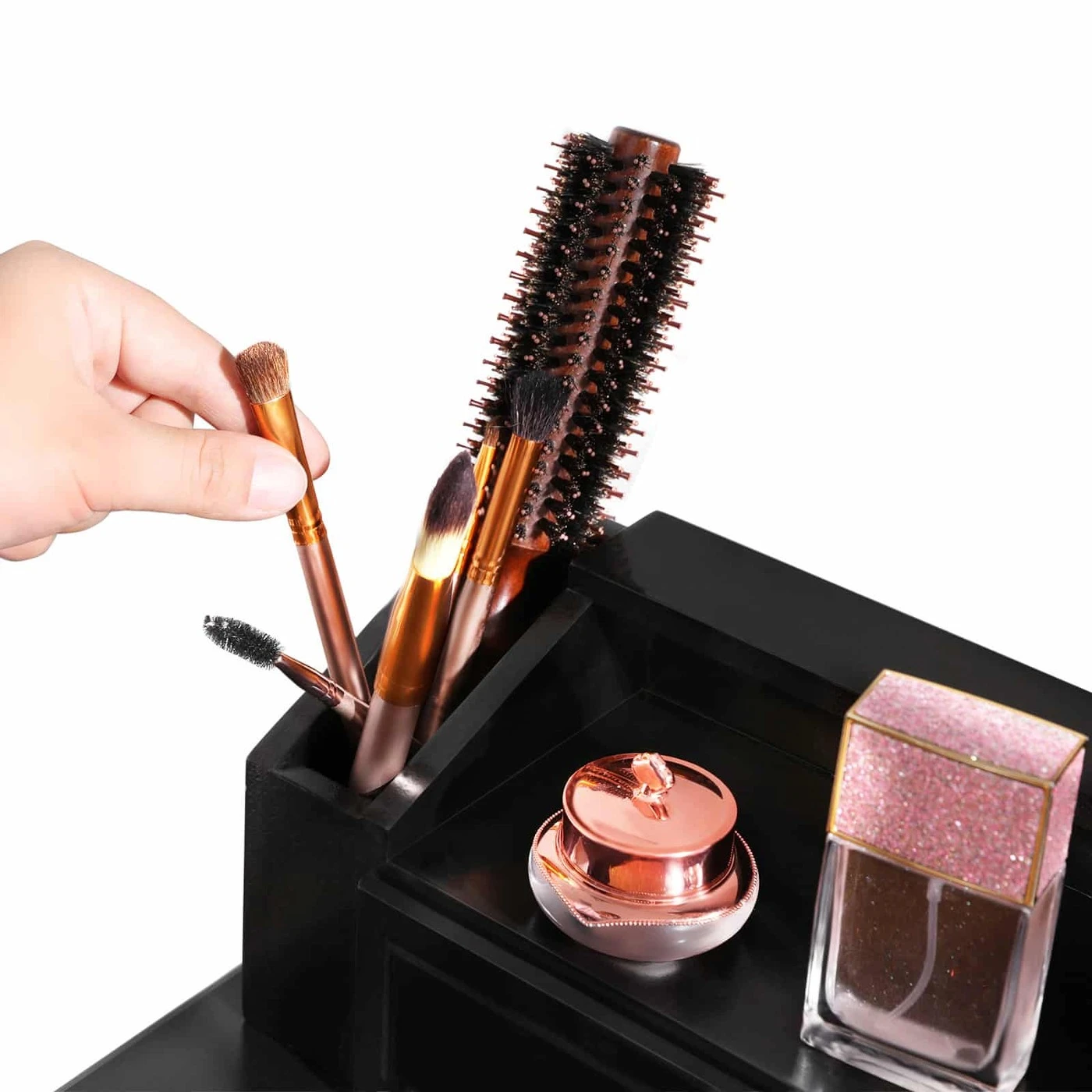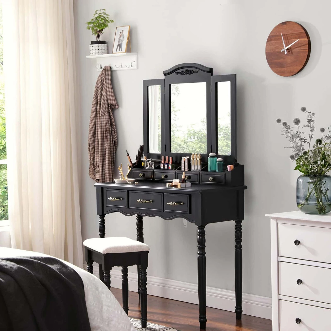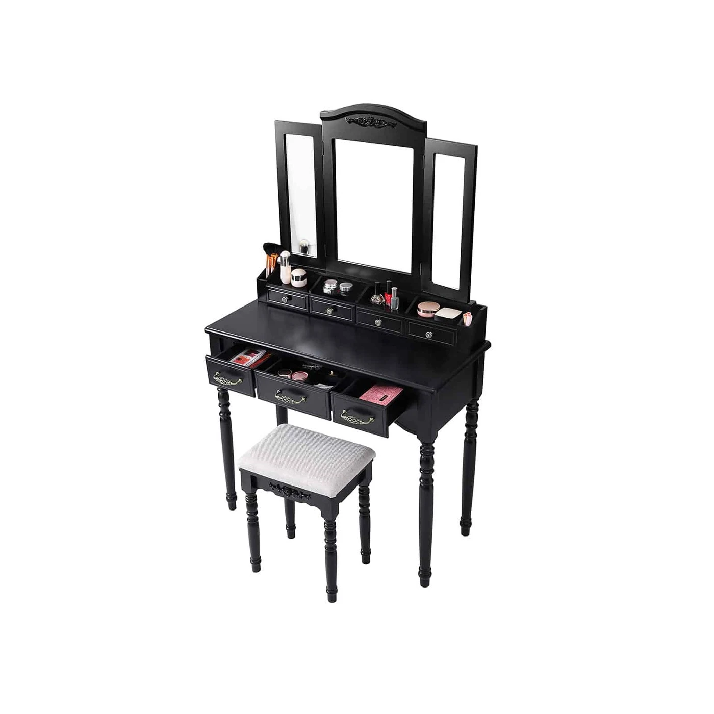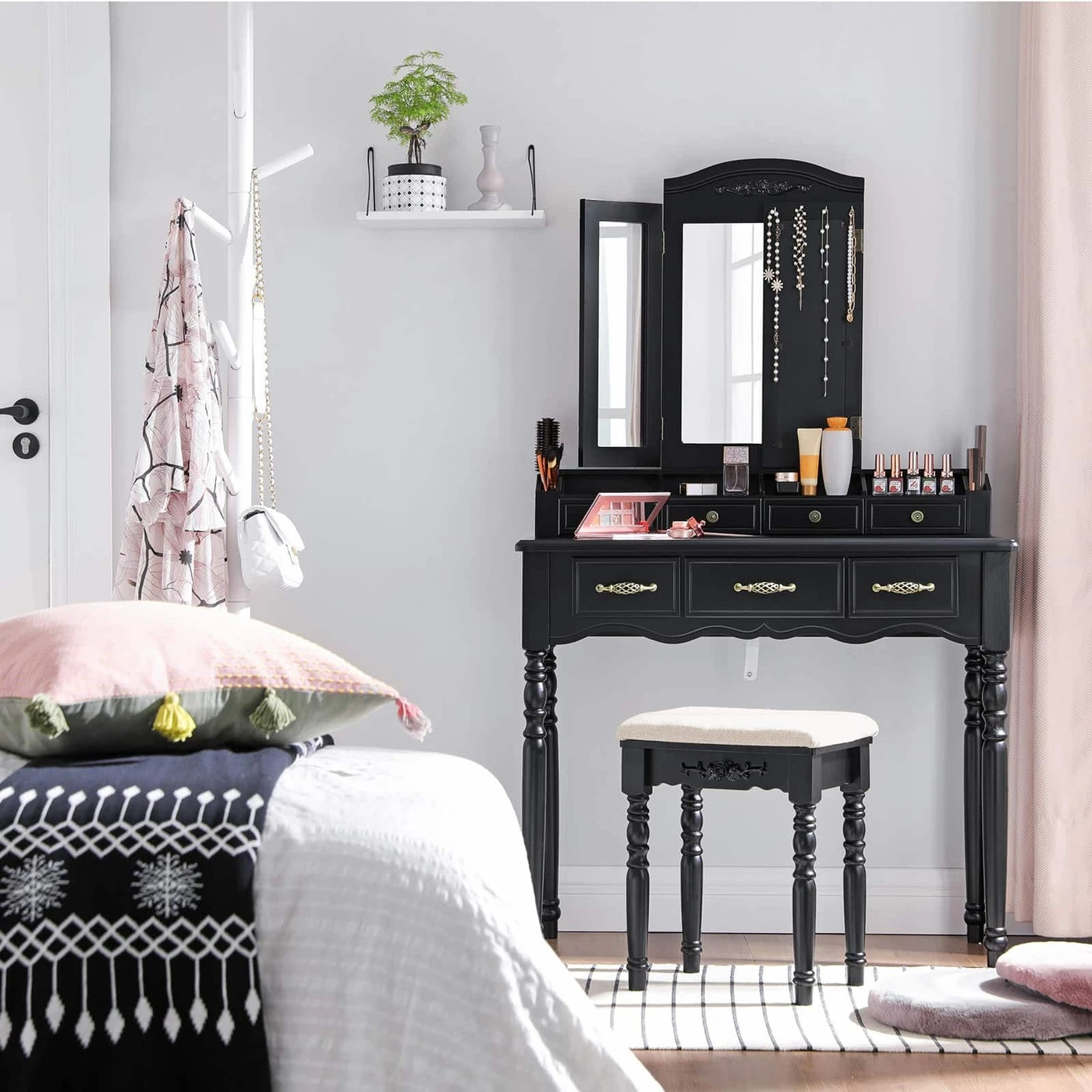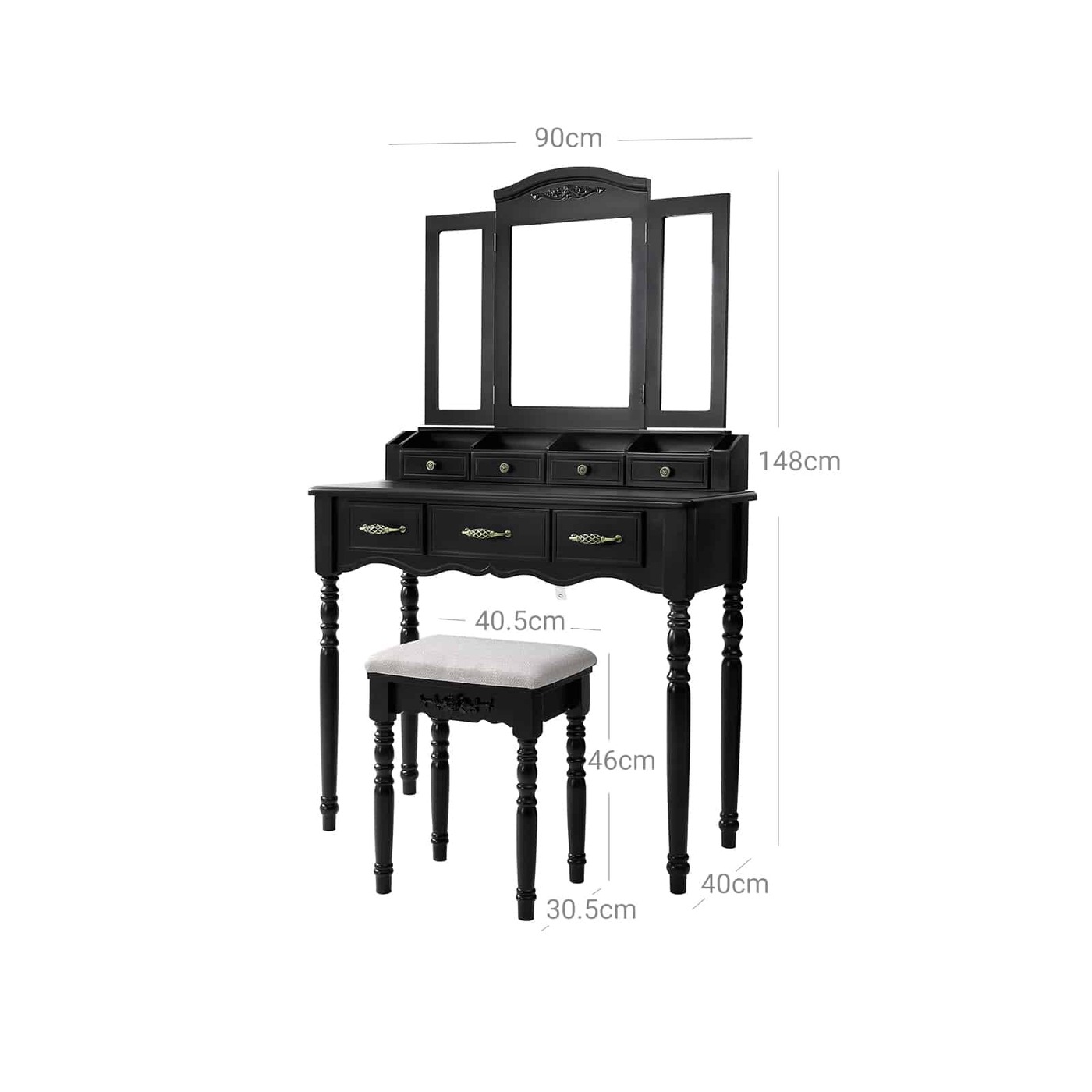 Aprašymas buvo automatiškai išverstas, gali pasitaikyti klaidų.Jei jums reikia klasikinio makiažo stalo komplekto, šis aukštos kokybės, praktiškas ir stilingas VASAGLE kosmetinis staliukas yra tai, ko jums reikia. Vėrinio kabliukas už sulankstomo veidrodžio Trijų dalių veidrodis leidžia matyti savo atspindį iš skirtingų kampų, kai darai makiažą ar formuojasi plaukus. Beje, galbūt nustebsite, kad už veidrodžio rasite 8 kabliukus vėriniams. Lengvas surinkimas Jums nereikės sugaišti kelių valandų surenkant šį tualetinį staliuką, nes korpusas yra iš anksto surinktas. Viskas, ką jums reikia padaryti, tai pritvirtinti kosmetinio staliuko kojeles ir veidrodį. Pasiruošę ryte ir vakare Prieš išvykdami į koledžą ar darbą, galite atsipalaiduoti prie šio tualetinio staliuko, pasidaryti makiažą ir pradėti dieną žinodami, kad atrodote puikiai. Grįžę prie šio stalo galėsite skaityti knygą, atlikti namų darbus ar parašyti ataskaitą.Informacija apie gaminį: - Spalva: Juoda - Medžiaga: MDF (vidutinio tankio medienos plaušų plokštė), guma, pušis - Tualeto staliuko dydis: 90 x 40 x 148 (I x P x A) - Taburetės dydis: 40,5 x 30,5 x 46 cm (P x P x A)- Svoris: 23,6 kg- Maks. statinė taburetės apkrova: 130 kg Pristatymo komplektas:- 1 x tualetinis staliukas su 3 dalių sulankstomu veidrodžiu- 1 x paminkštinta taburetė- 1 x konteineris su priedais- 1 x instrukcijos (DE, EN, FR, IT, ES) VASAGLE Pastabos: - Nelaikykite gaminio ilgą laiką stiprioje saulės šviesoje. - Laikykite gaminį toliau nuo smailių ar aštrių daiktų, pvz., peilių, kad išvengtumėte žalą.