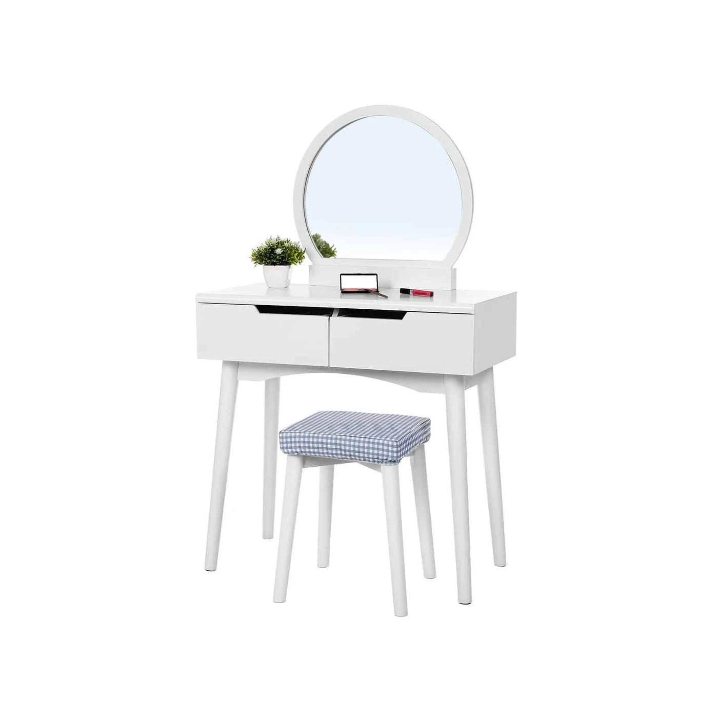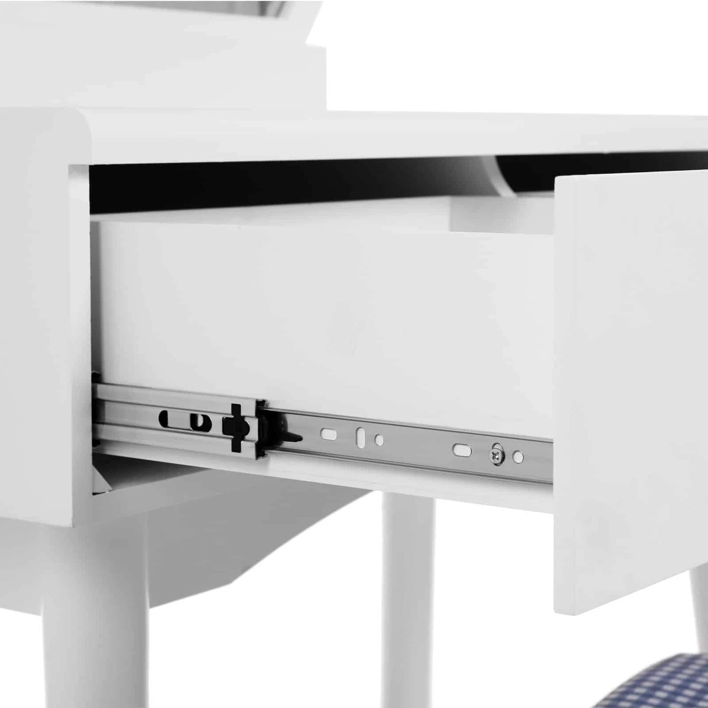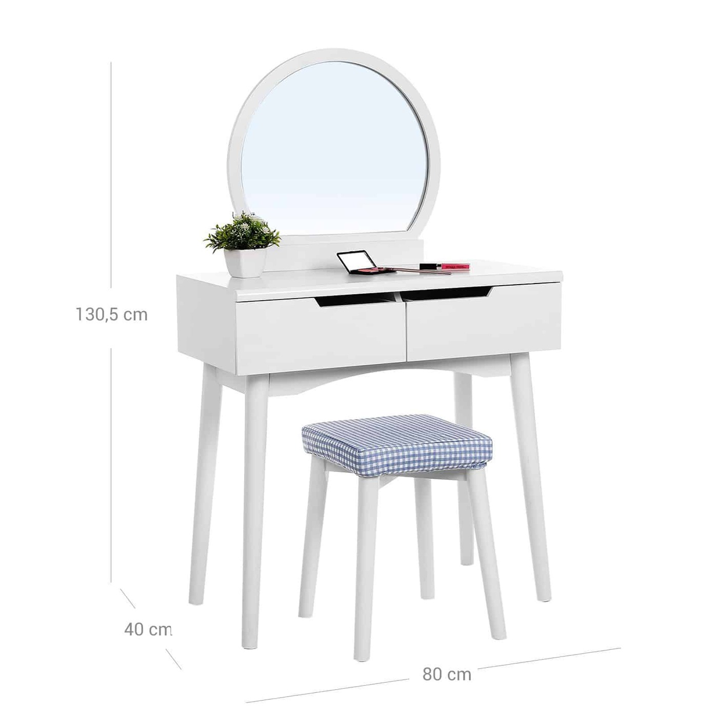 Aprašymas buvo automatiškai išverstas, gali pasitaikyti klaidų.Gaminio informacija: Spalva: balta Medžiaga: MDF plokštė, pušis, guma Matmenys: 80 x 128 x 40 cm (tualetinis staliukas), 32,5 x 45,5 x 32,5 cm (taburetė) Svoris: 20,1 kg Pristatymo komplektas: 1 x tualetinis staliukas 1 x veidrodis 1 x taburetė 1 x instrukcijos (DE, EN, IT, FR, ES)