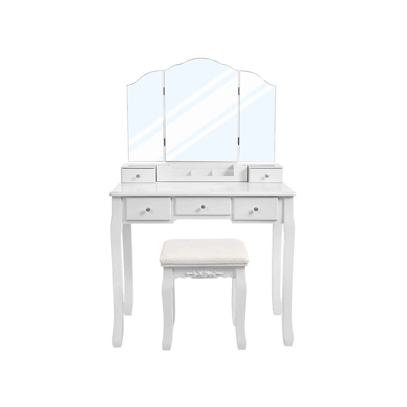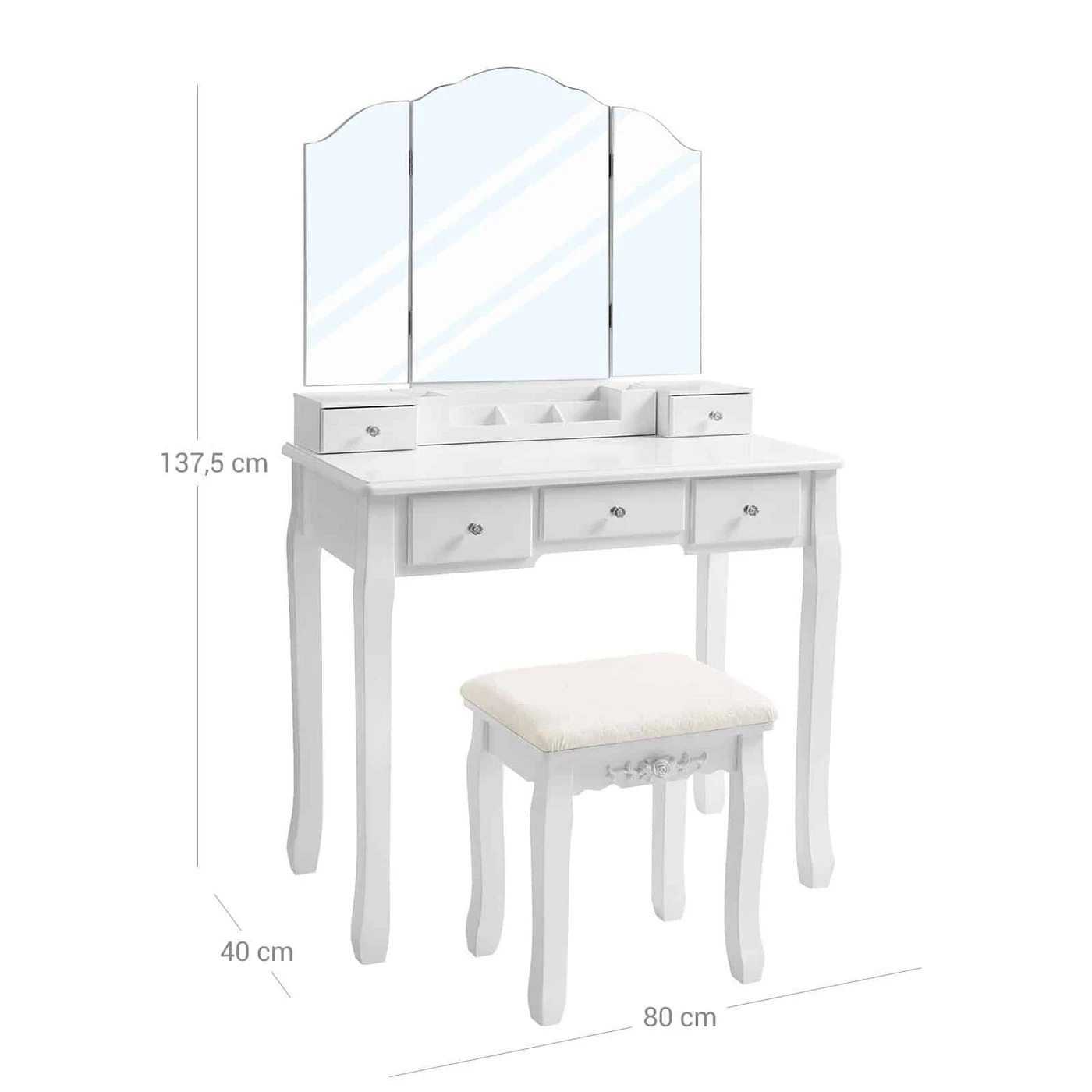 Aprašymas buvo automatiškai išverstas, gali pasitaikyti klaidų.Palaima bet kuriam makiažo entuziastui – su medžio masyvo kojomis ir tvirtu MDF stalviršiu. Taburetė yra visiškai pagaminta iš tvirtos gumos.- 3 dalių veidrodis leidžia matyti savo atspindį įvairiais kampais. Tai palengvins jūsų kasdienį stilių ir pakels nuotaiką.- 5 stalčiai ir nuimama daiktadėžė suteikia daug vietos ir leidžia lengvai pasiekti būtiniausius grožio daiktus.- Didelė erdvė kojoms suteikia daug vietos kojoms, todėl galite laisvai judėti. Jūs pasitepate makiažą arba formuojate plaukus. - Būtina surinkti! Tačiau dėl iš anksto surinkto korpuso jums tereikia pritvirtinti kosmetinio staliuko kojeles ir veidrodį.Jei jums reikia modernaus, funkcionalaus makiažo stalo komplekto, šis kosmetinis staliukas iš VASAGLE yra kaip tik tai, ko jums reikia.Išsami informacija apie gaminį: - Spalva: balta - Medžiaga: MDF (vidutinio tankio medienos plaušų plokštė), gumos mediena, pušies mediena - Tualeto staliuko dydis: 80 x 40 x 137,5 (P x P x A) - Taburetės dydis: 40 x 30 x 50 cm (P x P x A)- Svoris: 26 kg- Maksimali statinė taburetės apkrova: 130 kg Pristatymo komplektas:- 1 x tualetinis staliukas su 3 dalių sulankstomu veidrodžiu- 1 x paminkštinta taburetė- 1 x talpykla su priedais - 1 x instrukcijos (DE, EN, FR, IT, ES) VASAGLE Pastabos: - Nelaikykite gaminio ilgą laiką stiprioje saulės šviesoje. - Saugokite gaminį nuo smailių ar aštrių daiktų, pvz., peilių. išvengti žalos.