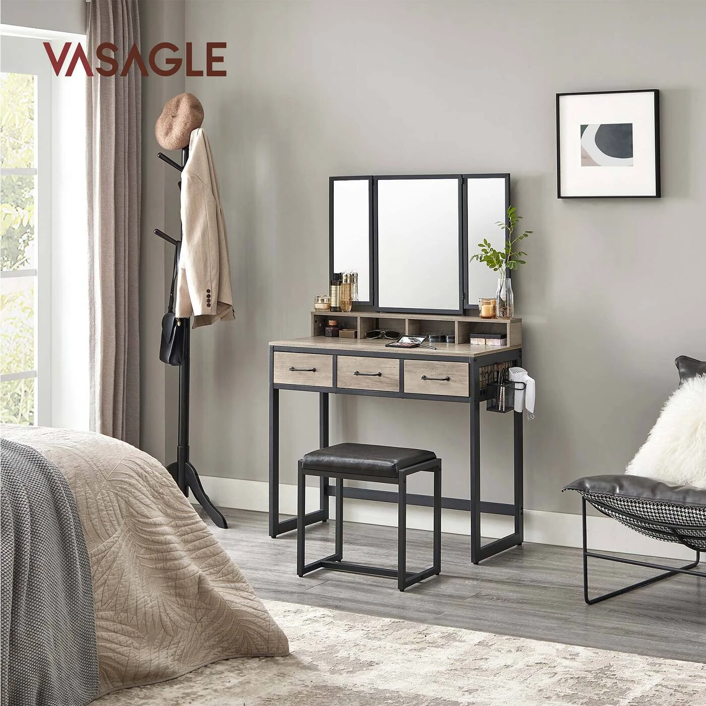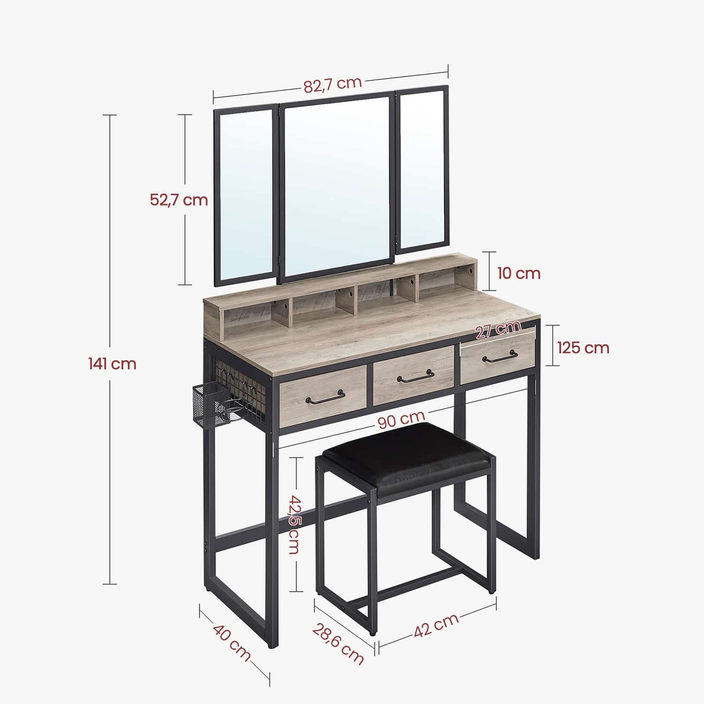 Aprašymas buvo automatiškai išverstas, gali pasitaikyti klaidų. Išsami informacija apie gaminį: - Spalva: pilkai juoda - Medžiaga: medžio drožlių plokštė, plienas, stiklas, dirbtinė oda, putplastis - Tualeto staliuko dydis: 90 x 40 x 141 cm (P x P x A) - Taburetės dydis: 42 x 28,6 x 42 ,5 cm (P x P x A) - Svoris: 25,7 kg - Maksimali taburetės statinė apkrova: 150 kgPristatymo komplektas: - 1 x tualetinis staliukas - 1 x taburetė - 1 x priedų paketas - 1 x instrukcijaVASAGLE Pastabos: - Saugumo sumetimais vaikams draudžiama lipti ant gaminio ar žaisti su juo. - Didžiausia statinė apkrova taburetė sveria 150 kg. Prašome neviršyti svorio limito.