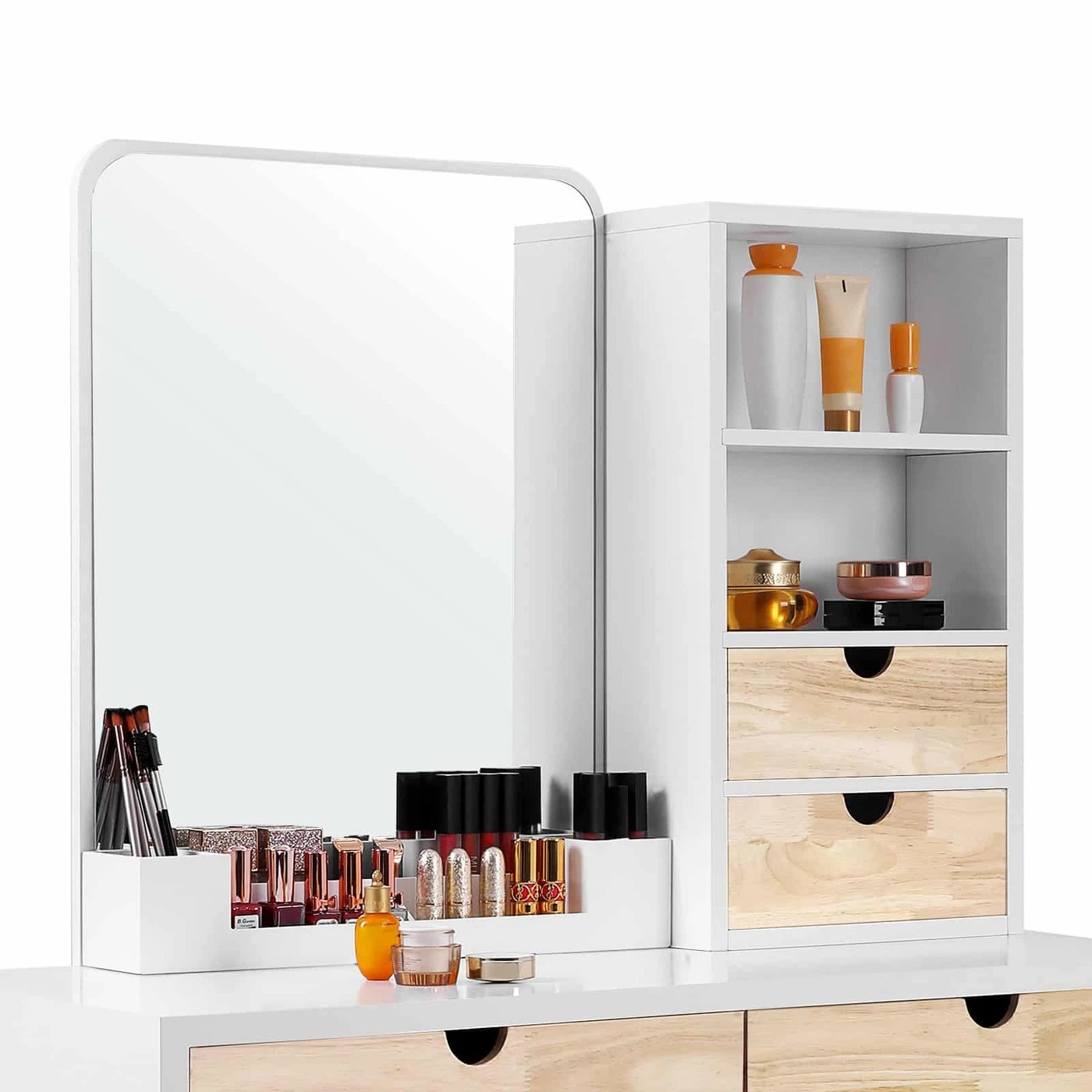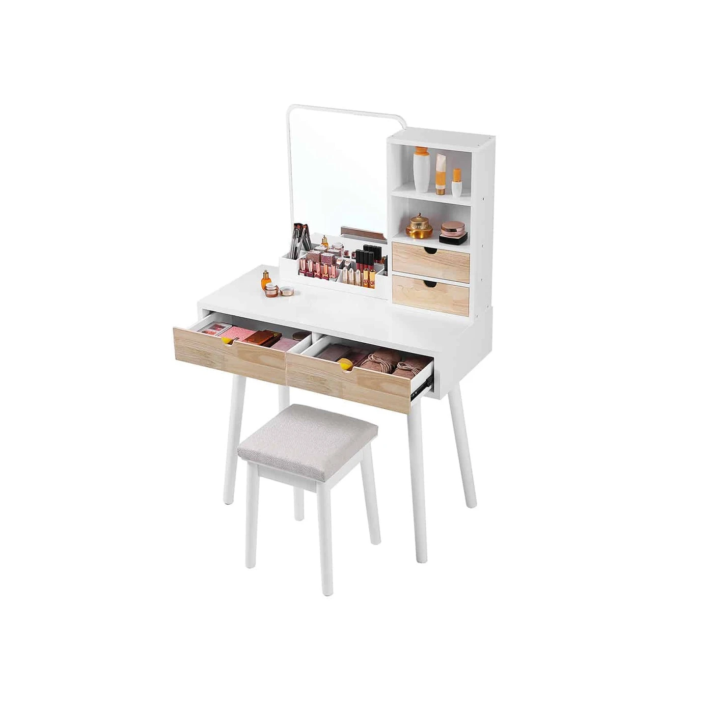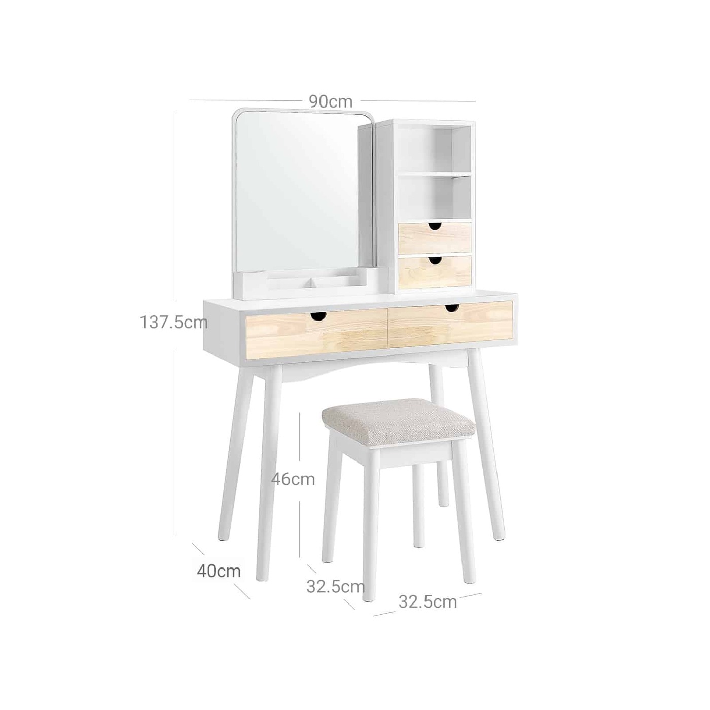 Aprašymas buvo automatiškai išverstas, gali pasitaikyti klaidų.Atsiduokite savo grožiui. Ryte prieš išeidami iš namų pasidarykite tobulą makiažą, o vakare prieš miegą vėl nuvalykite. Dėl didelio stalviršio, 2 atvirų ir uždarų skyrių, 1 nuimamo tvarkyklės ir 2 gilių stalčių šis makiažo stalas yra puikus pagalbininkas jūsų kasdienėje grožio rutinoje Patikimas partneris Šis makiažo stalas ne tik stebina savo nesenstanti išvaizda, bet ir tvirtas gumos ir MDF medžiagų derinys. Savo grožio priemones galite saugiai laikyti šios lentelės elementuose ir ant jų. Atsisėskite ant arklidės ir grožėkitės dideliame veidrodyje!Specifikacijos: - Spalva: balta, natūrali. - Medžiaga: MDF (vidutinio tankio medienos plaušų plokštė), guma, stiklas - Tualeto išmatavimai: 90 x 40 x 146 cm (P x P x A). - Taburetės dydis: 32,5 x 32,5 x 46 cm (I x P x A). - Gaminio svoris: 35,3 kg. - Max Statinė taburetės apkrova: 130 kg Pakuotės turinys: - 1 x tualetinis staliukas su veidrodžiu - 1 x taburetė. - 1 x priedų rinkinys. - 1 x apsaugos nuo apsivertimo komplektas. - 1 x instrukcija (galbūt ne vokiečių kalba).VASAGLE Pastabos: - Saugumo sumetimais vaikams neleidžiama lipti ar žaisti ant gaminio. - Kasdieniniam valymui šį gaminį nuvalykite švaria šluoste. - Saugokite šį gaminį nuo aštrių ir smailių daiktų, kad nepažeistumėte paviršiaus.