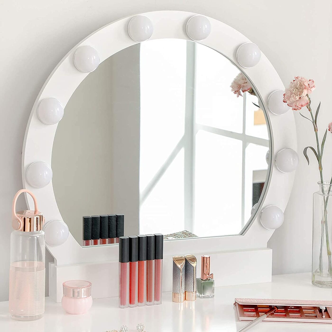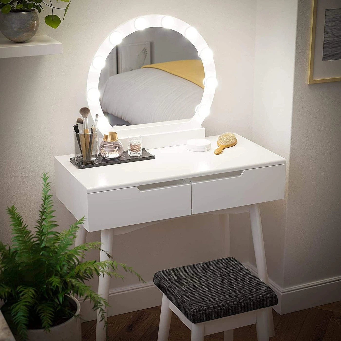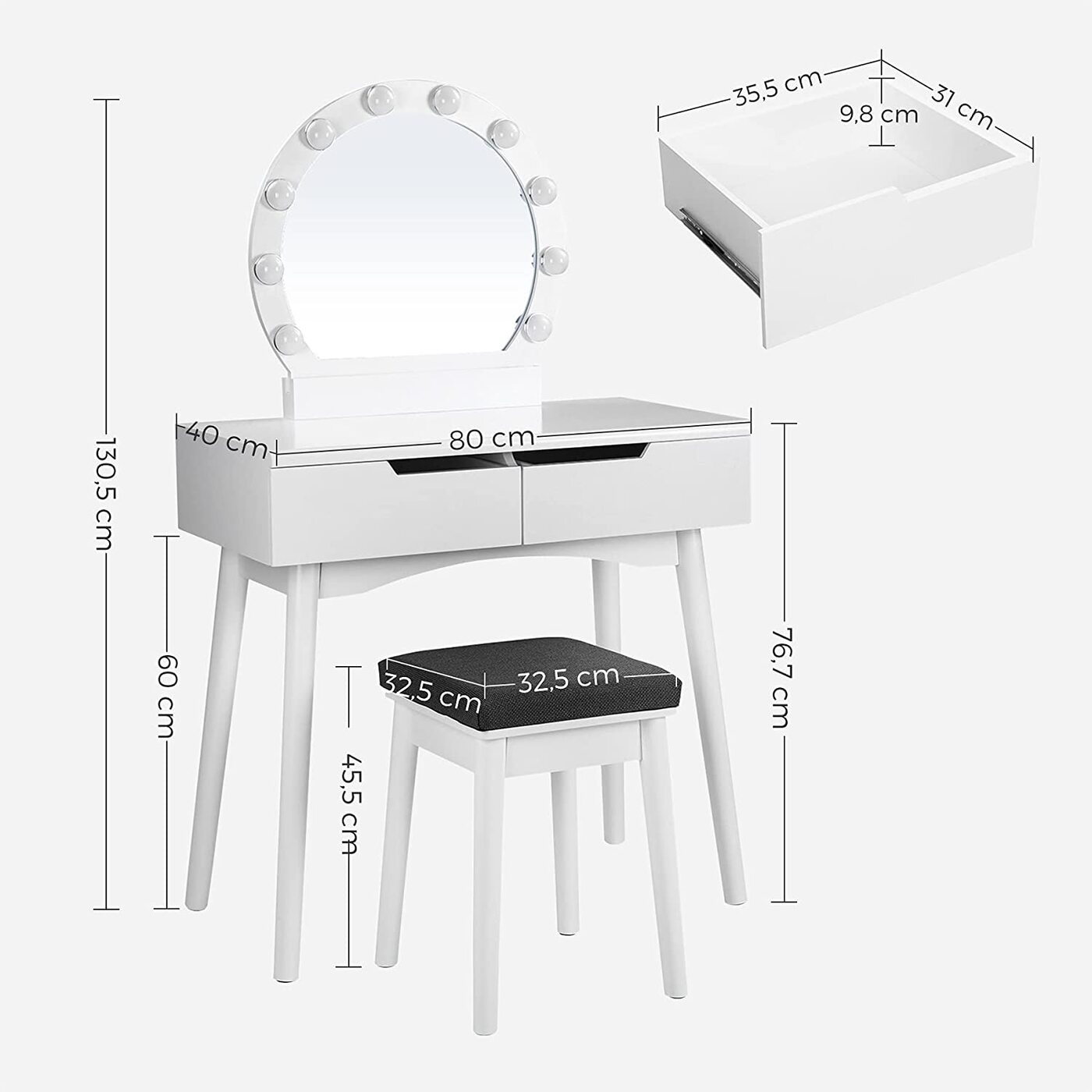 Aprašymas buvo automatiškai išverstas, gali pasitaikyti klaidų.Jei ryte stovite prieš kalną higienos reikmenų, makiažo, makiažo šepetėlių ir kitų reikmenų, pats metas kurti tvarką!Su šiuo šviečiančiu tualetiniu stalu galėsite ne tik susidėti visus svarbius priedus. Jūs taip pat gausite savo grožio zoną, kuri, atrodo, atsirado iš Holivudo filmo Tobulas apšvietimas tobulam makiažui Lemputės ne tik pagražina apskritą veidrodį. Verčiau taip pat pasirūpinkite, kad būtų pakankamai šviesos, kai norite pasidaryti makiažą ar pažvelgti į veido detales. Tai reiškia, kad jums nereikės pirkti papildomo makiažo veidrodžio ar papildomos lempos. Lengviausias dalykas yra surinkimas. Žinoma, nenorime, kad pyktumėte dėl mūsų gaminių. Dėl šios priežasties norime surinkimo procesas jums būtų kuo nesudėtingesnis. Tiesiog surinkite kojeles, veidrodį ir lemputes – viskas!Išsami informacija apie gaminį: - Spalva: Balta - Medžiaga: MDF (vidutinio tankio medienos plaušų plokštė), pušies mediena (stalo kojos), gumos mediena (taburetės kojelės) - Stalo dydis: 80 x 40 x 130,5 cm (P x P x A) - Taburetės dydis : 32,5 x 32,5 x 45,5 cm (I x P x A) - Svoris: 20,1 kg Pristatymo apimtis: - 1 x tualetinis staliukas - 1 x veidrodis - 1 x taburetė - 11 x lempučių - 1 x talpykla su varžtais - 1 x instrukcija