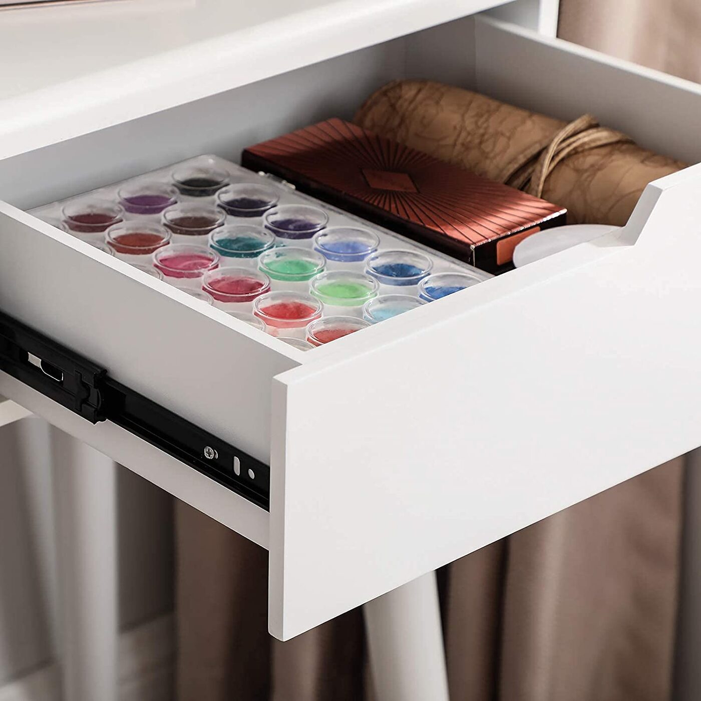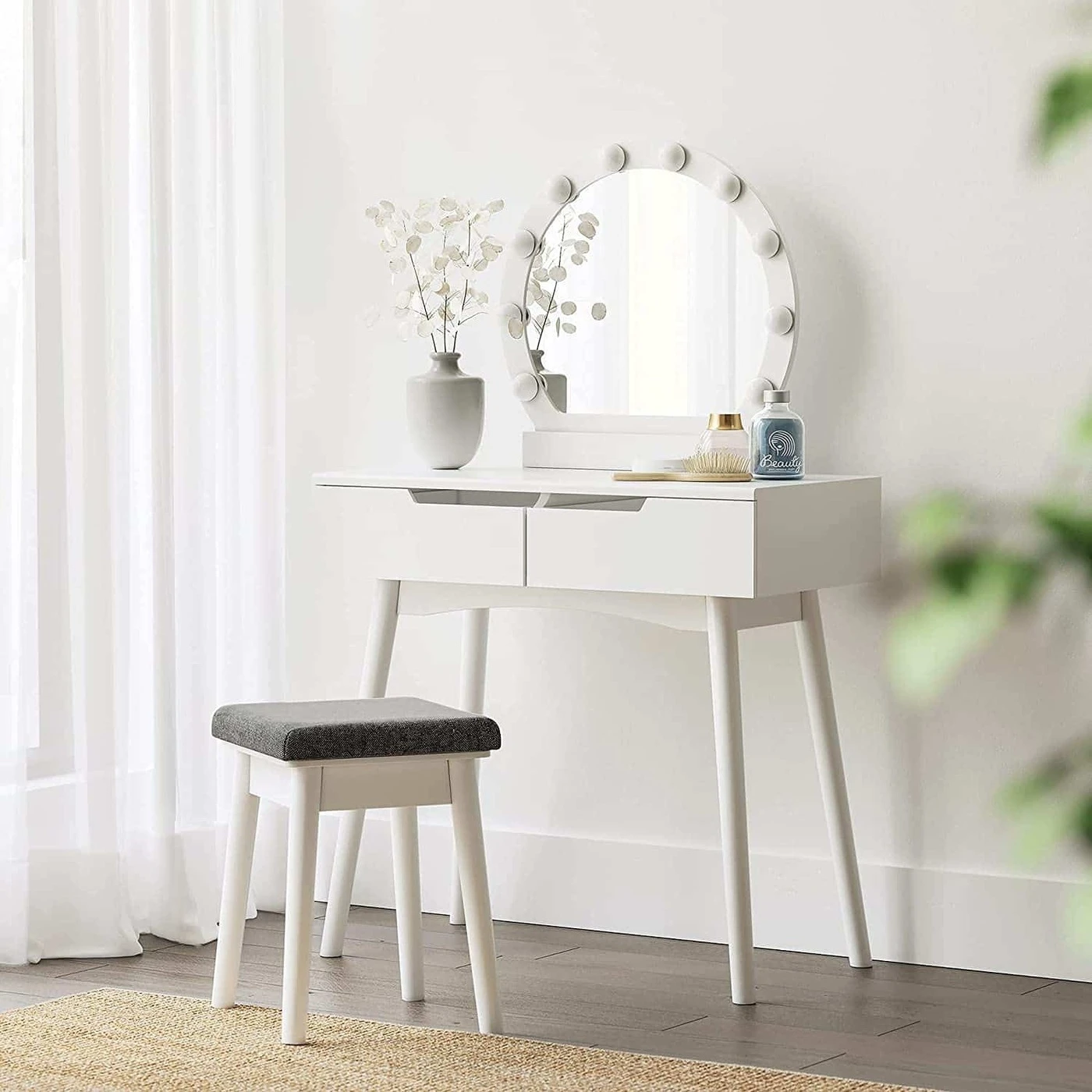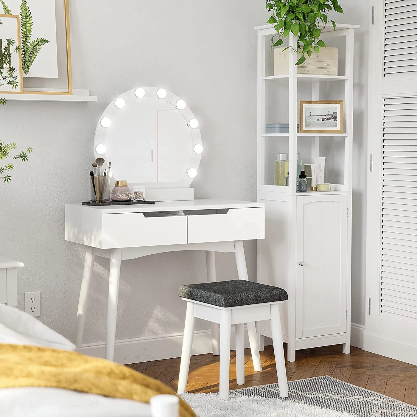 Aprašymas buvo automatiškai išverstas, gali pasitaikyti klaidų.Jei ryte stovite prieš kalną higienos reikmenų, makiažo, makiažo šepetėlių ir kitų reikmenų, pats metas kurti tvarką!Su šiuo šviečiančiu tualetiniu stalu galėsite ne tik susidėti visus svarbius priedus. Jūs taip pat gausite savo grožio zoną, kuri, atrodo, atsirado iš Holivudo filmo Tobulas apšvietimas tobulam makiažui Lemputės ne tik pagražina apskritą veidrodį. Verčiau taip pat pasirūpinkite, kad būtų pakankamai šviesos, kai norite pasidaryti makiažą ar pažvelgti į veido detales. Tai reiškia, kad jums nereikės pirkti papildomo makiažo veidrodžio ar papildomos lempos. Lengviausias dalykas yra surinkimas. Žinoma, nenorime, kad pyktumėte dėl mūsų gaminių. Dėl šios priežasties norime surinkimo procesas jums būtų kuo nesudėtingesnis. Tiesiog surinkite kojeles, veidrodį ir lemputes – viskas!Išsami informacija apie gaminį: - Spalva: Balta - Medžiaga: MDF (vidutinio tankio medienos plaušų plokštė), pušies mediena (stalo kojos), gumos mediena (taburetės kojelės) - Stalo dydis: 80 x 40 x 130,5 cm (P x P x A) - Taburetės dydis : 32,5 x 32,5 x 45,5 cm (I x P x A) - Svoris: 20,1 kg Pristatymo apimtis: - 1 x tualetinis staliukas - 1 x veidrodis - 1 x taburetė - 11 x lempučių - 1 x talpykla su varžtais - 1 x instrukcija