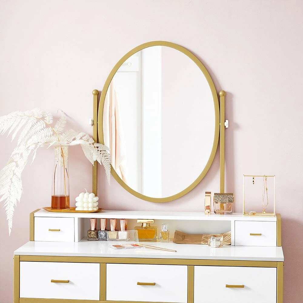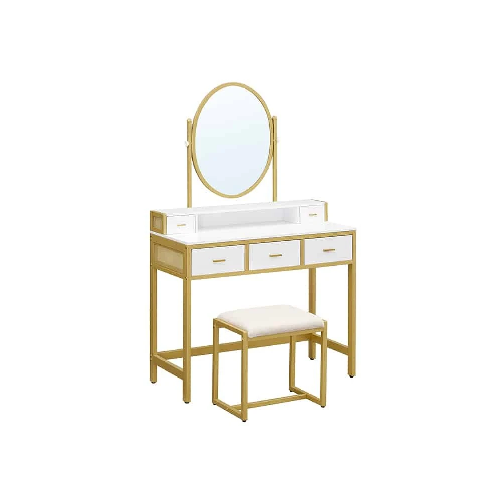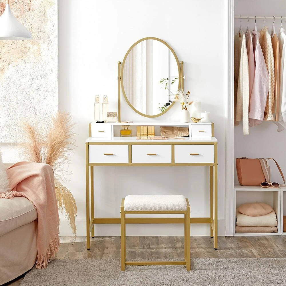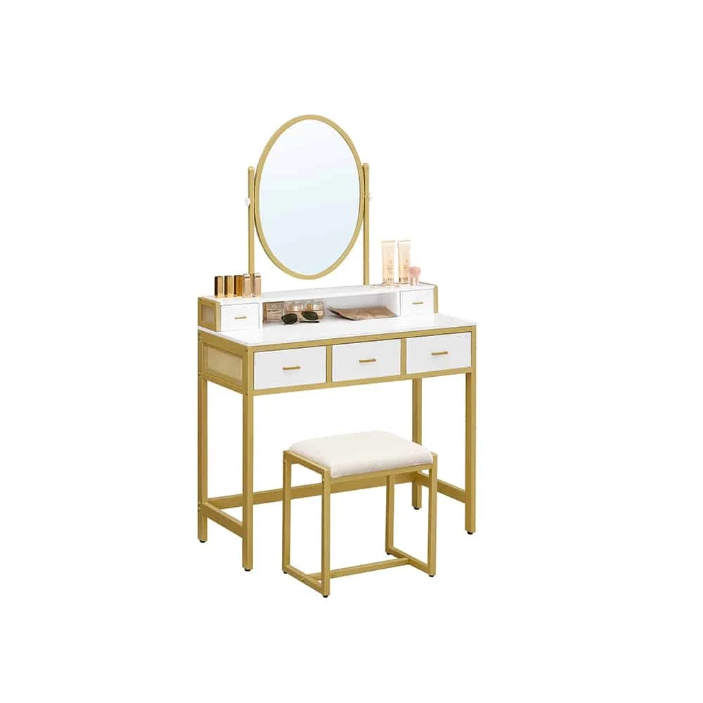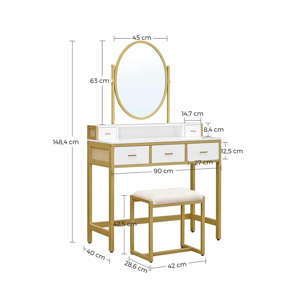 Aprašymas buvo automatiškai išverstas, gali pasitaikyti klaidų.Išsami informacija apie gaminį: - Spalva: baltas auksas - Medžiaga: medžio drožlių plokštė, plienas, stiklas - Tualeto staliuko dydis: 90 x 40 x 148,4 cm (P x P x A) - Svoris: 22,5 kg - Maksimali statinė taburetės apkrova: 150 kg Pristatymo komplektas: - 1 x tualetinis staliukas - 1 x taburetė - 1 x apsauga nuo apvirtimo - 1 x priedų pakuotė - 1 x instrukcijosVASAGLE Pastabos:- Saugumo sumetimais vaikams draudžiama lipti ant gaminio ar žaisti su juo.- Maksimali taburetės statinė apkrova yra 150 kg. Neviršykite šio maksimalaus svorio. - Pritvirtinkite gaminį prie sienos naudodami pateiktą apsaugą nuo apvirtimo, kad užtikrintumėte saugumą naudojimo metu.
