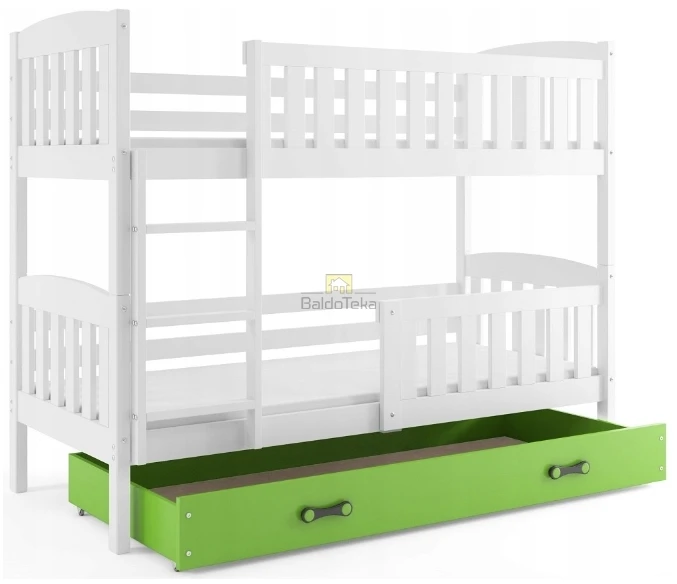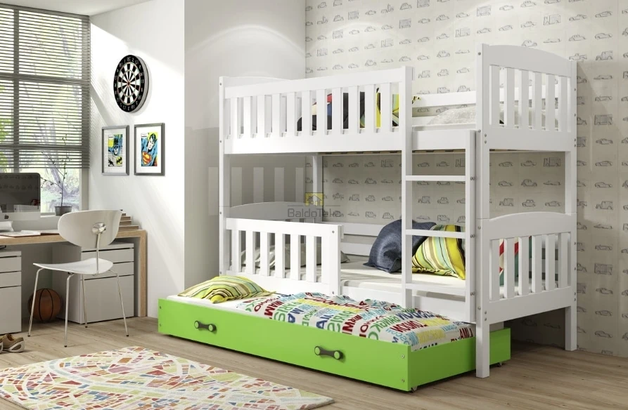 Su poliuretaniais čiužiniais, patalynės dėže ir apsaugine tvorele.