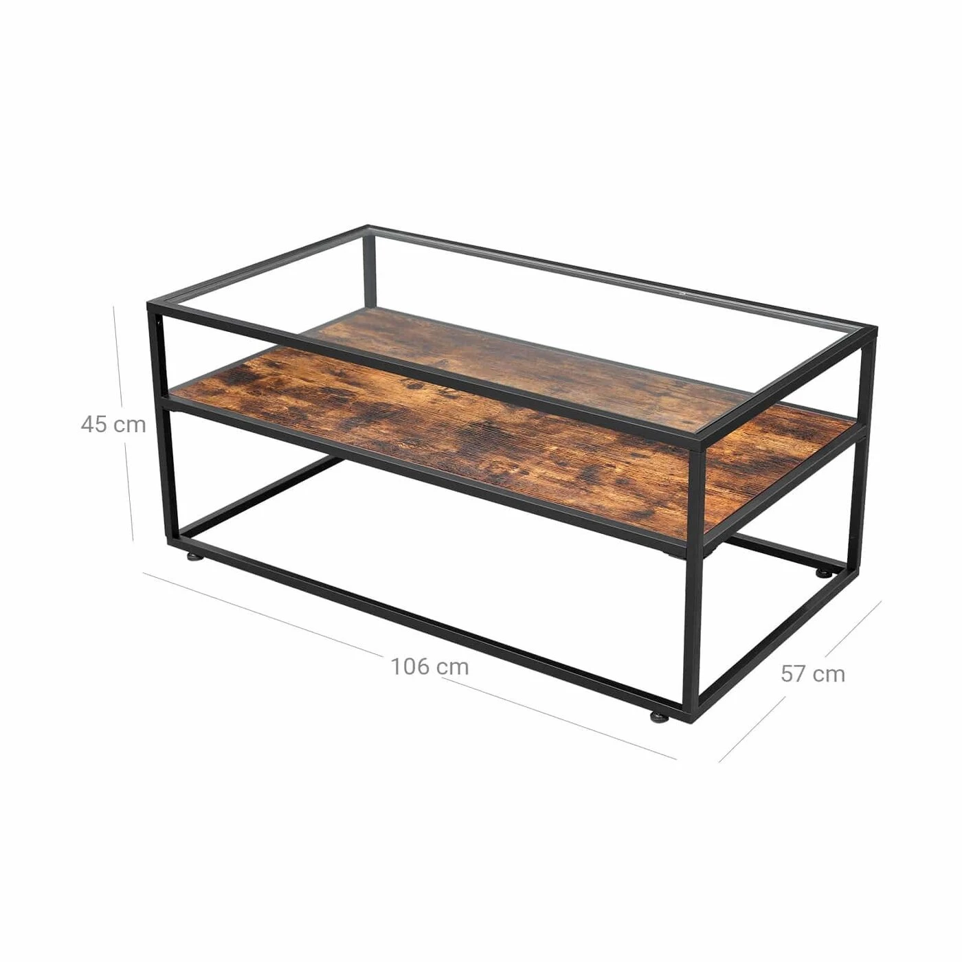 Aprašymas buvo automatiškai išverstas, gali pasitaikyti klaidų.Prekės informacija: - Spalva: vintažinė ruda-juoda - Medžiaga: medžio drožlių plokštė, plienas, grūdintas stiklas - Dydis: 106 x 57 x 45 cm (P x P x A) - Svoris: 18,8 kg - Maksimali statinė stiklo paviršiaus apkrova: 30 kg Pristatymo komplektas: - 1 x kavos staliukas su stikliniu paviršiumi - 1 x priedų paketas - 1 x instrukcija (DE,EN,ES,FR,IT)VASAGLE Pastabos:- Saugumo sumetimais vaikams neleidžiama laipioti ar žaisti su produktu.