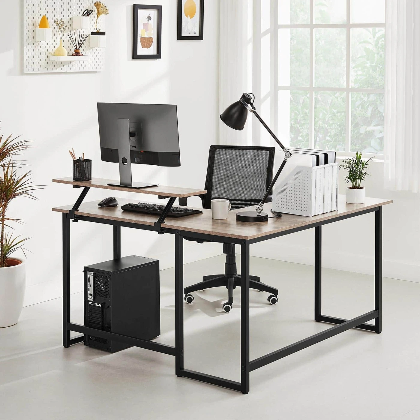 Aprašymas buvo automatiškai išverstas, gali pasitaikyti klaidų.Išsami informacija apie gaminį: - Spalva: pilkai juoda - Medžiaga: medžio drožlių plokštės, plienas - Dydis: 140 x 130 x 76/91,5 cm (P x P x A) - Svoris: 26 kg - Maksimali statinė apkrova: 50 kgPristatymo komplektas: - 1 x kampinis stalas - 1 x priedų paketas - 1 x vadovas (DE, EN, FR, ES, IT) VASAGLE Pastabos: - Saugumo sumetimais vaikams draudžiama lipti ant gaminio ar žaisti su juo .
