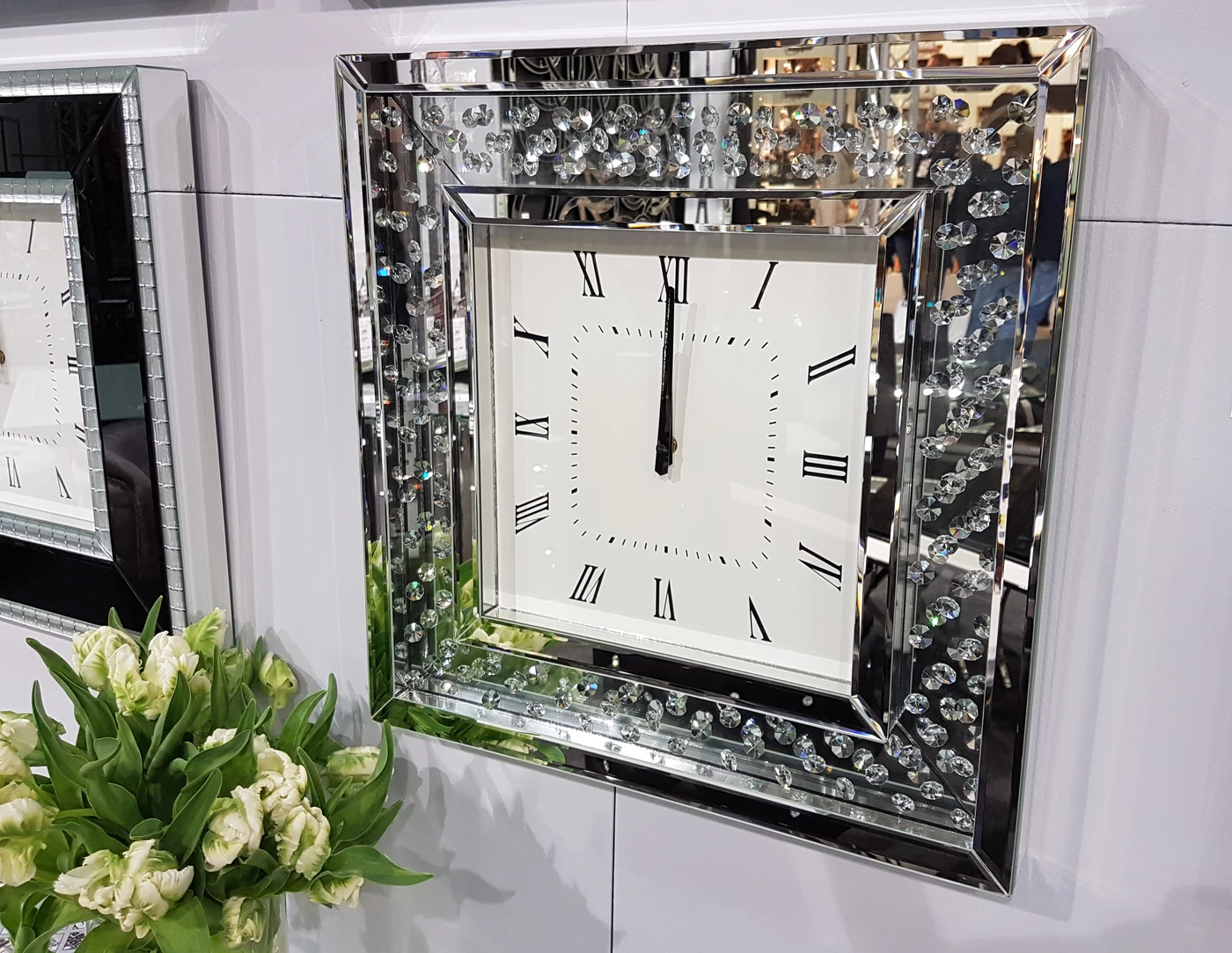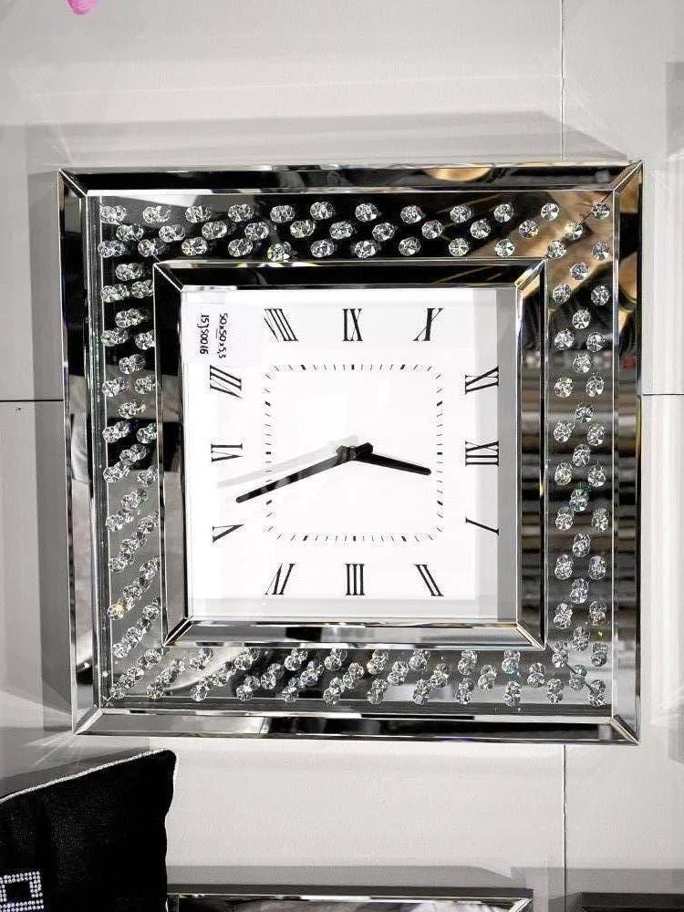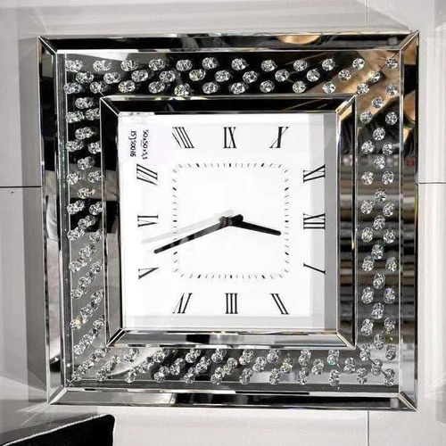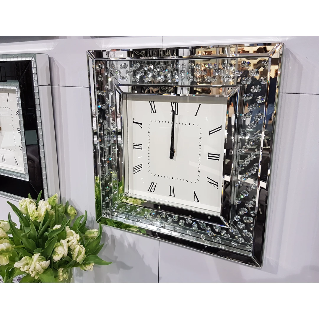 Laikrodžio korpusas pagamintas iš MDF ir dekoruotas facetuotais veidrodiniais bei stikliniais elementais.