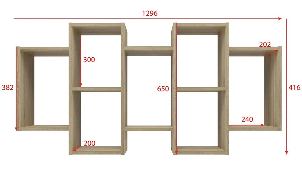 Pakabinama atvira lentyna;Tinka įvairiems daiktams sudėti;Lentyna pagaminta iš laminuotos medžio drožlių plokštės (MDP);Lentynos išmatavimai: plotis – 129,5 cm, aukštis – 65 cm, gylis – 20 cm;Lentynos spalva: ąžuolo (sonoma);