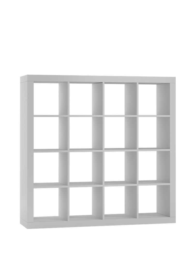 pastatoma, atvira lentyna su 16 atvirų skyrių;lentyna pagaminta iš laminuotos medžio drožlių plokštės (MDP) su PVC kraštų apdaila;lentynos išmatavimai: plotis - 147 cm, gylis - 38cm, aukštis - 147 cm;vieno skyriaus išmatavimai: plotis - 33 cm, gylis - 37,5 cm, aukštis - 33 cm;lentynos spalva: balta;tvirta ir stabili konstrukcija;