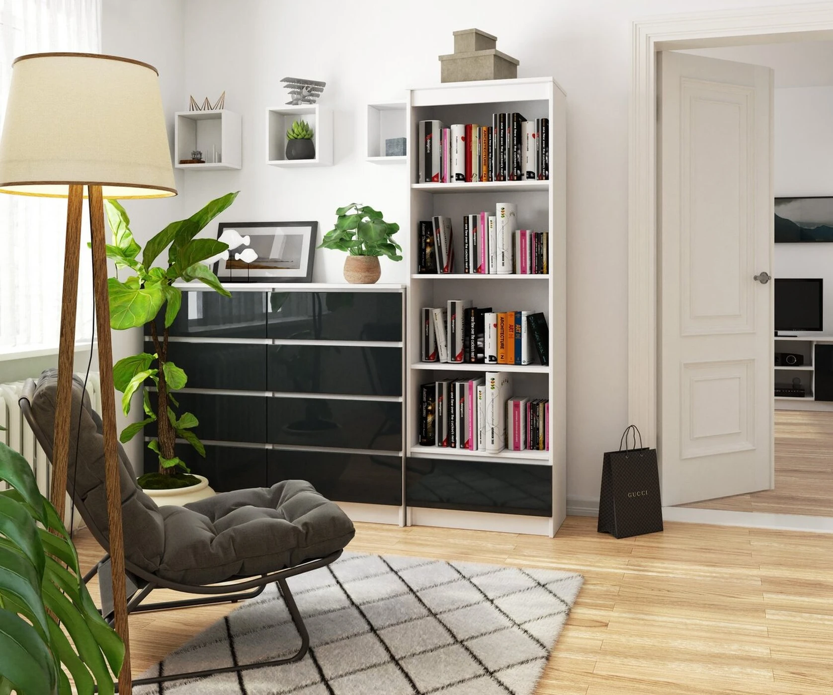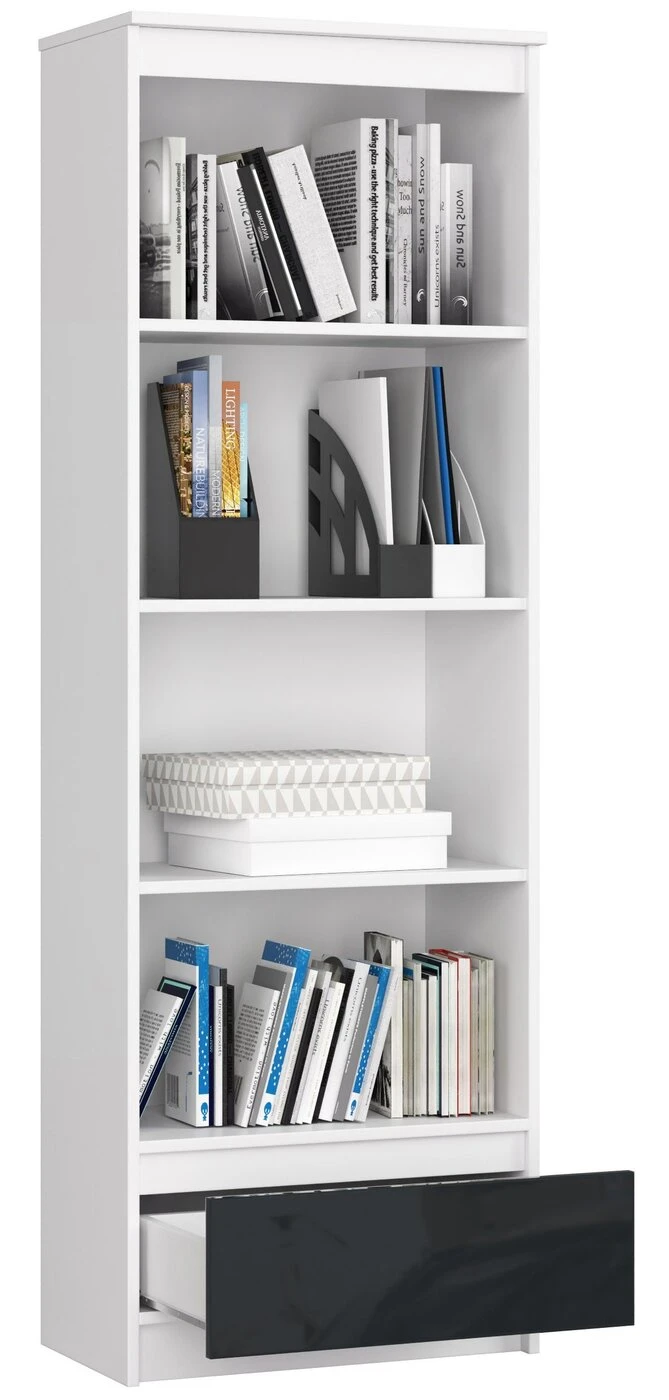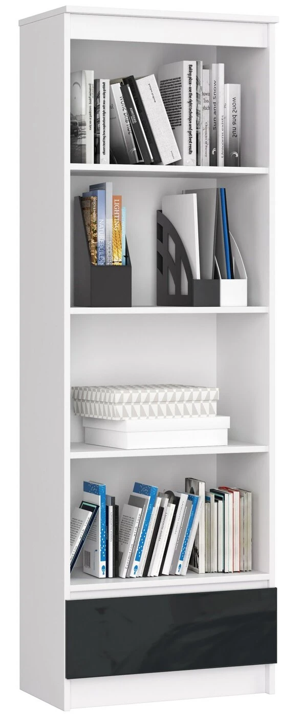 Aprašymas buvo automatiškai išverstas, gali pasitaikyti klaidų. Funkcinis dydis ir gerai suplanuota struktūra pasižymi,, baltos spalvos spalvos knygų spinta su stalčiu apačioje su grafito priekiu ir keturiomis lentynomis knygoms ar dokumentams. Madingas, minimalistinis, baltos spalvos ir grafito derinys, pagamintas iš blizgių laminuotų lentų, leidžia knygų spinta puikiai papildyti biuro įrangą ar privačiose erdvėse. Kronospan laminuota plokštė su padidintu atsparumu dilimui, taip pat briaunos padengtos ABS briauna, apsaugančia nuo pažeidimų, garantuoja, kad baldai bus patvarūs ir nebus greitai sugadinti net intensyviai naudojant. Skirtinguose aukščiuose montuojamos lentynos leidžia laikyti įvairaus, net neįprasto formato knygas ir dokumentaciją. Klasikinio dizaino knygų spinta su stalčiumi ir lentynomis leidžia ją priderinti prie interjero, dekoruoto labai įvairiais stiliais: nuo modernaus interjero, įkvėpto skandinaviško dizaino, iki labiau klasikinių kambarių. - Knygų spinta iš 16 mm Kronospan laminuotos plokštės, atsparios dilimui - Fasadai iš akrilu dengtos mdf plokštės - aukščiausias blizgumo standartas rinkoje. - Lentynos gali būti surinktos pagal jų konfigūraciją, 3 tvirtinimo angos lentynos aukštyje - Stalčius juda ant metalinių ritinėlių kreiptuvų su ištraukiamu fiksatoriumi - Kraštai padengti ABS briauna, užtikrinančia aukštą apsaugą nuo pažeidimų - Savarankiškas surinkimas knygų lentyna - Pateikiamas vadovas - 24 mėnesių garantija