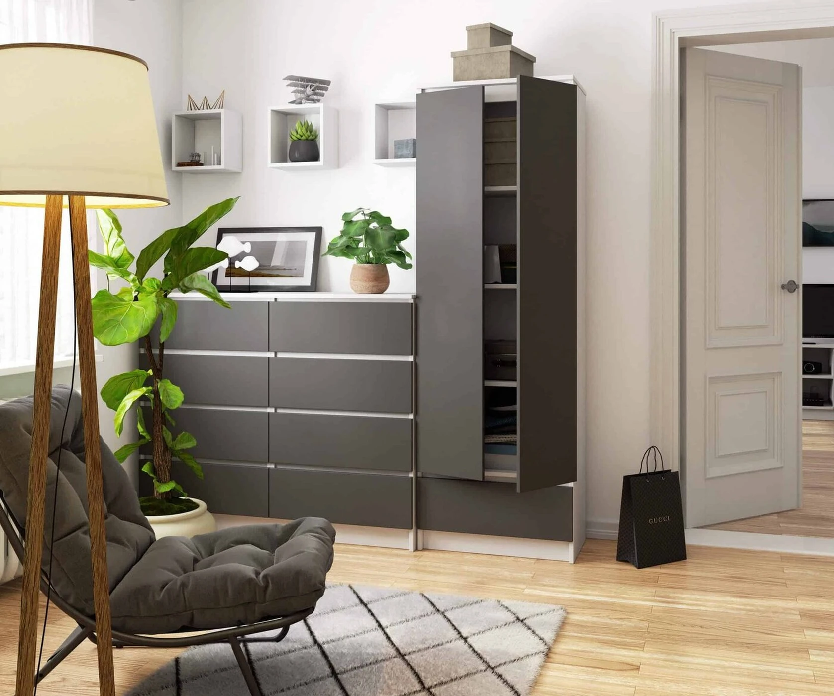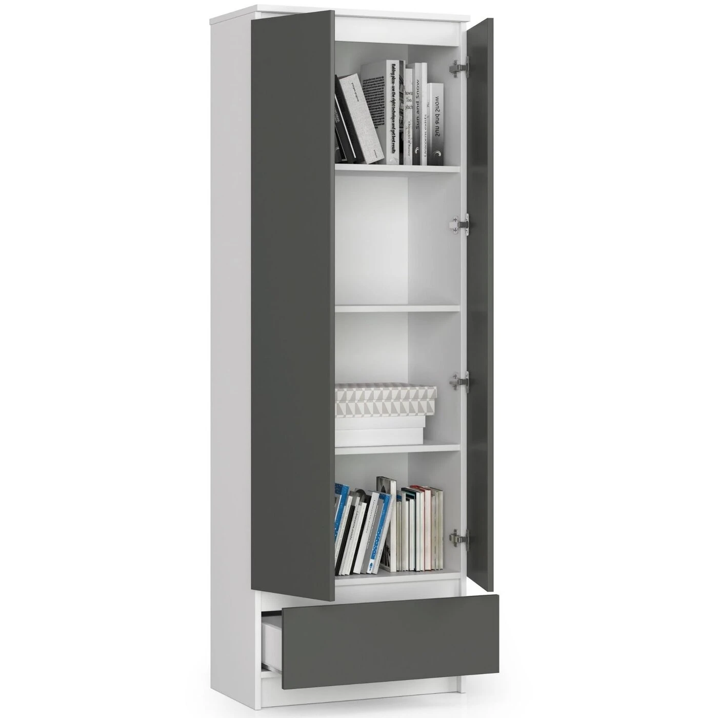 Aprašymas buvo automatiškai išverstas, gali pasitaikyti klaidų. Biuro knygų spintoje CLP 1 įrengta erdvi 180 cm aukščio ir 60 cm pločio drabužių spinta. Balduose yra varstomos durys, už kurių yra 4 erdvios lentynos. Juos galima laisvai konfigūruoti, nes turi 3 tvirtinimo angas. Papildomas patogumas – erdvus stalčius, besisukantis ant modernių, praktiškų ritinėlių kreiptuvų. Stalčius turi ištraukiamą užraktą. Baldų fasadai pagaminti elegantiškos grafito pilkos spalvos, o korpusas,, baltos spalvos spalvoss. Medžiagos: laminuota plokštė ABS fanera matinė apdaila CLP 1 biuro lentynos puikiai tinka moderniems biurams įrengti. Lentynose galima sutalpinti segtuvus ir aplankus su dokumentais, archyvavimo dėžutes ar spausdintuvo popierių. Stalčiuje galima sutalpinti atsarginius štampus, sąvaržėles, sąskaitų blankus ir kitus biuro reikmenis. Knygų spinta puikiai tiks ir darbo kambariui namuose, jaunimo kambariui bei svetainei. Baldai yra funkcionalūs, atsparūs mechaniniams pažeidimams ir atrodo labai estetiškai.