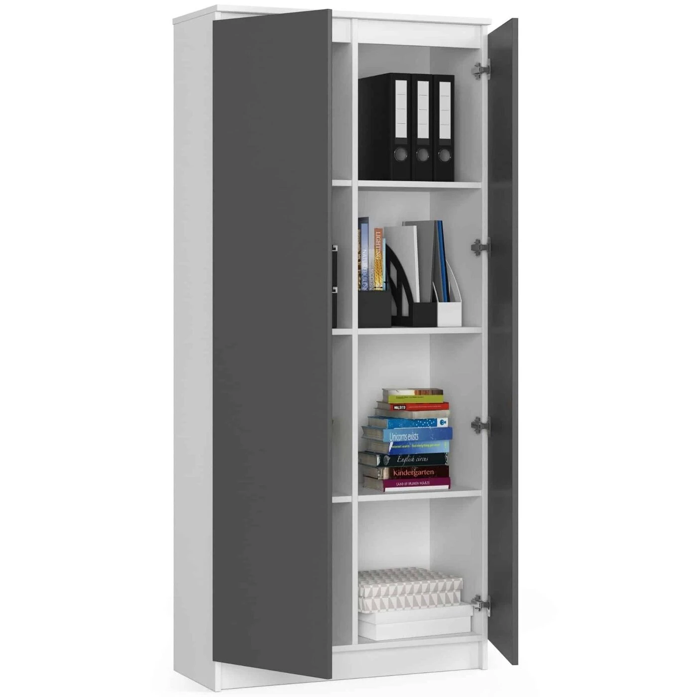 Aprašymas buvo automatiškai išverstas, gali pasitaikyti klaidų. Biuro knygų spinta R 80 cm CLP versijoje su dvejomis durelėmis yra spalvota su baltomis sienomis ir vidinėmis lentynomis bei durimis grafito pilkos spalvos. Knygų spinta turi labai universalų charakterį, todėl tinka ne tik gyvenamuosiuose ar miegamuosiuose kambariuose, bet ir patalpose, pavyzdžiui, biuruose. Šio tipo spintelės yra idealus sprendimas knygoms, dokumentams ir kitiems reguliariai naudojamiems gaminiams laikyti. Spinta labai patogi naudoti ir derinama su kitais, tamsiai rudos spalvos spalvos interjero dizaino elementais. Pagrindiniai CLP biuro lentynų parametrai yra šie: - aukšta kokybė, nes naudojama 16 mm pločio laminuota plokštė, atspari trinčiai (Kronospan medžiagos) ir kraštai padengti ABS briauna, - 8 lentynos, pasižyminčios dideliu atsparumu sunkiam spintelių turiniui, - savaime surenkamos ant komplektuojamų elementų, - matmenys: plotis 80 cm, aukštis 180 cm, ilgis 35 cm, - matinės varstomos durys, - svoris: 60 kg, - tvirtos kojelės, skirtos stabiliam stovo montavimui ant įvairių paviršių.
