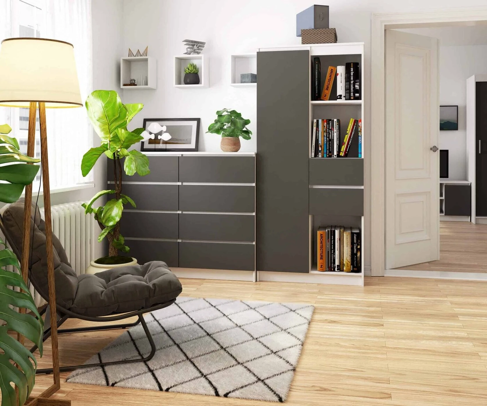 Aprašymas buvo automatiškai išverstas, gali pasitaikyti klaidų. - Knygų spinta iš 16 mm laminuotos plokštės Kronospan, atsparios dilimui - Knygų spintoje iš viso yra 6 lentynos - Stalčiai juda ant metalinių ritinėlių kreiptuvų su ištraukiamu užraktu - Kraštai padengti ABS briauna aukšta apsauga nuo pažeidimų - Knygų spinta siunčiama pakuotėse, kad būtų galima surinkti savarankiškai - Pristatoma rankiniu būdu - 24 mėnesių garantija