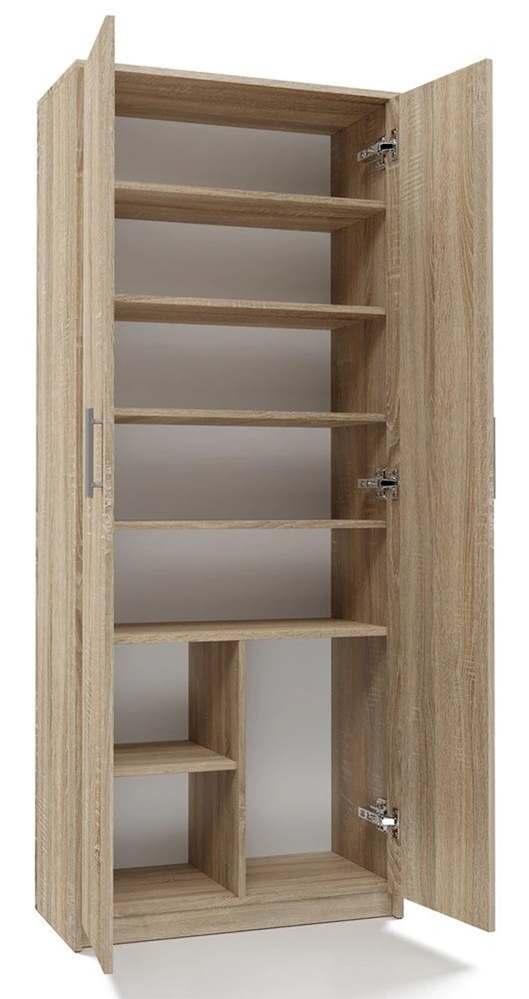 pastatoma, 2-ų durų lentyna;lentyna pagaminta iš 16 mm storio laminuotos medžio drožlių plokštės su ABS kraštų apdaila;lentynos išmatavimai: plotis - 74 cm, gylis - 35 cm, aukštis - 180 cm;vidinis išplanavimas pavaizduotas 2-3,6 nuotraukose;lentynos spalva: korpusas - sonoma ąžuolo (matinė), fadasas - sonoma ąžuolo (matinė);įbrėžimams ir drėgmei atsparus paviršius;tvirta ir stabili konstrukcija;