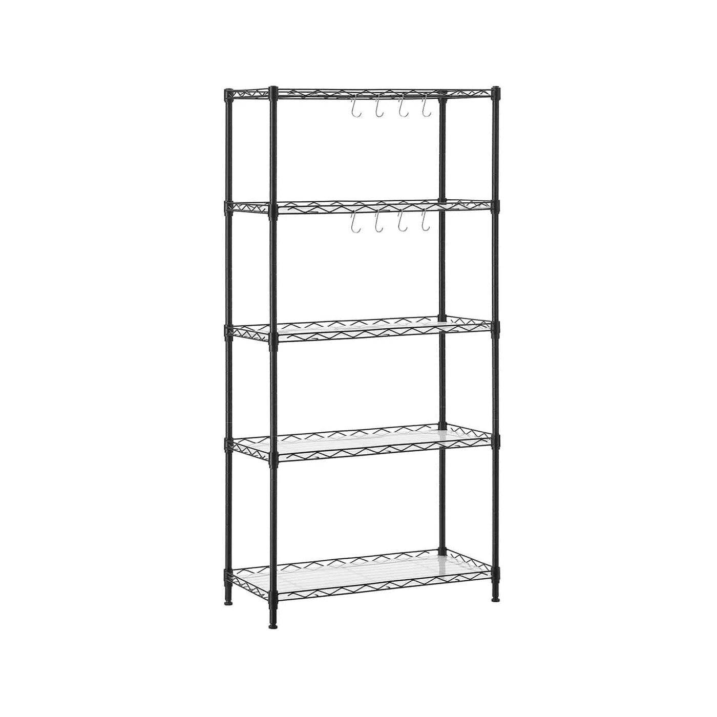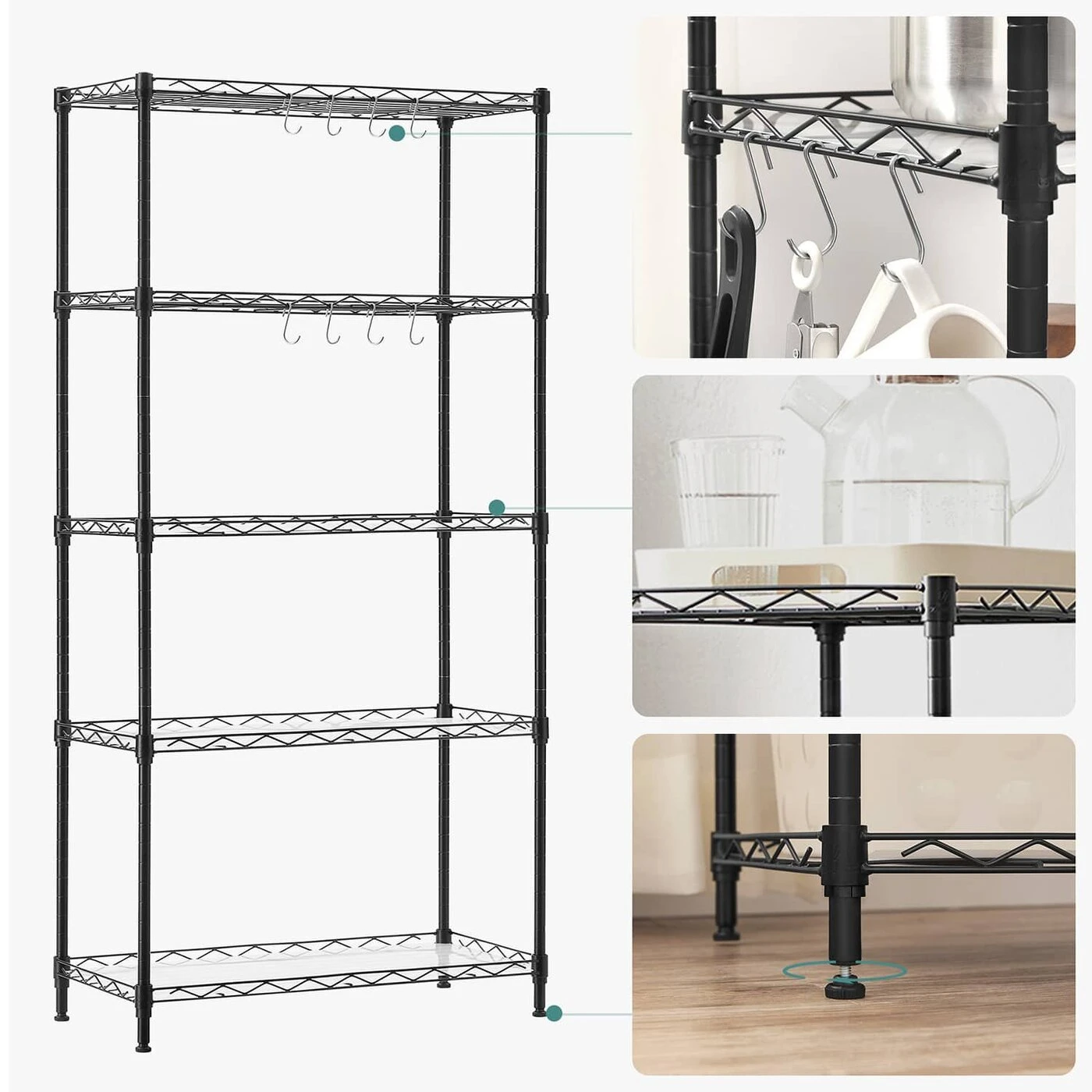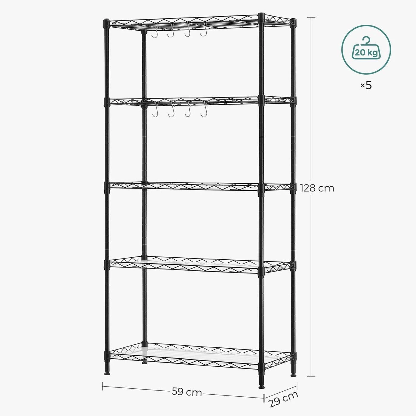 Aprašymas buvo automatiškai išverstas, gali pasitaikyti klaidų.Išsami informacija apie gaminį: - Spalva: juoda - Medžiaga: plienas - Dydis: 59 x 29 x 128 cm (P x P x A) - Svoris: 5 kg - Maksimali statinė apkrova vienam lentynos lygiui: 20 kg - Bendra didžiausia statinė apkrova : 100 kg :- 1 x virtuvės lentyna- 5 x PP lėkštės- 8 x S kabliukai- 1 x apsauga nuo posvyrio- 1 x instrukcijosSONGMICS Pastabos: Montuojant plastikinius spaustukus, rodyklė VIRŠUS visada turi būti nukreipta į viršų. Surinkę patikrinkite visus spaustukus ir įsitikinkite, kad jie nejuda. - Įsitikinkite, kad visi spaustukai tinkamai įsprausti į stovo vamzdžių įdubas, kad lentynos būtų lygiagrečios virtuvės stalui. - Pritvirtinkite gaminį apsaugančiais nuo apvirtimo ant sienos, kad būtų užtikrintas saugus naudojimas.