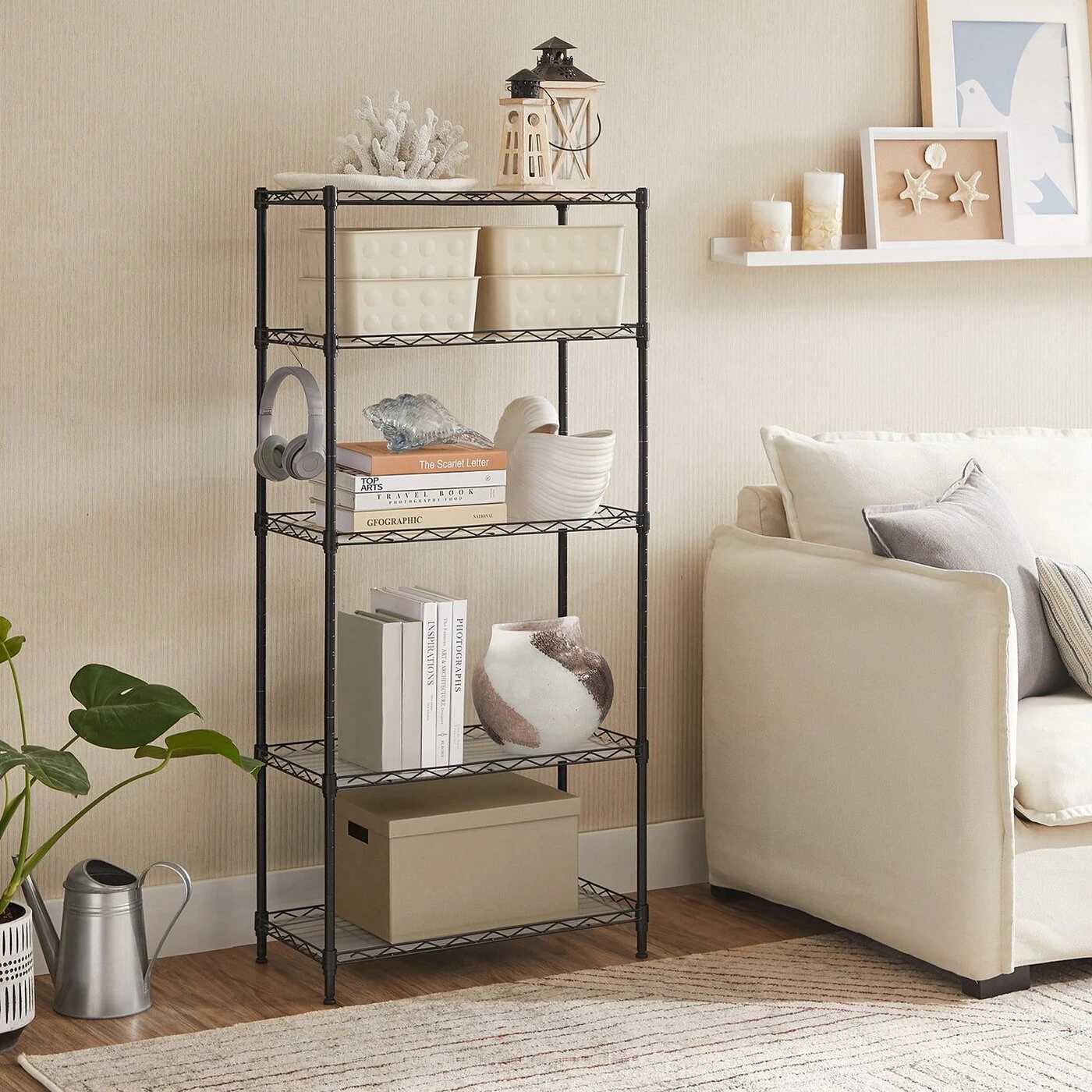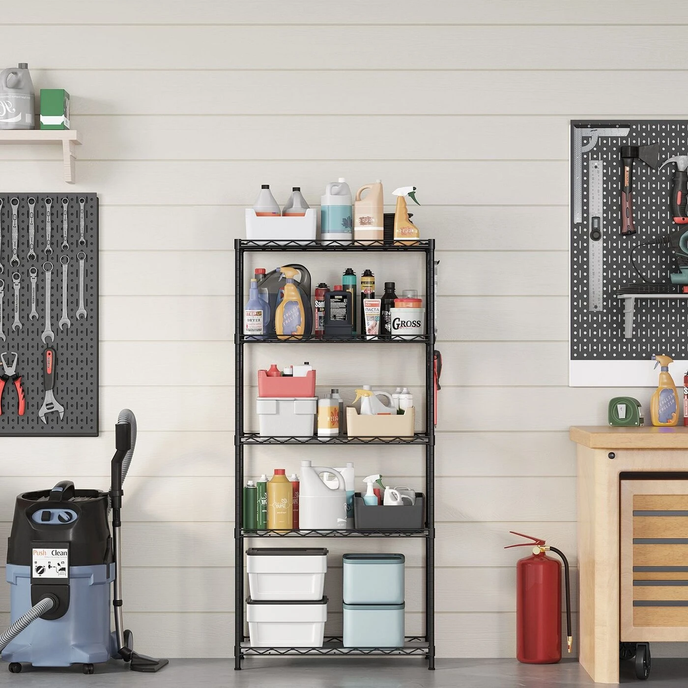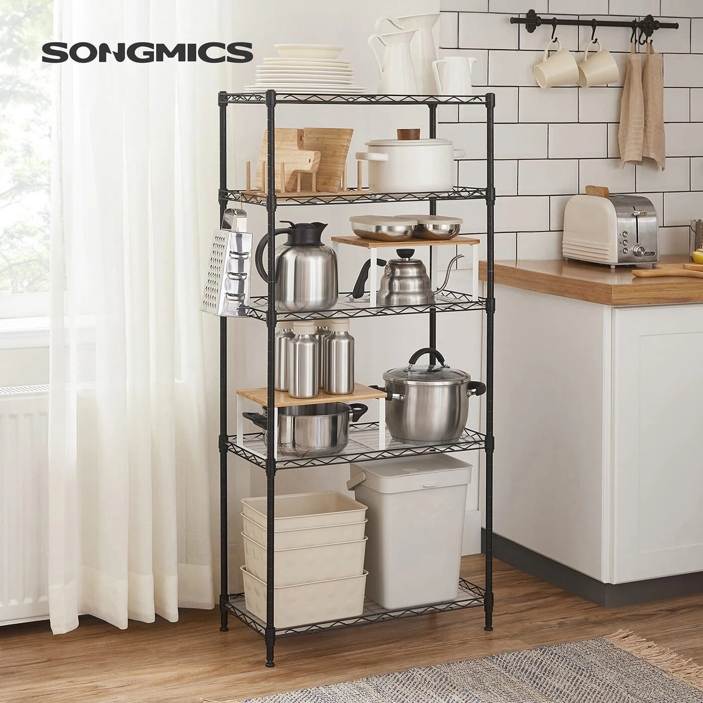 Aprašymas buvo automatiškai išverstas, gali pasitaikyti klaidų.Išsami informacija apie gaminį: - Spalva: juoda - Medžiaga: plienas - Dydis: 59 x 29 x 128 cm (P x P x A) - Svoris: 5 kg - Maksimali statinė apkrova vienam lentynos lygiui: 20 kg - Bendra didžiausia statinė apkrova : 100 kg :- 1 x virtuvės lentyna- 5 x PP lėkštės- 8 x S kabliukai- 1 x apsauga nuo posvyrio- 1 x instrukcijosSONGMICS Pastabos: Montuojant plastikinius spaustukus, rodyklė VIRŠUS visada turi būti nukreipta į viršų. Surinkę patikrinkite visus spaustukus ir įsitikinkite, kad jie nejuda. - Įsitikinkite, kad visi spaustukai tinkamai įsprausti į stovo vamzdžių įdubas, kad lentynos būtų lygiagrečios virtuvės stalui. - Pritvirtinkite gaminį apsaugančiais nuo apvirtimo ant sienos, kad būtų užtikrintas saugus naudojimas.