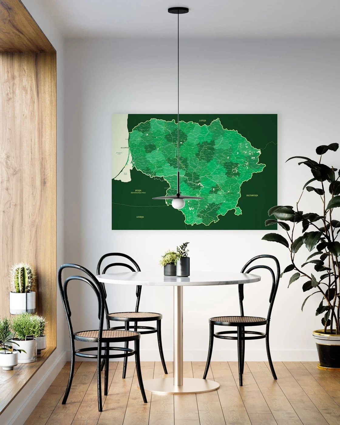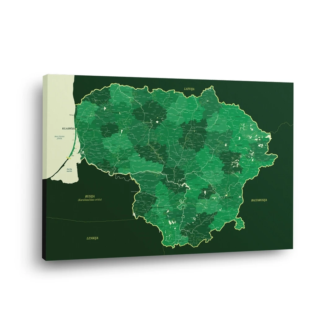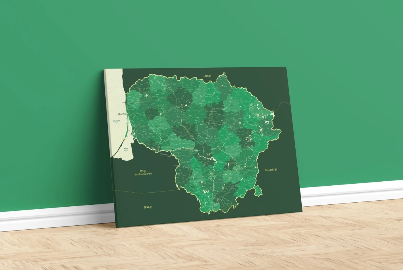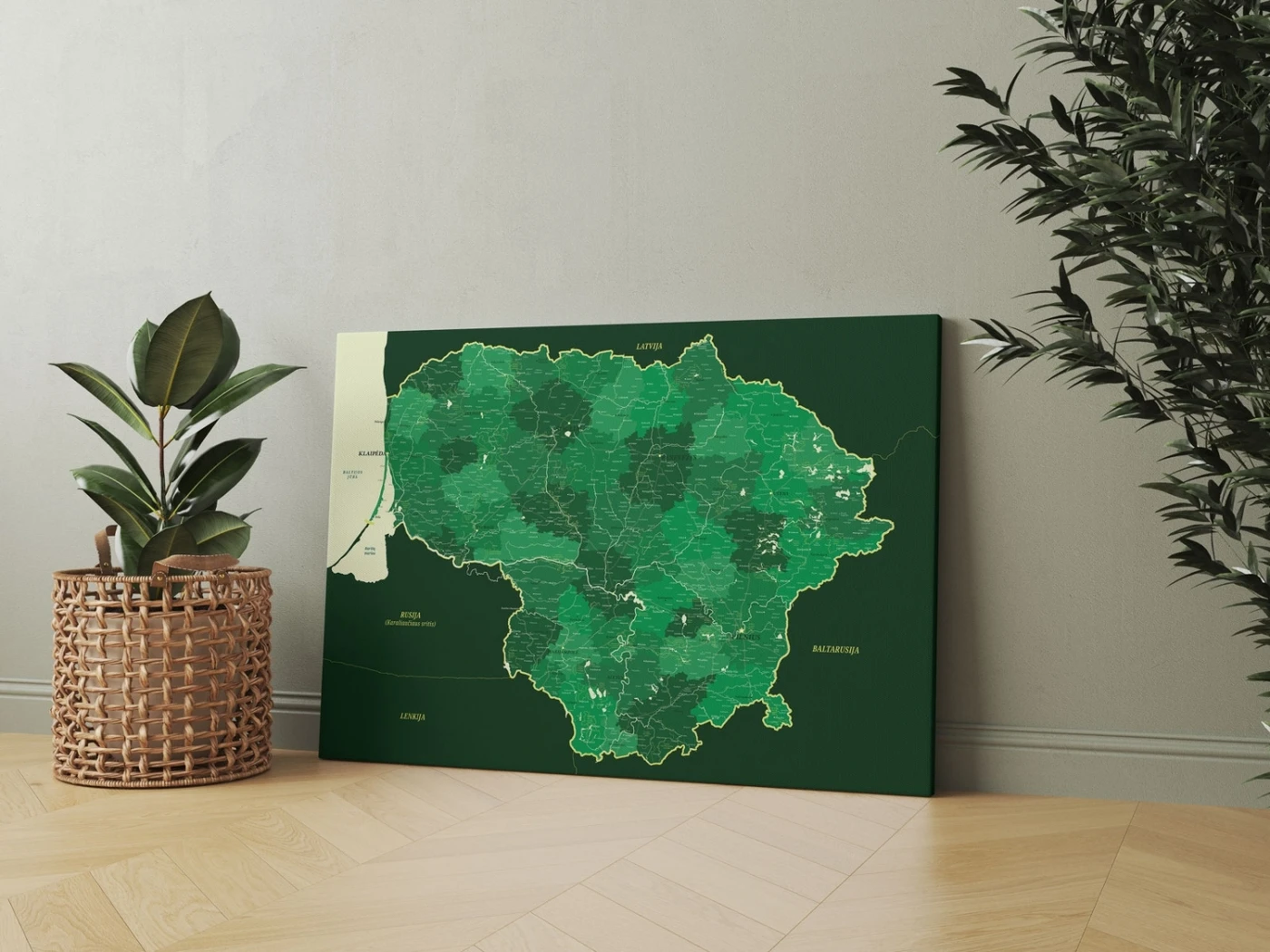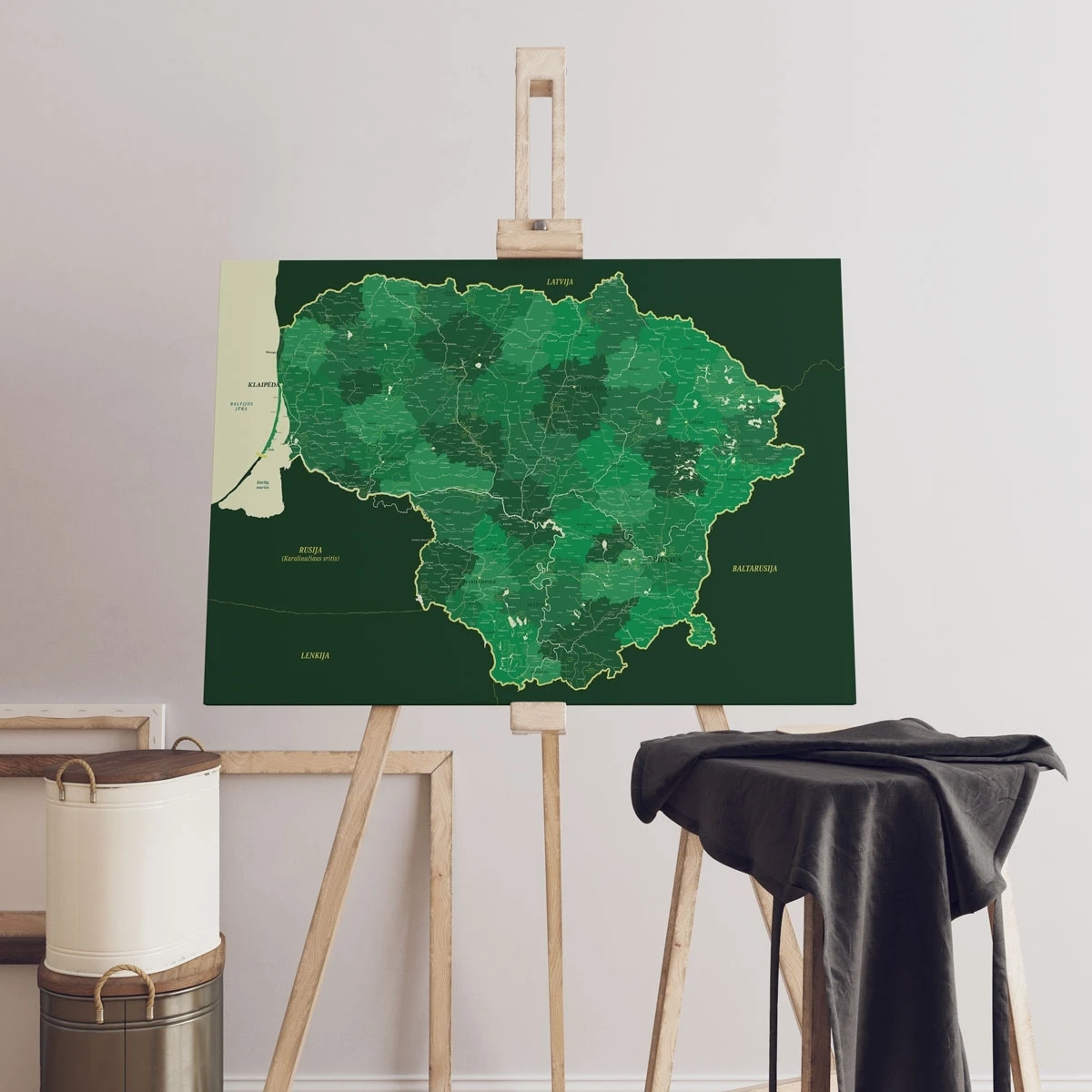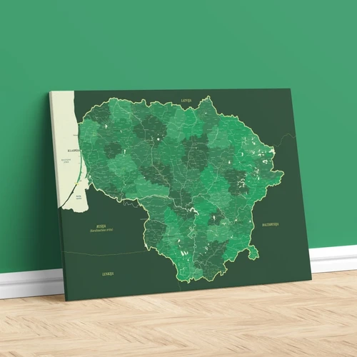 XL 150×100 cm – 199 € L 120×80 cm – 159 € M 100×70 cm – 119 € S 85×60 cm – 99 € MEDŽIAGOS Žemėlapis išliks ryškus ir puikios išvaizdos daugybę metų, nes jam pagaminti naudojamos aukščiausios kokybės medžiagos. Išspausdintas vaizdas yra padengiamas vandens pagrindo rūgščių neturinčiu apsauginiu laku, kuris atitinka muziejuose saugomų eksponatų reikalavimus - iki 80-100 metų spalvos išlieka nepakitusios. Kiekvienas žemėlapis yra kruopščiai pagamintas Lietuvoje profesionalių MyPoint meistrų. Smulkios tekstūros ir tvirta 310g/m² drobė Coala,Aukštos raiškos Mutoh spausdintuvas, užtikrinantis aiškų skaitomumą (Japonija),Originalūs ir ilgaamžiai dažai, suteikiantys ryškias spalvas (Japonija),Nuo blukimo ir neigiamo aplinkos poveikio apsaugantis matinis spaudos lakas (Jungtinė Karalystė);Tvirtas natūralaus medžio porėmis užpildytas su putų plokšte – lengvai konstrukcijai ir patogiam smeigtukų naudojimui (Lietuva).