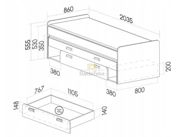 | Pritaikyta čiužiniui | 800 x 2000 mm |