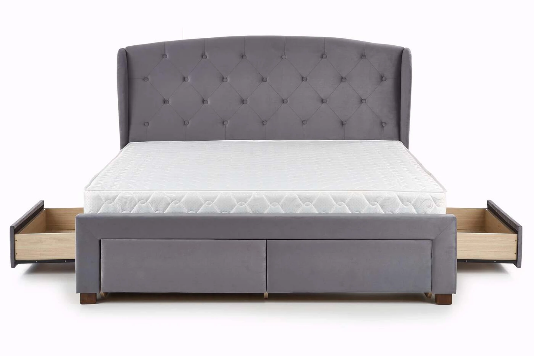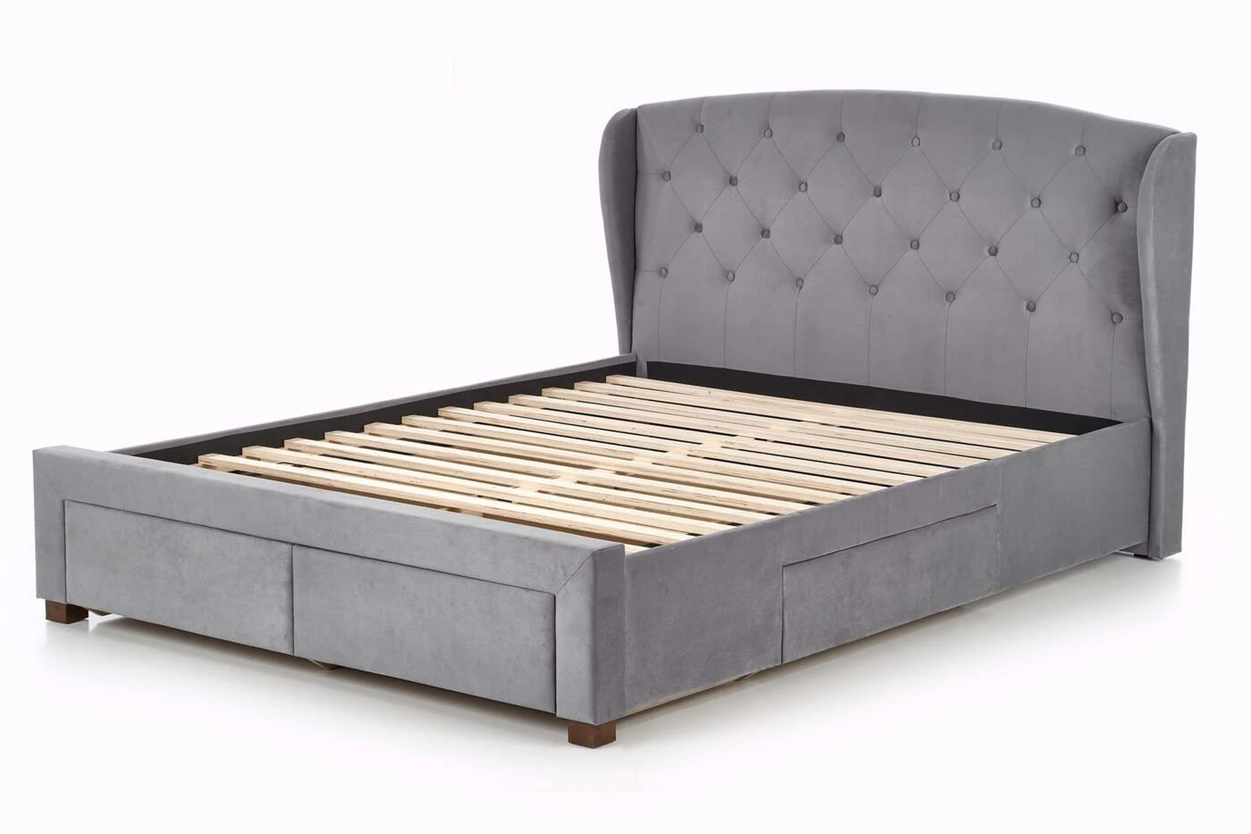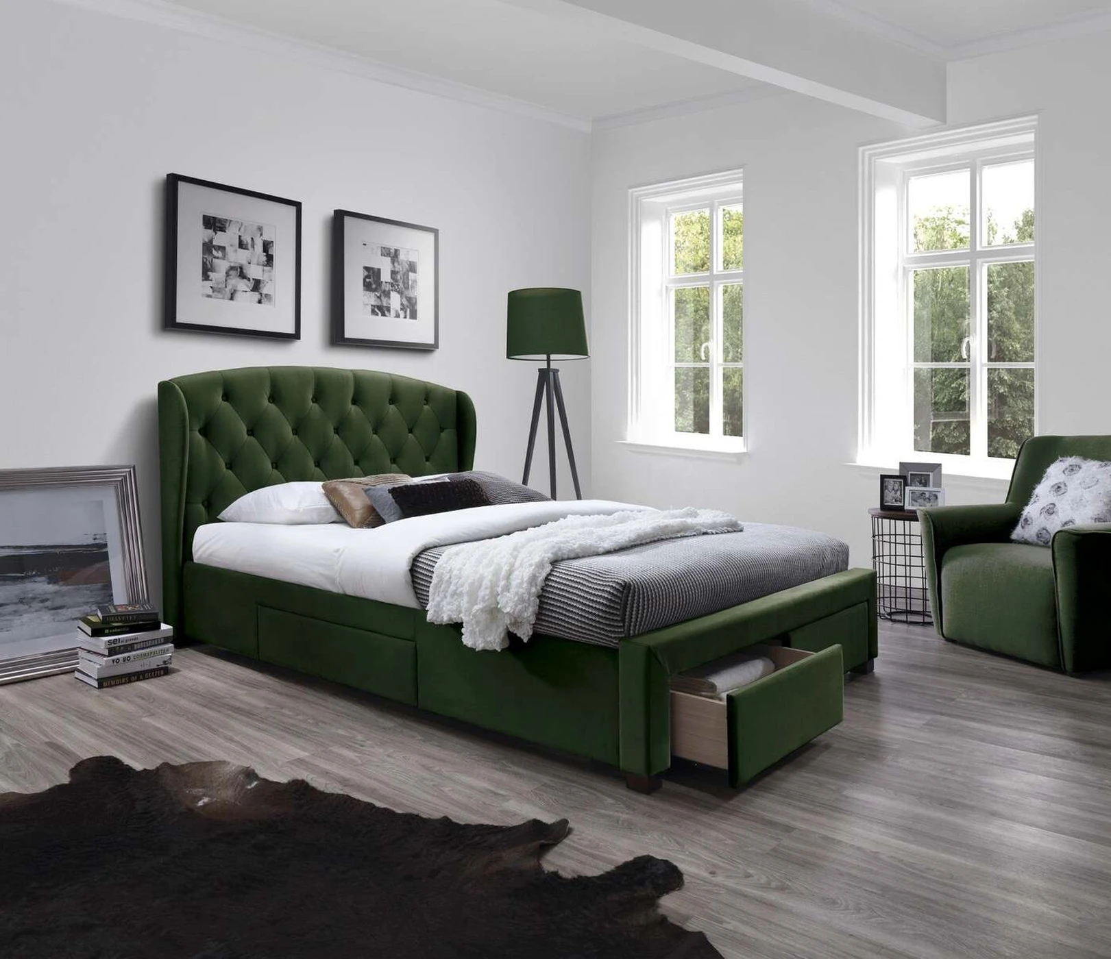matmenys: 171/218/111 cm, lova su stalčiais, medžiaga: audinys / medžio masyvas, spalva: audinys - tamsiai žalia, mediena - riešutmedžio