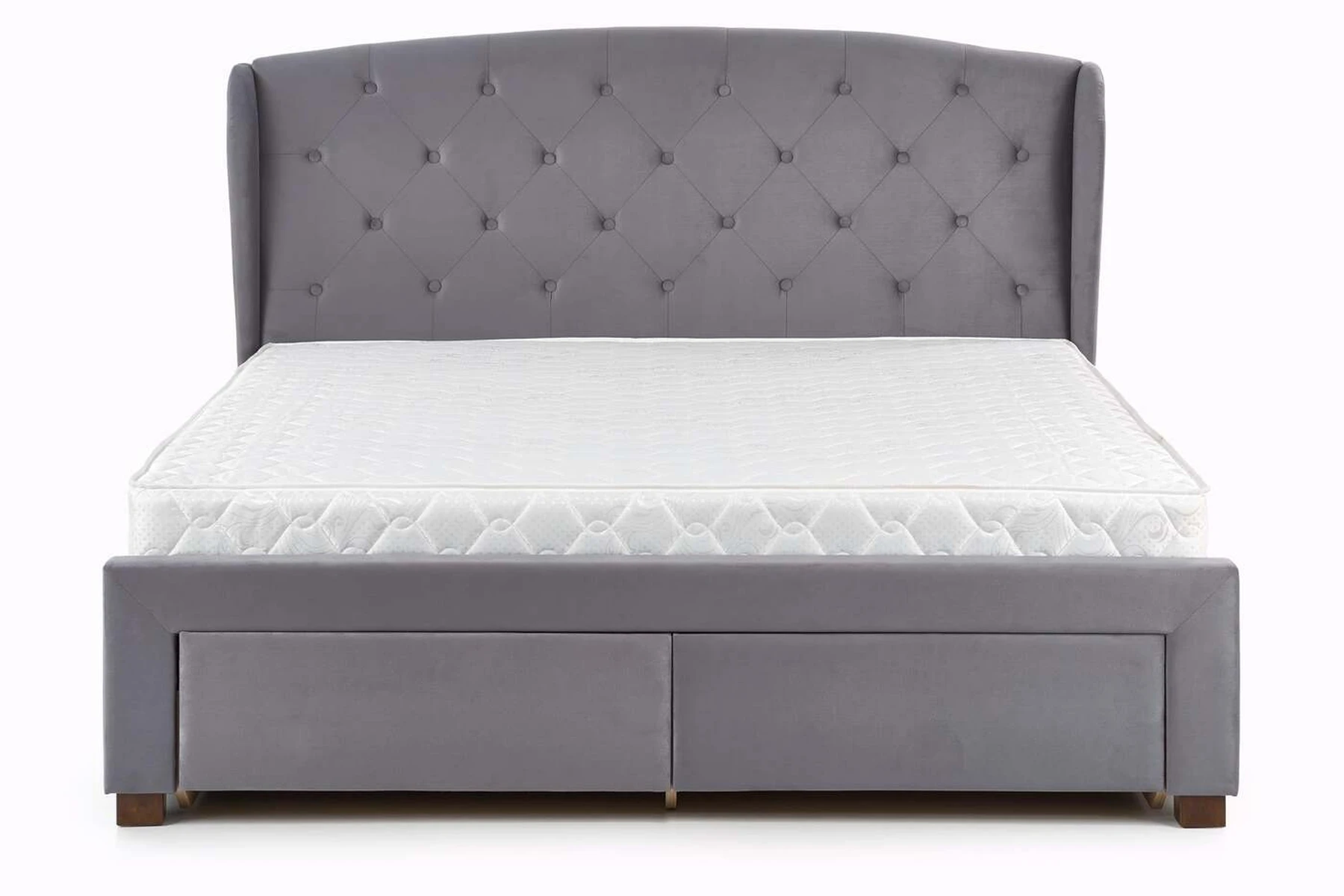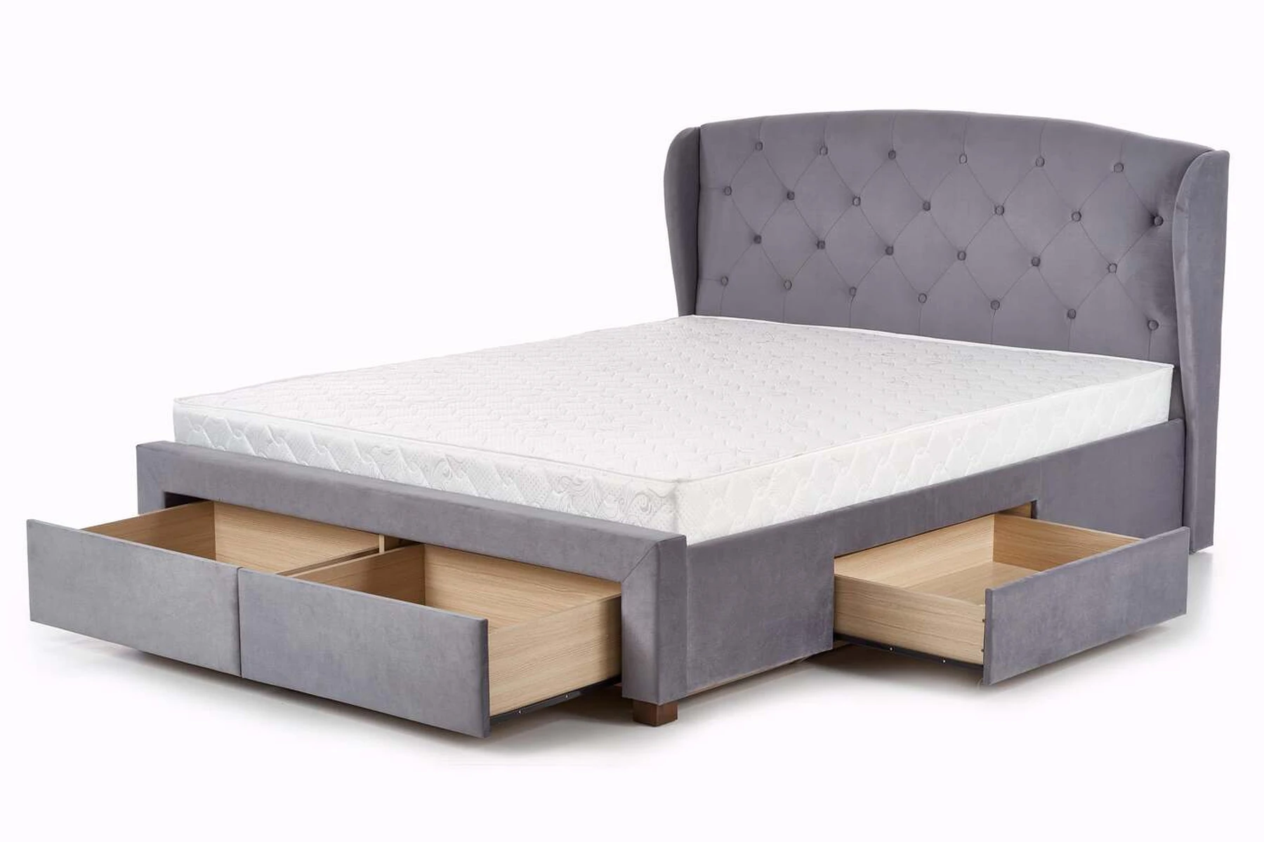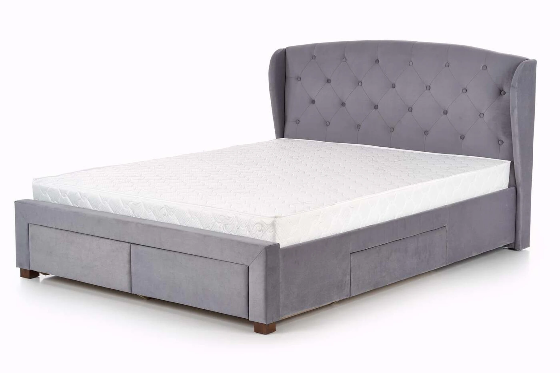 matmenys: 171/218/111 cm, lova su stalčiais, medžiaga: audinys / medžio masyvas, spalva: audinys - tamsiai žalia, mediena - riešutmedžio
