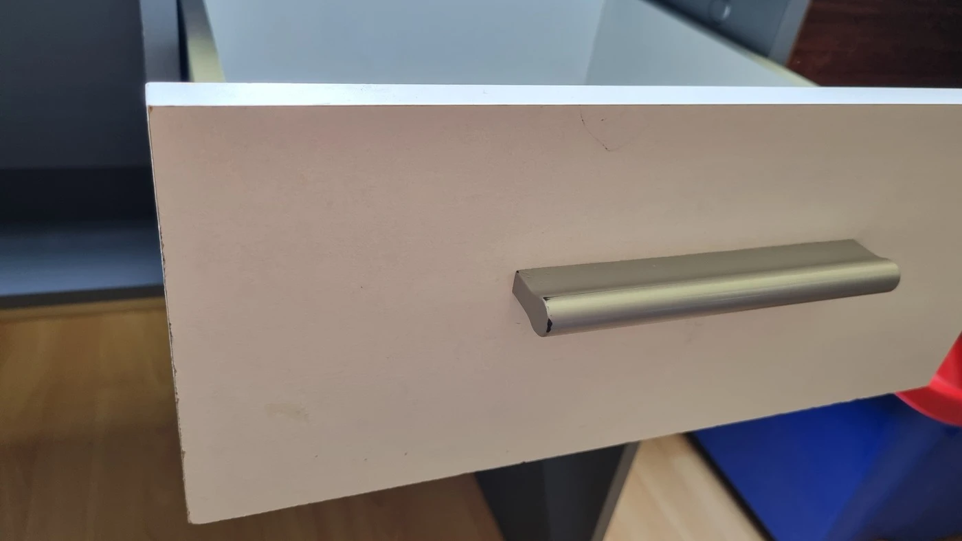 Stalo stačiaus defektas matosi nuotraukoje, bet vizualiai nekrenta į akis.